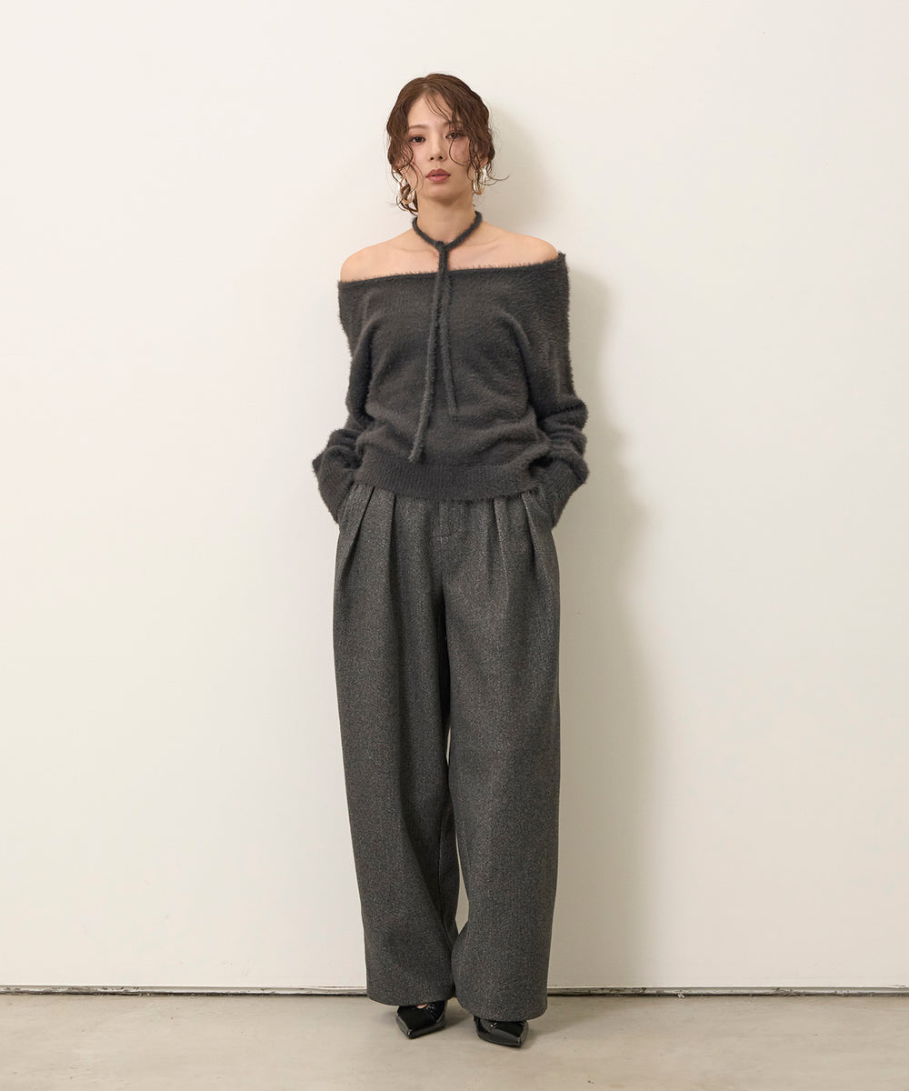 [SET]Choker Feather Round Knit+Wool Like Tuck Trousers