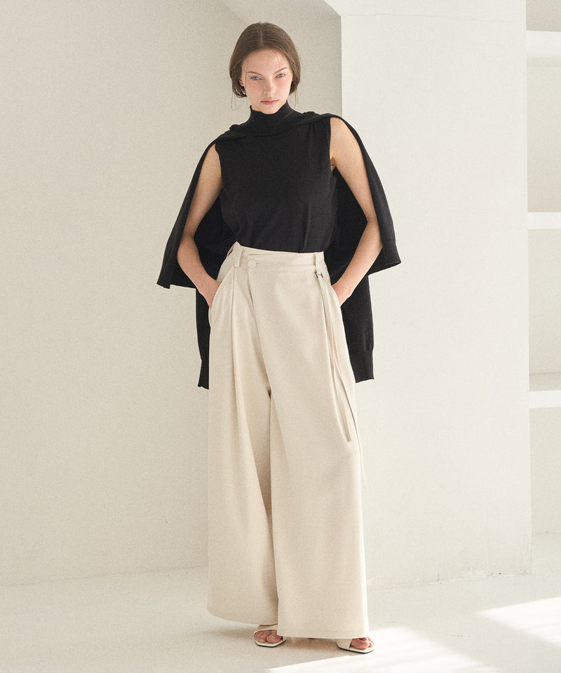 [SET]Bulky Feather Line P/O Knit+Satin Belt Highonz Tuck Slacks
