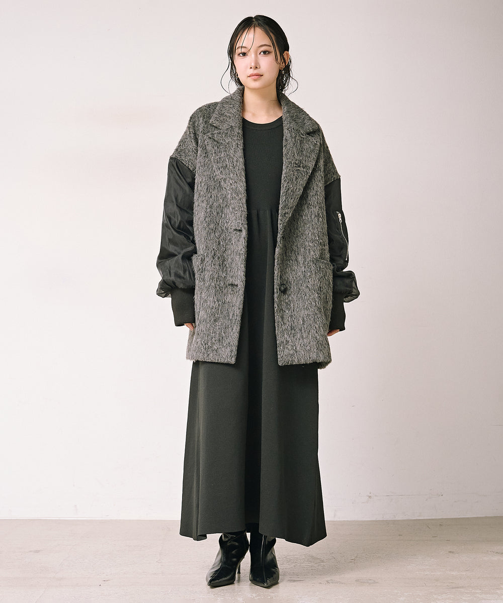 [SET]Doubles Mix Shaggy Coat+Tension Flare Knit Onepiece