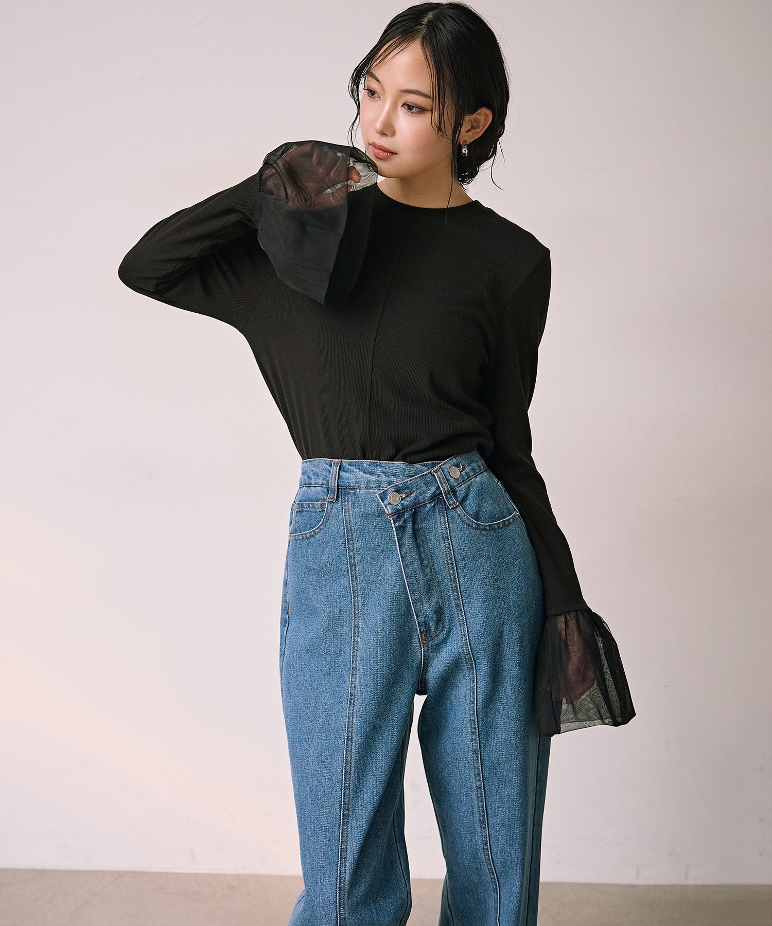 異素材を組み合わせた袖デザインが、さりげないポイントになるトップス。