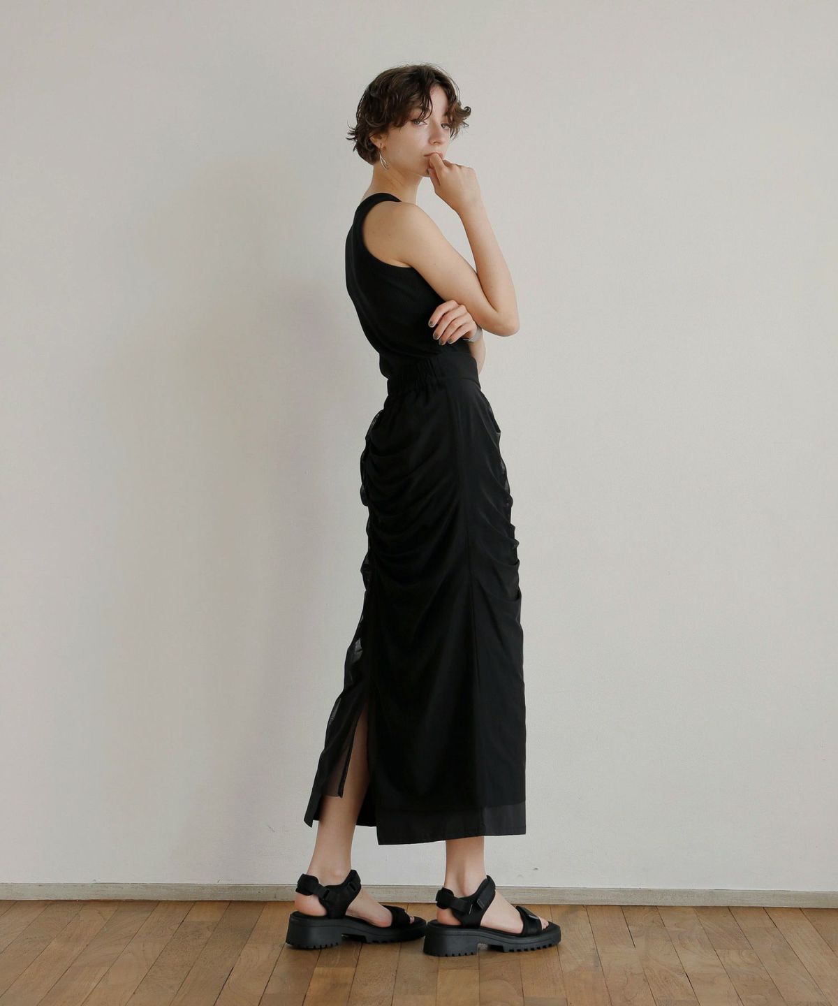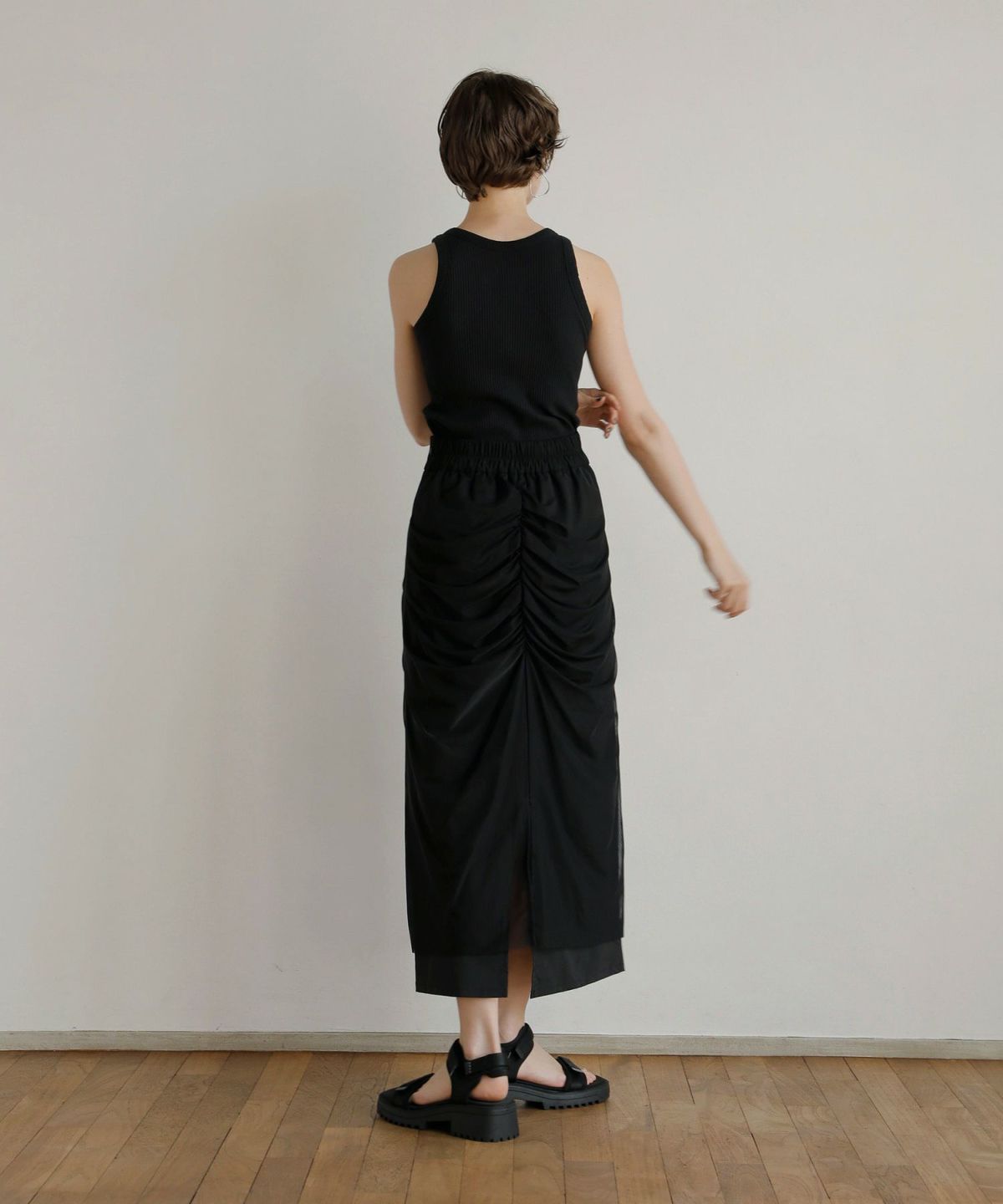 ストレッチの効いた2種類の素材をレイヤードしたデザインスカート。