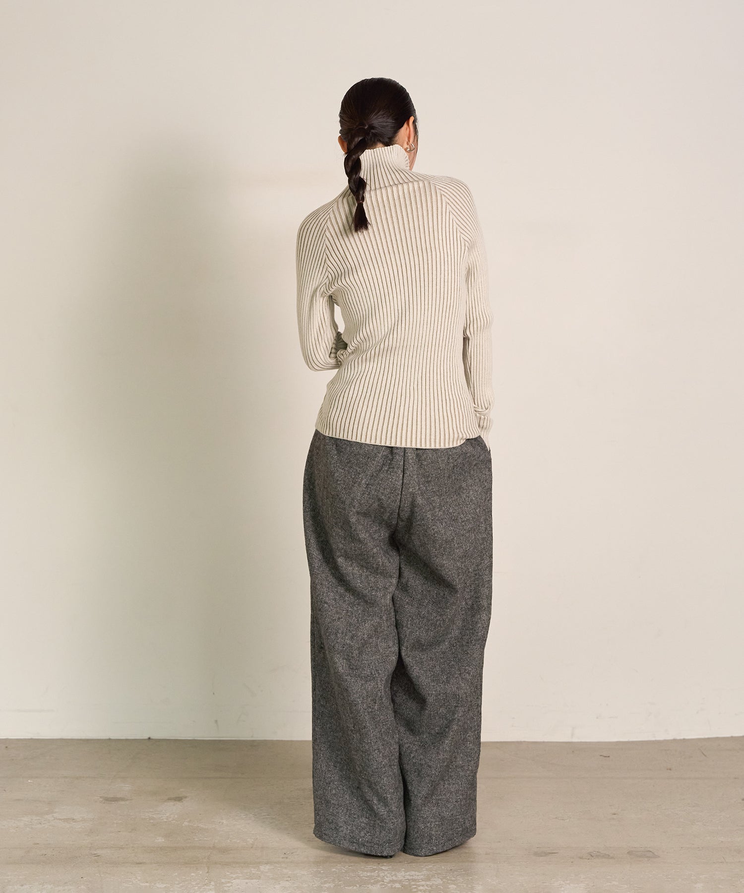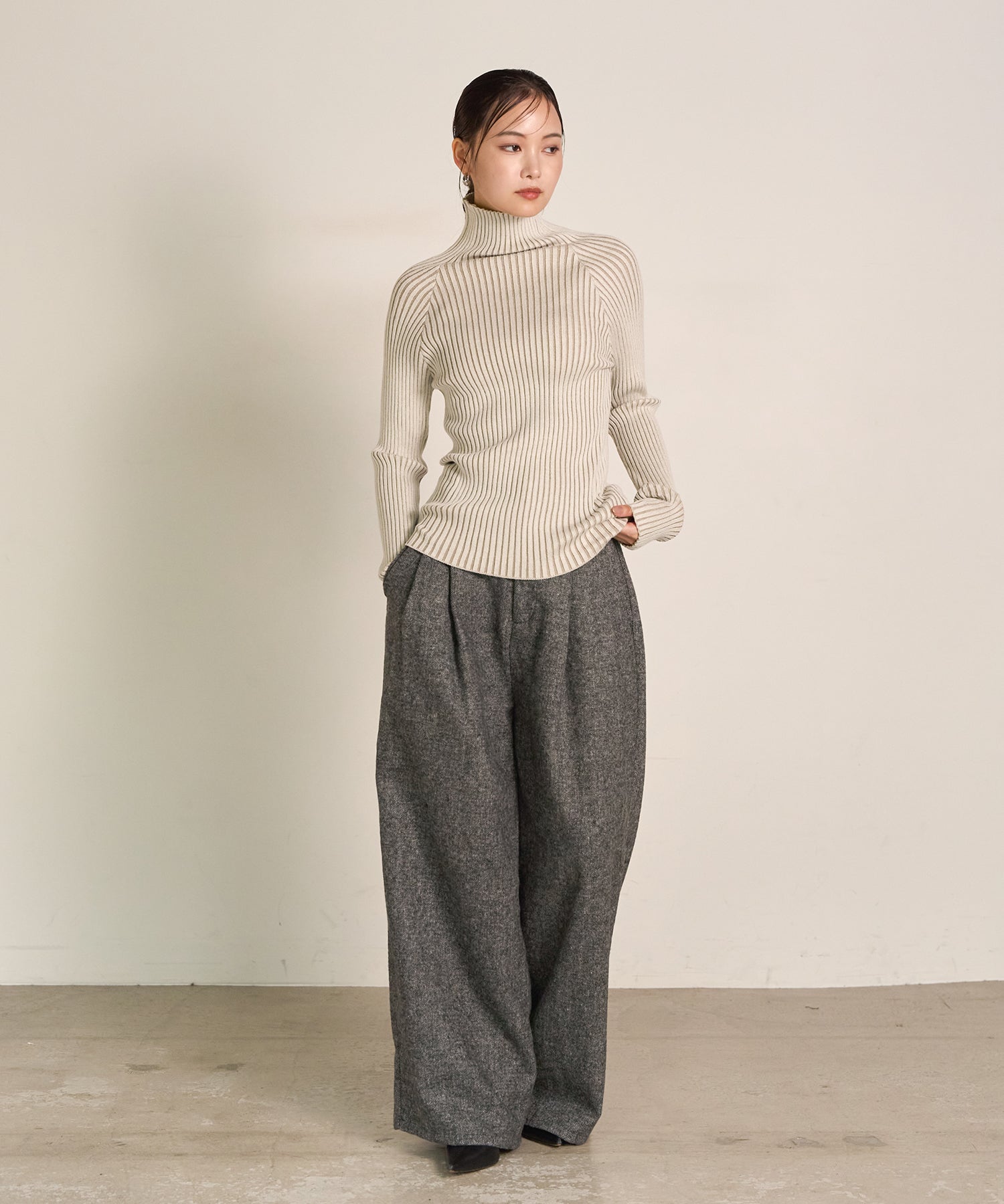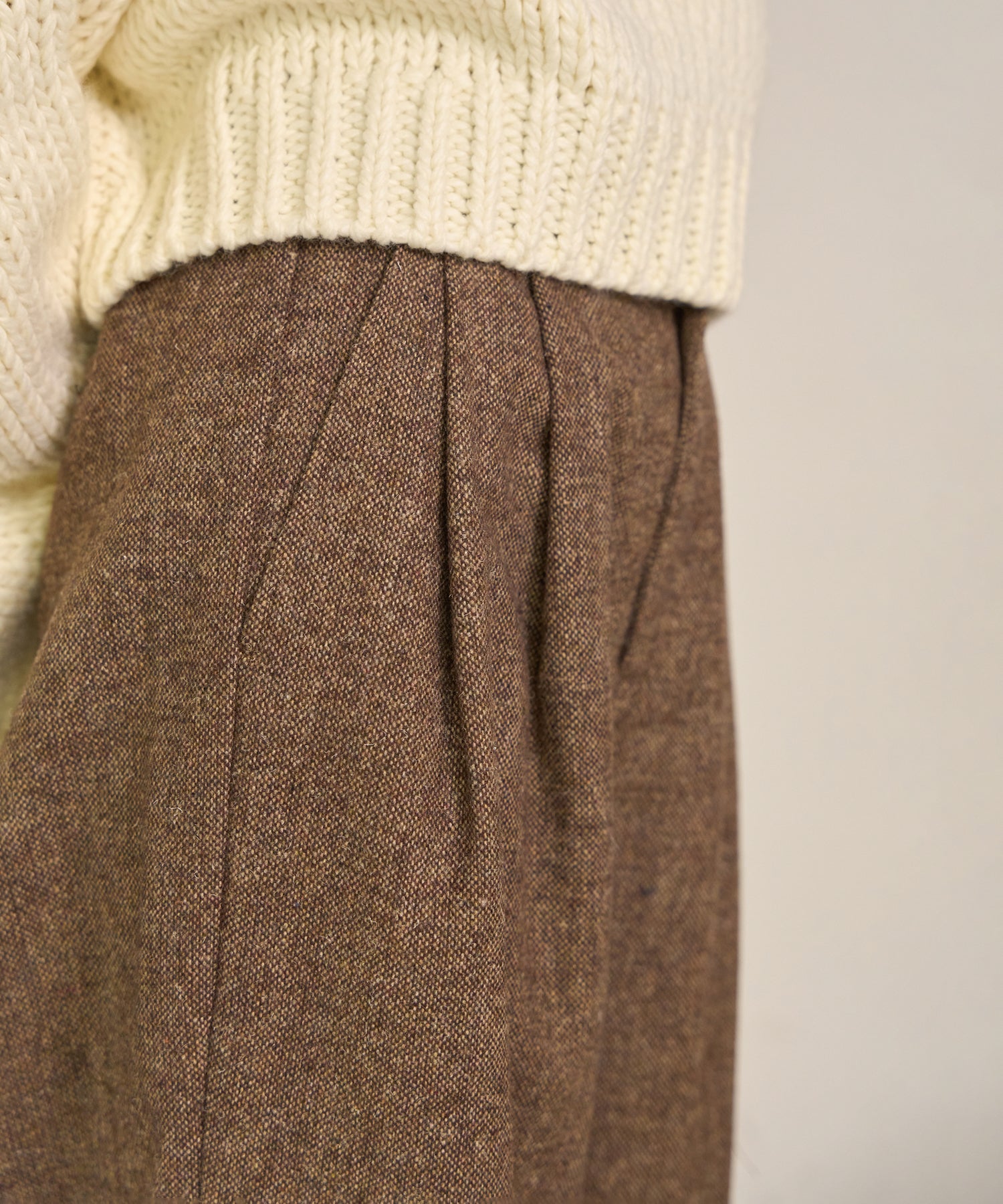 クラシカルな雰囲気漂うツイード素材のタックスラックス。