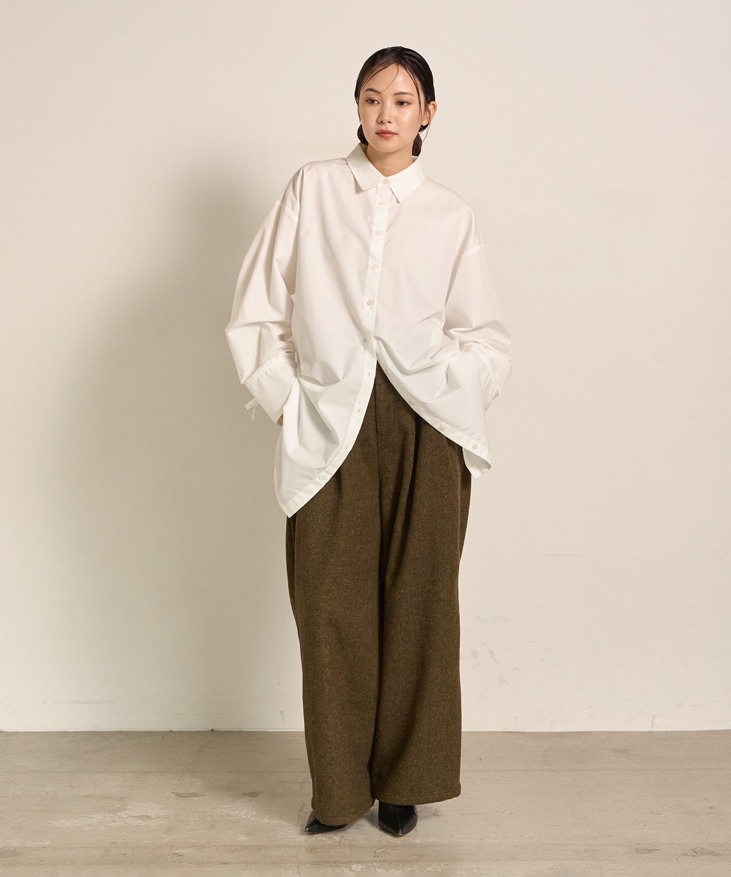フロントに施したタックが立体感を生み、リラックス感のあるワイドシルエットを演出します。