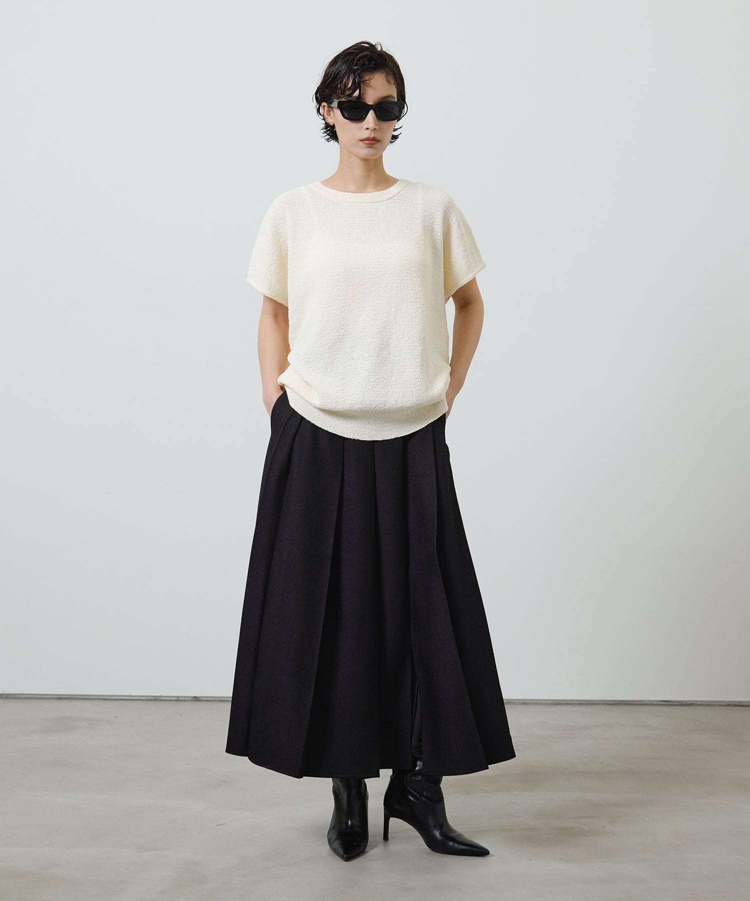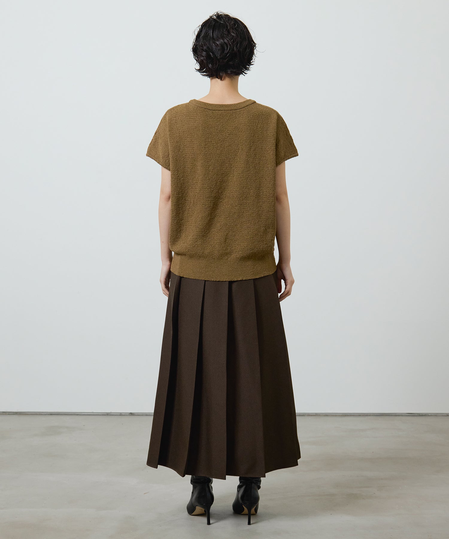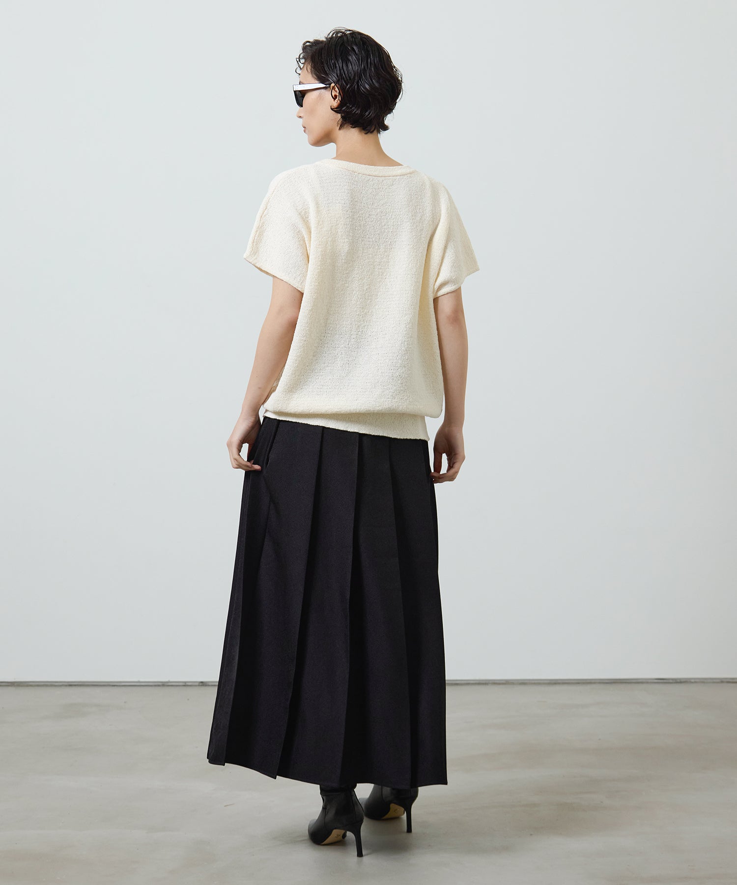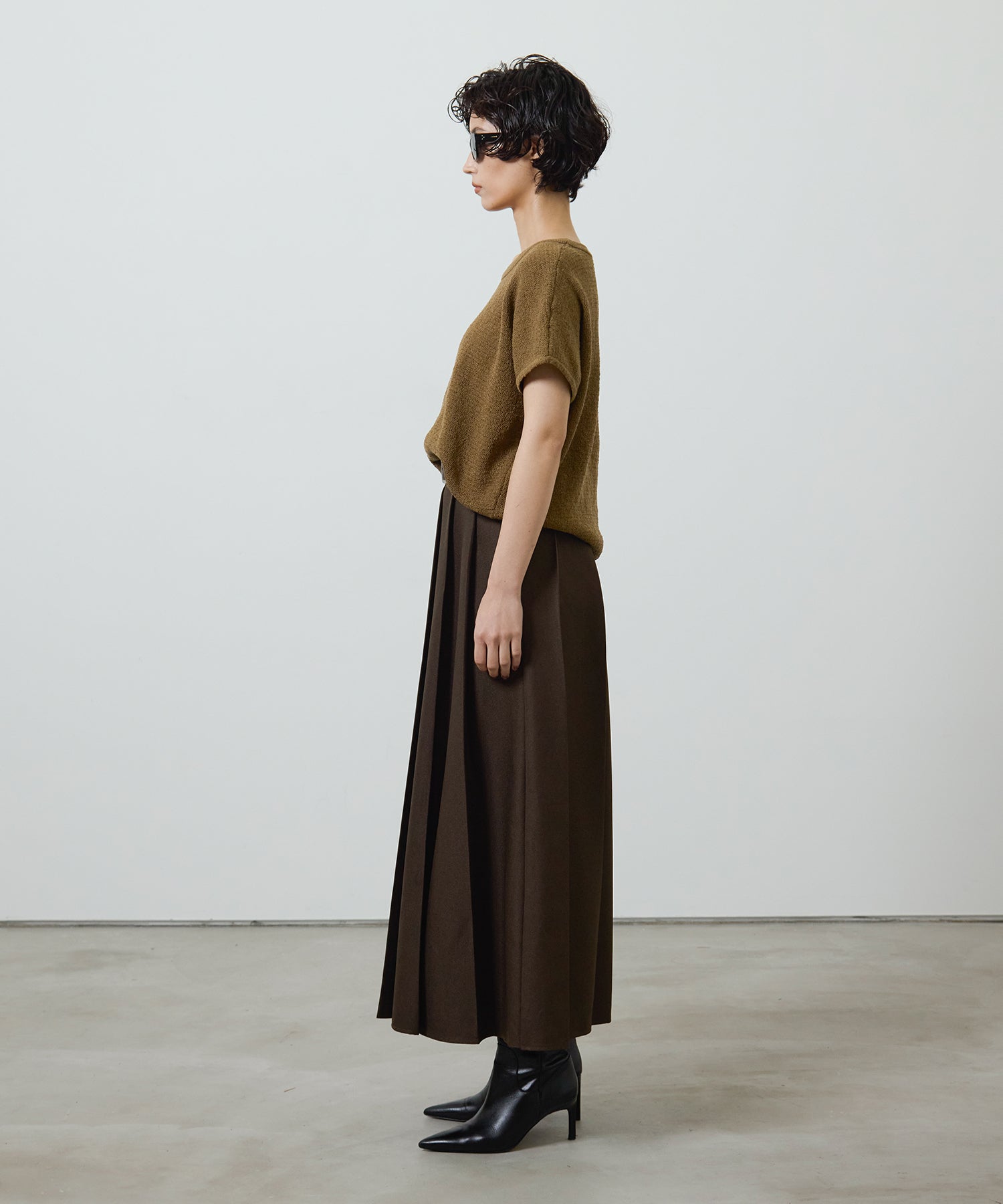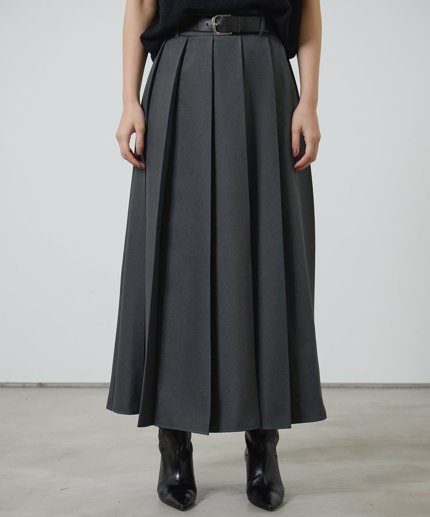 深めのボックスプリーツが生み出す美しい落ち感が魅力の、ロングプリーツスカート。