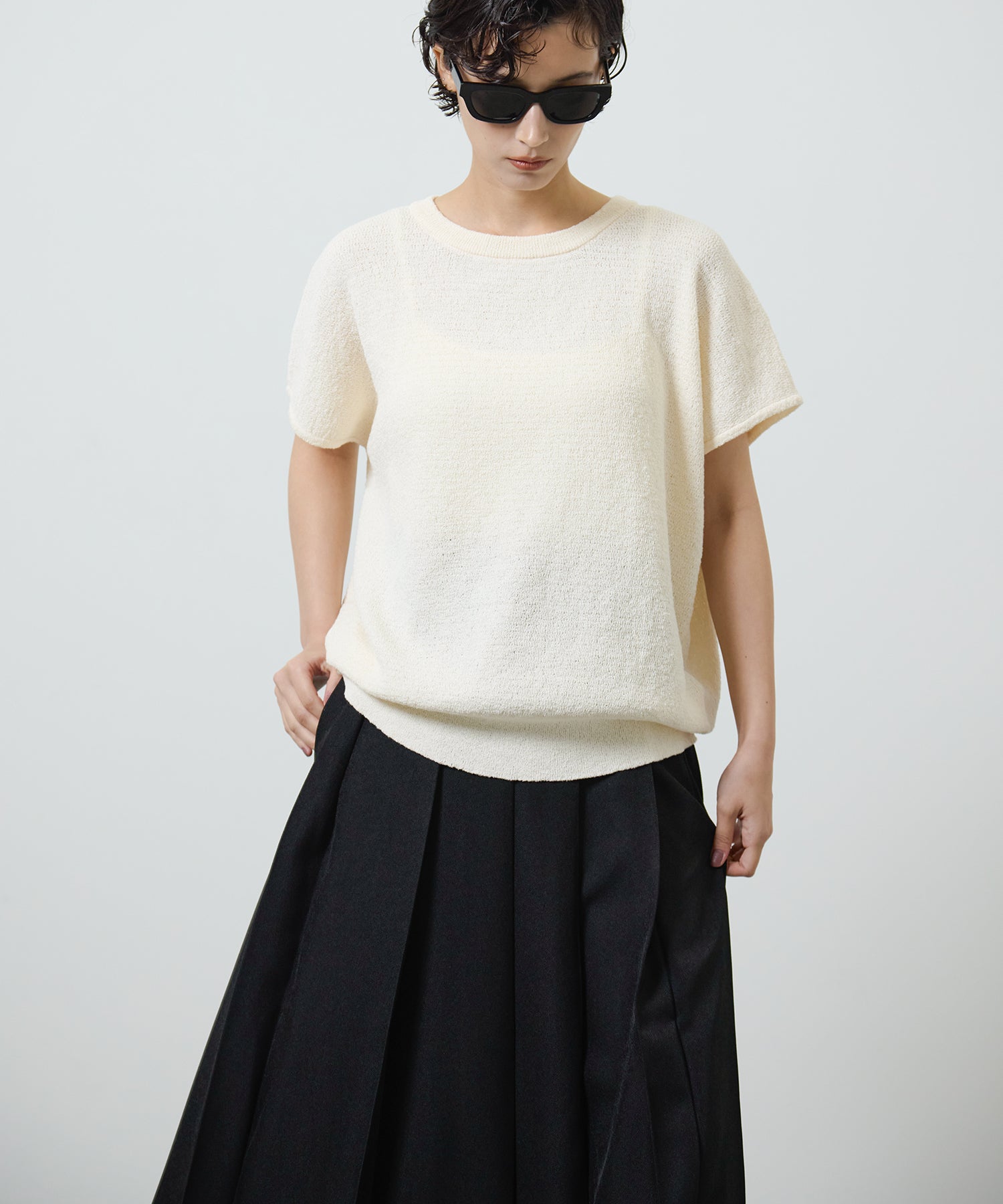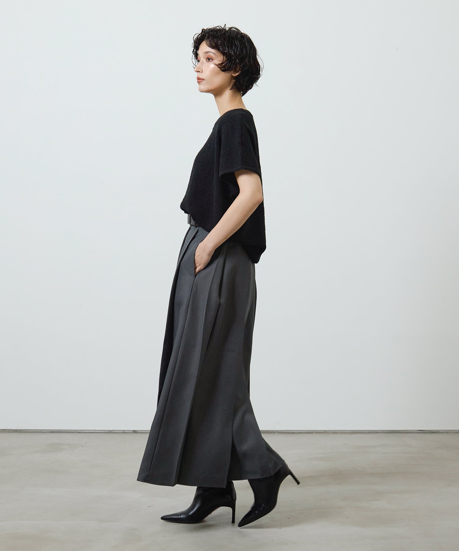 動くたびに揺れるエレガントなシルエットと、サイドスリットがさりげない抜け感を演出します。
