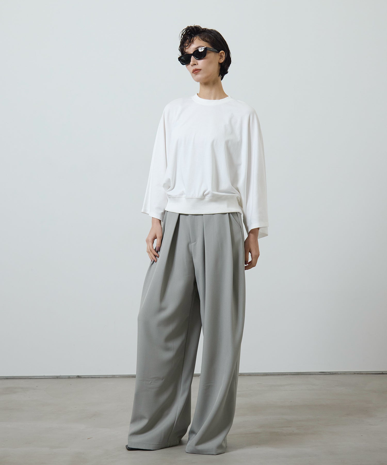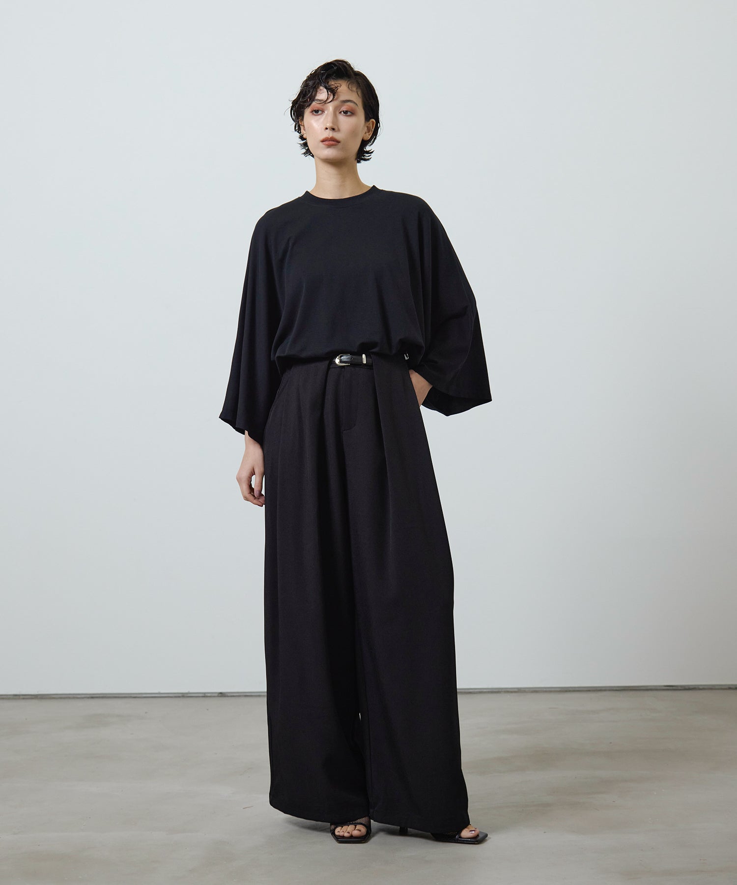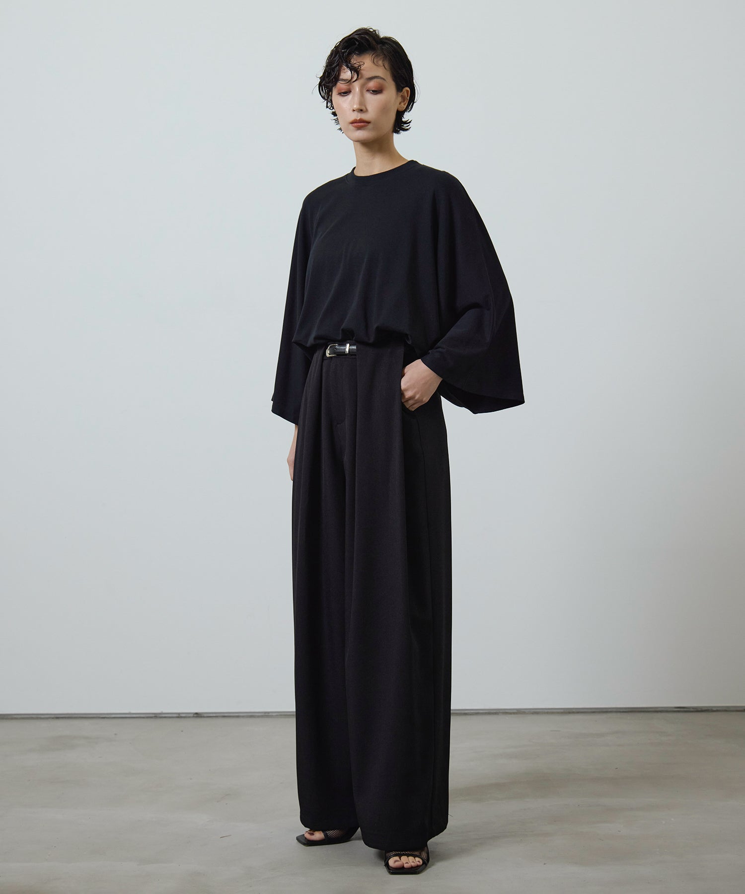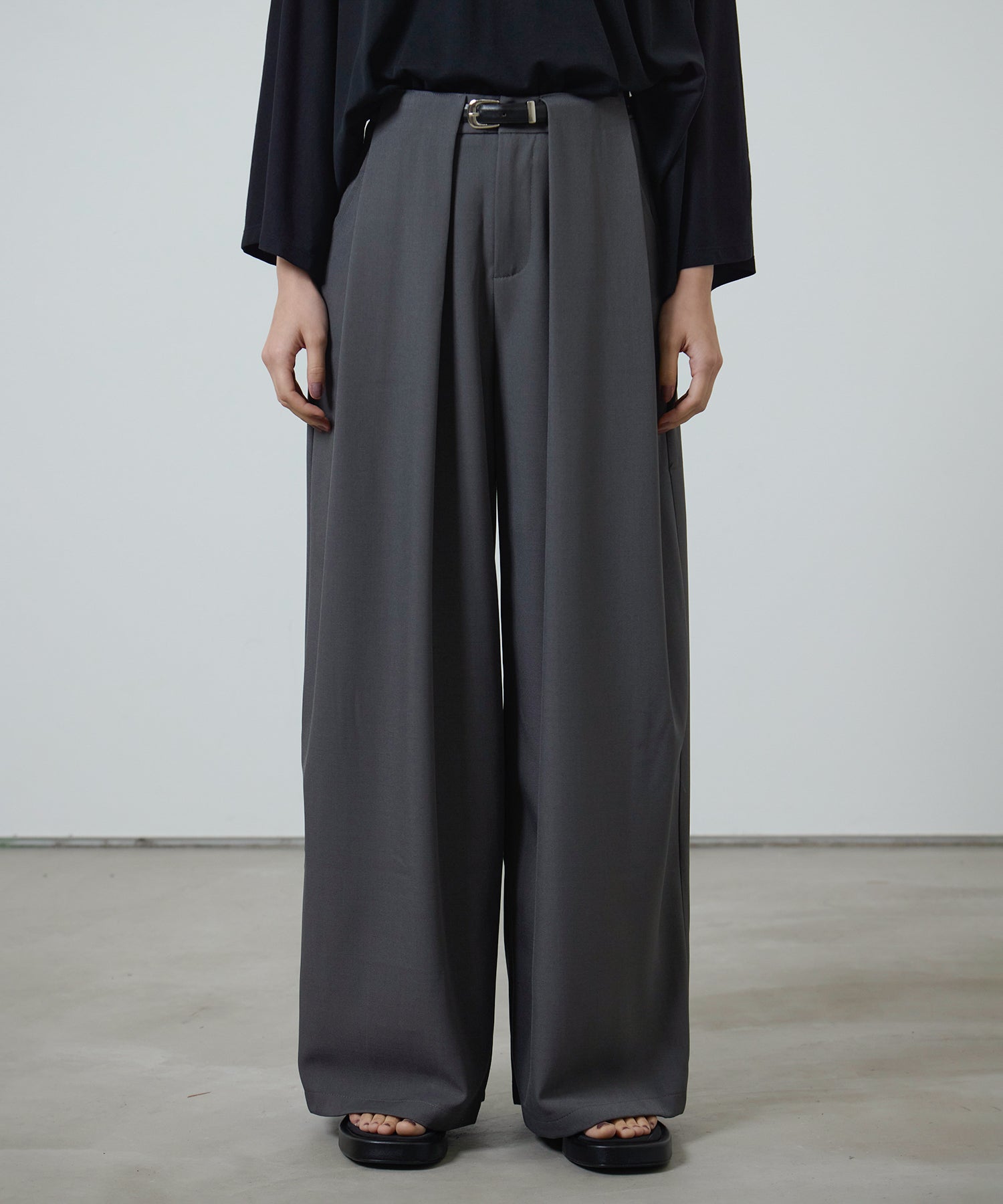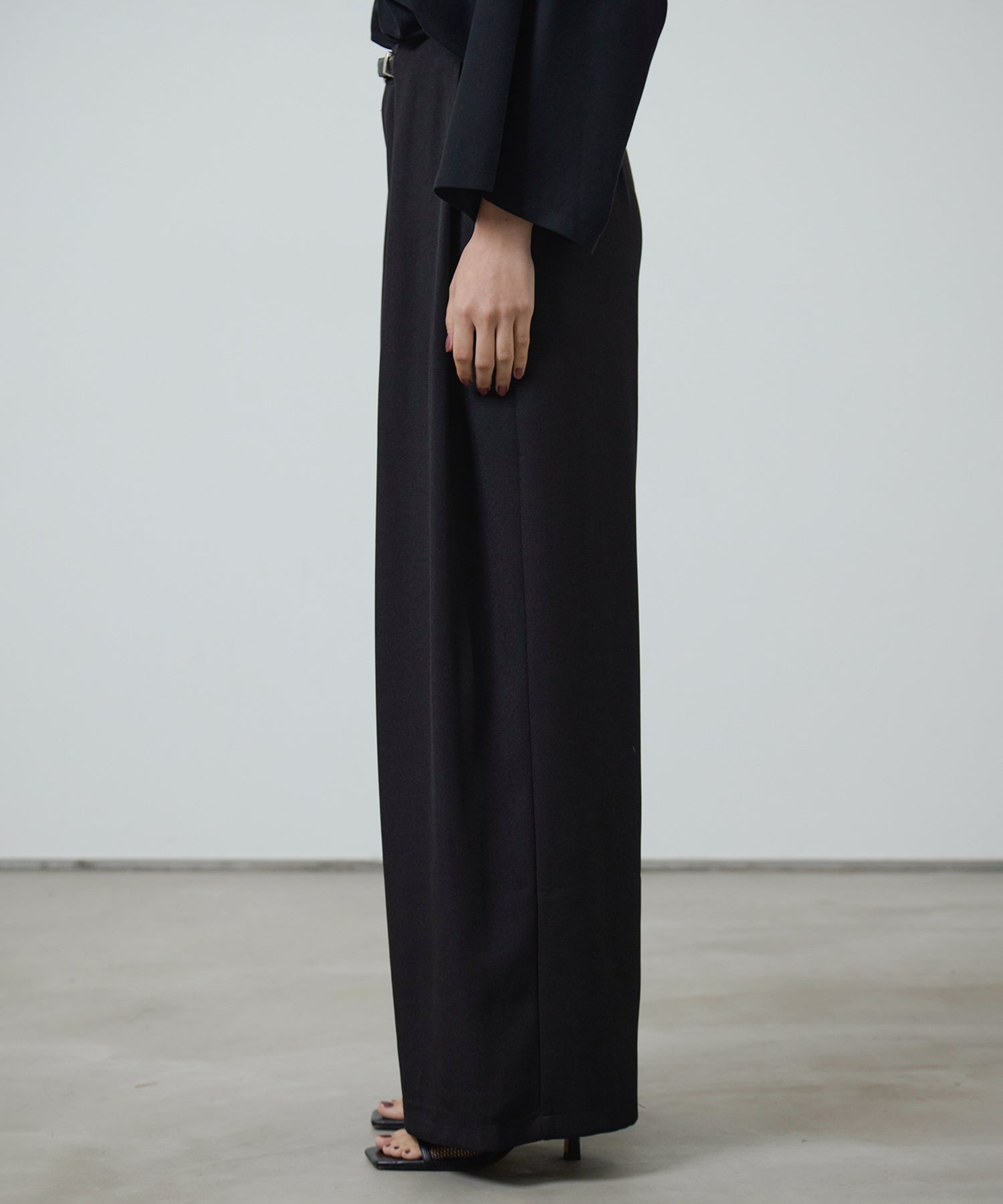 深めのタックから広がるワイドシルエットが美しいドレープを描き、脚のラインを拾わずスタイルを引き立てます。