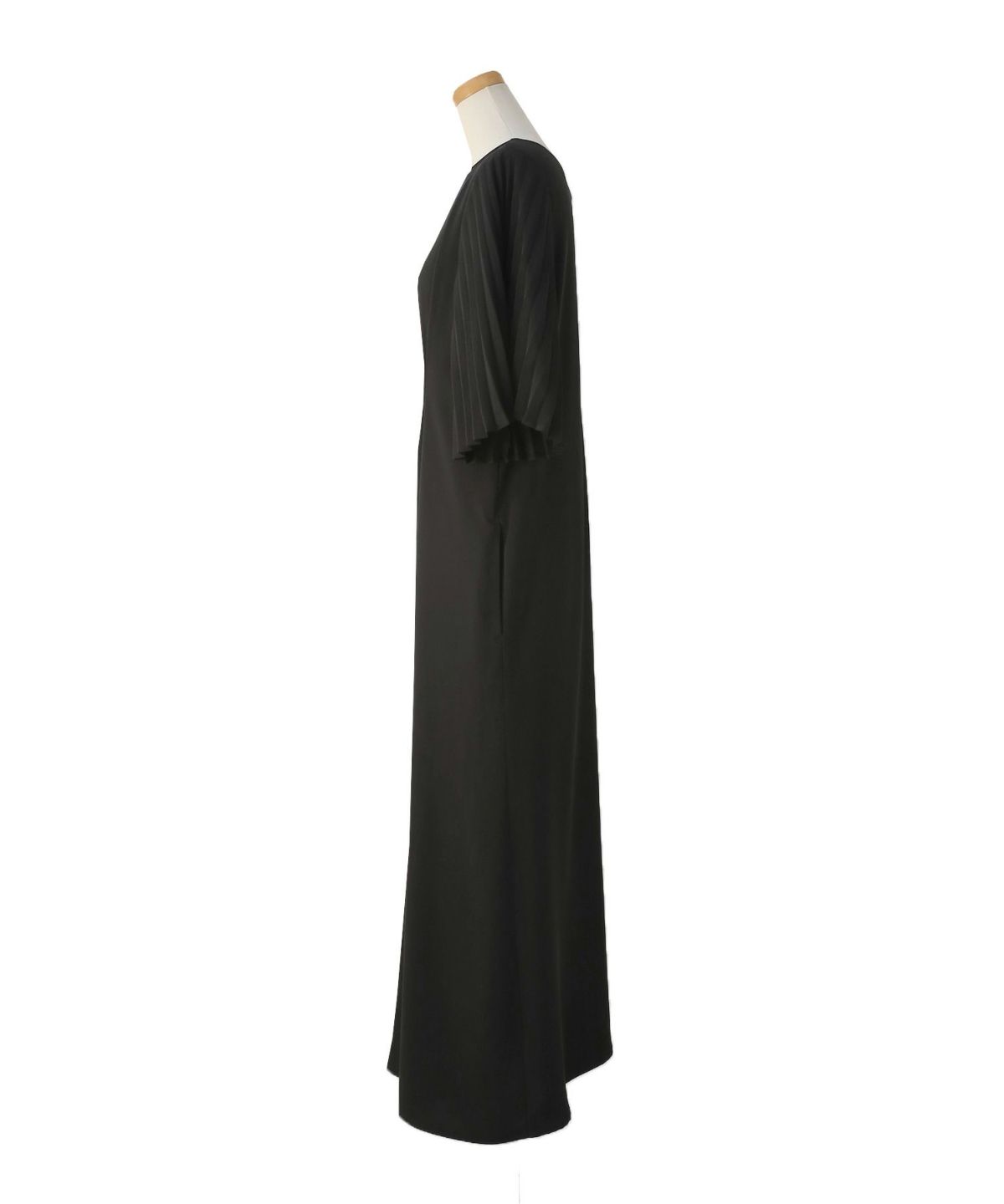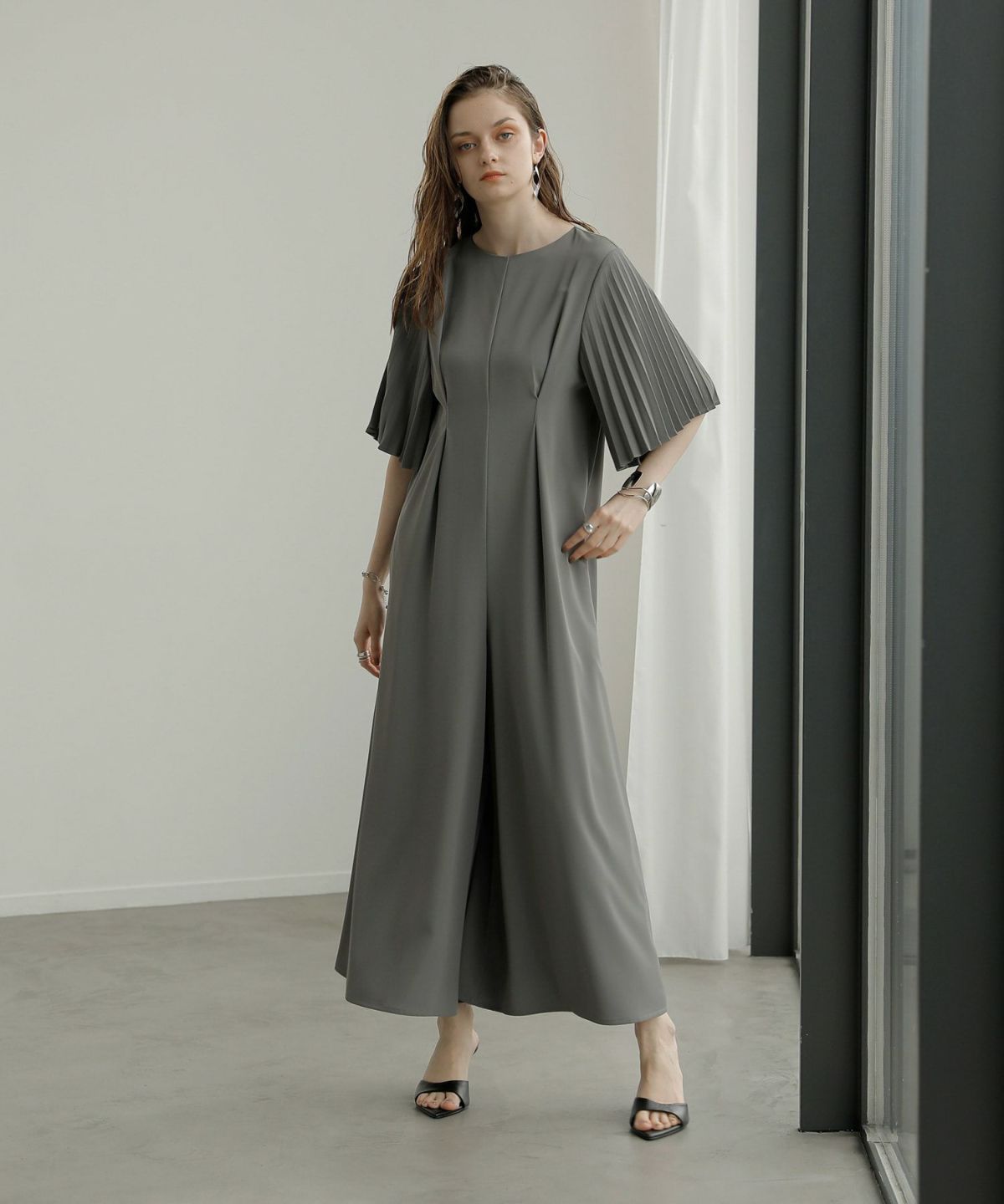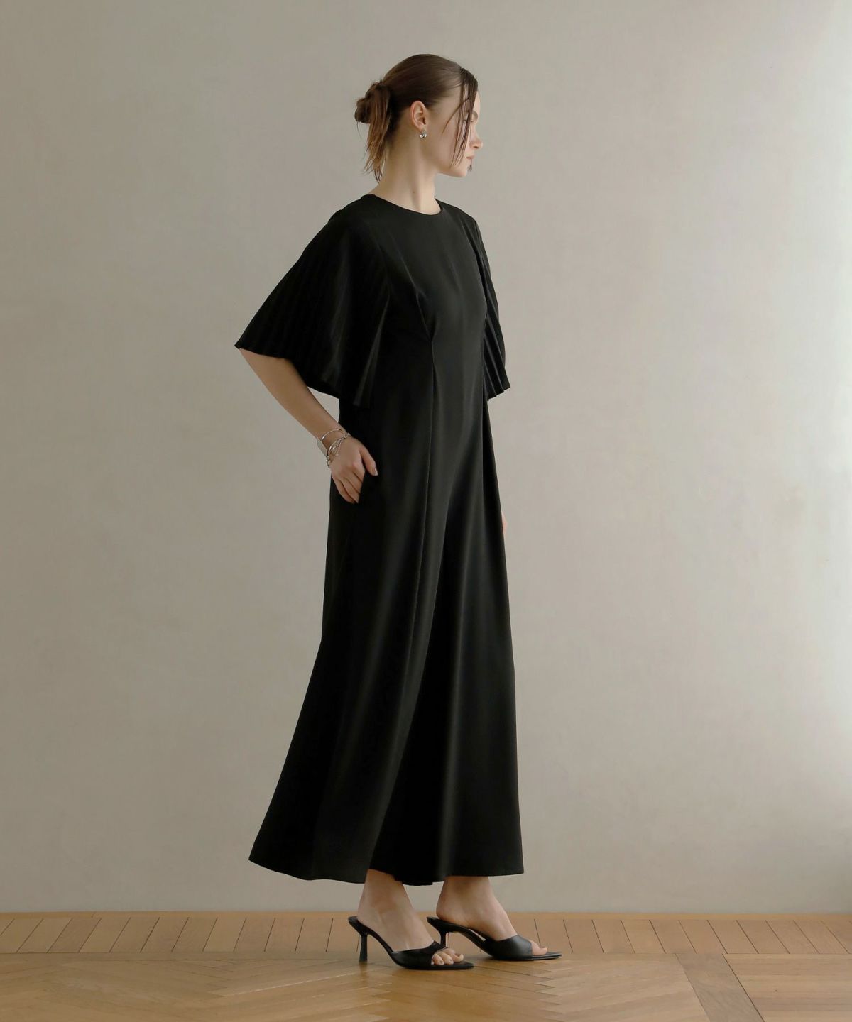 身頃のタックはデザイン性だけでなくウエスト付近のメリハリを見せてくれ、自然な仕草でも所作全体が美しく見えるプリーツスリーブは嬉しいポイント。