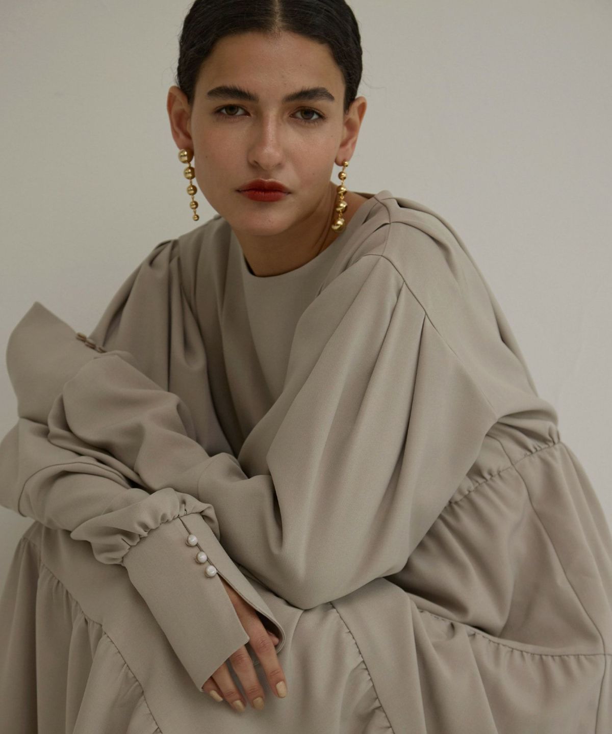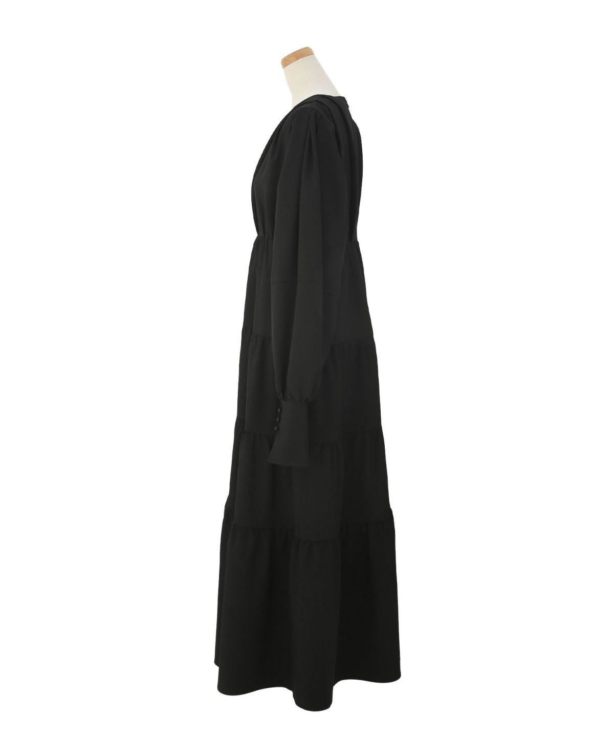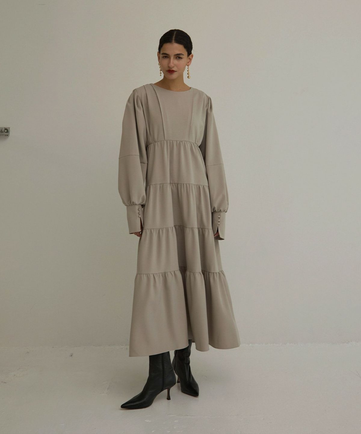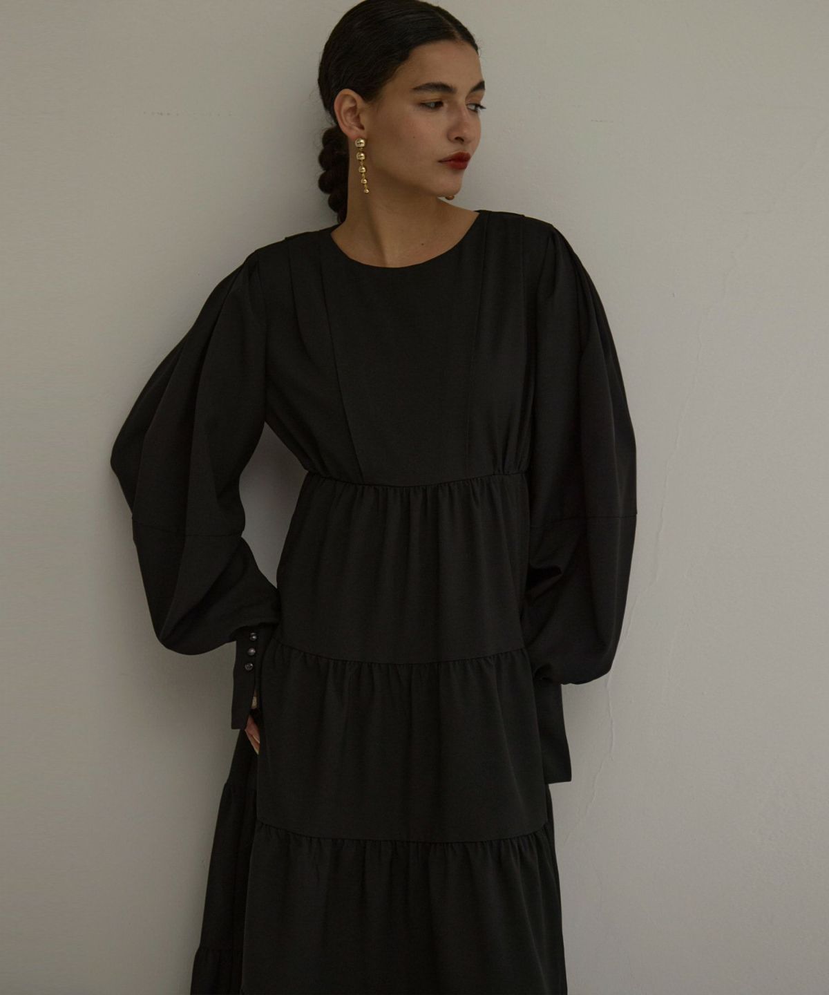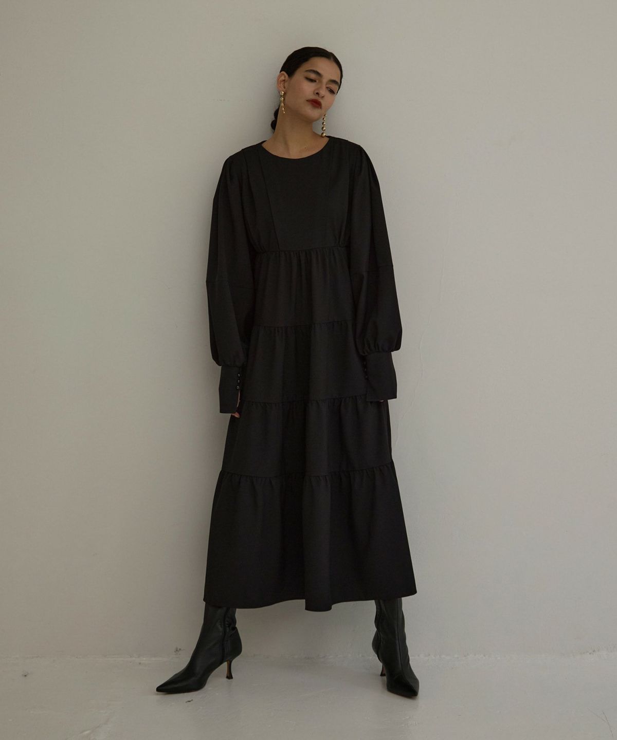 タックとギャザーの立体感が美しいフェミニンなシルエットのティアードドレス。