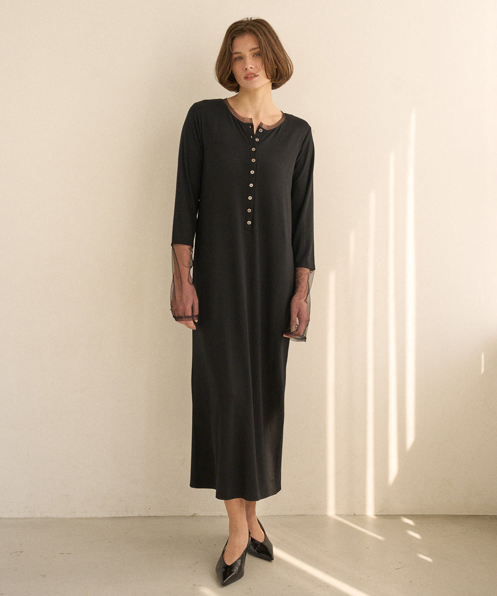 ワンピースはフロントが深いUネックタイプ、バックがクルーネックに裾スリットあきの仕様の、前後着用可能ジレタイプです。