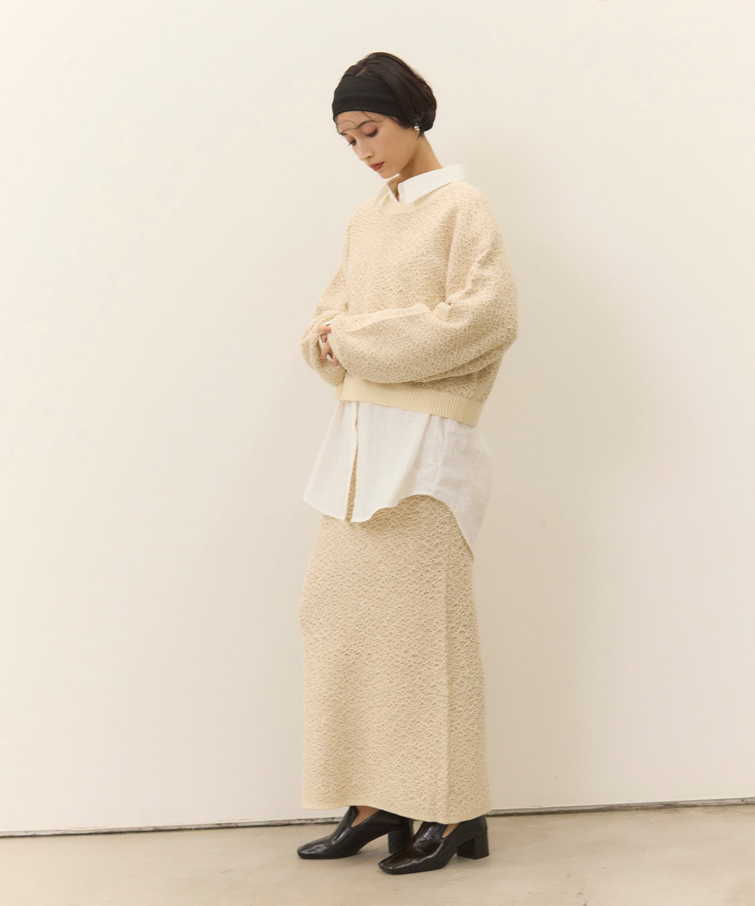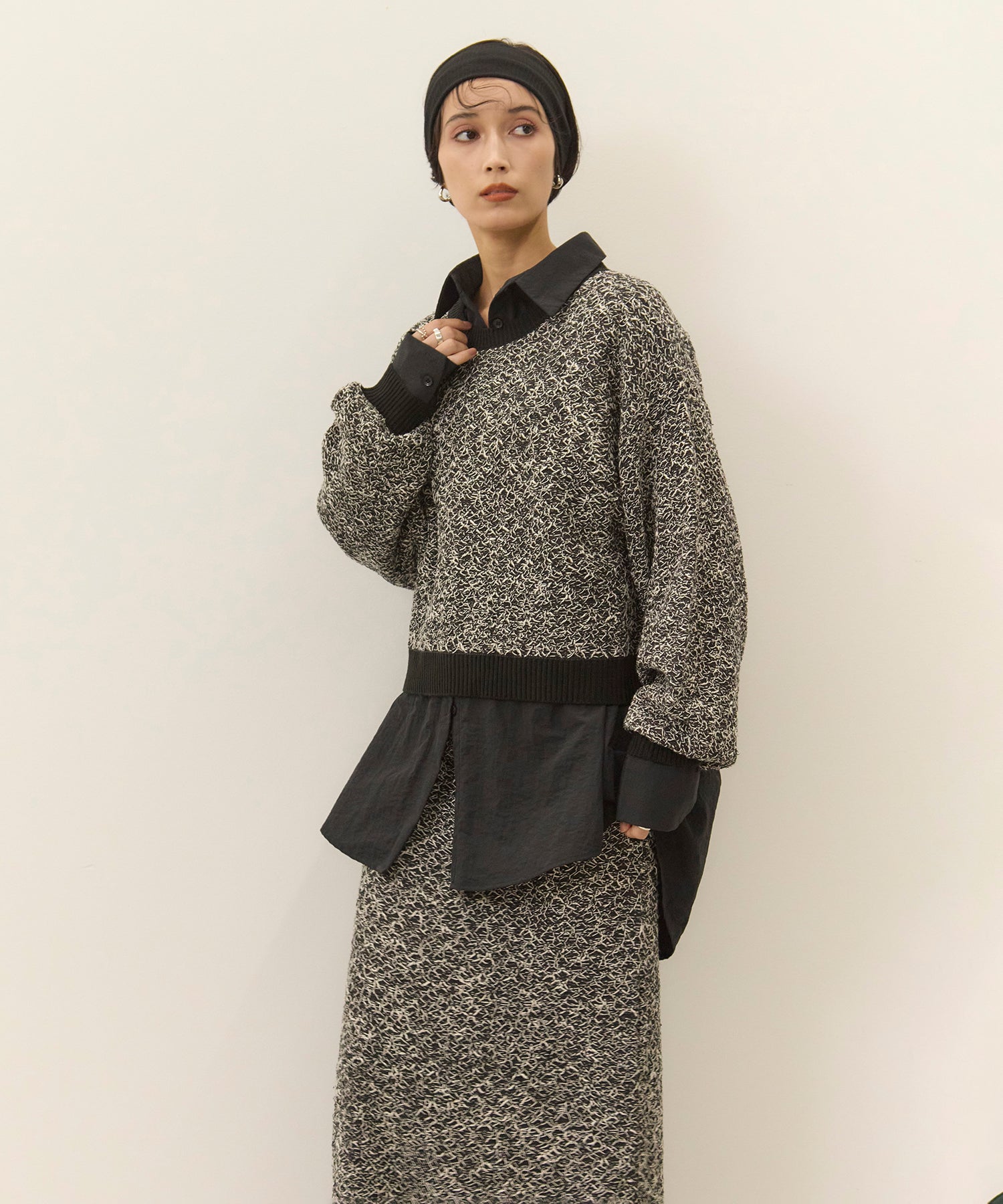 タイトスカートやスラックスと合わせればコントラストのあるモードなスタイリングに。