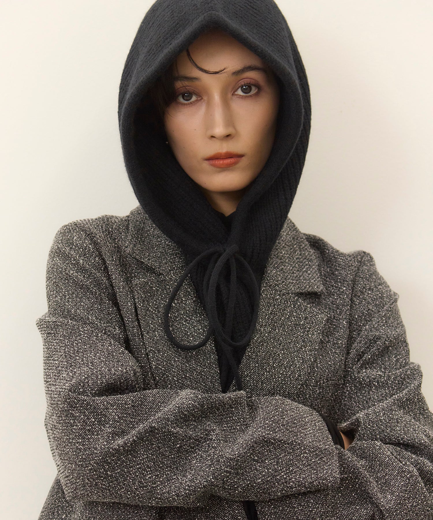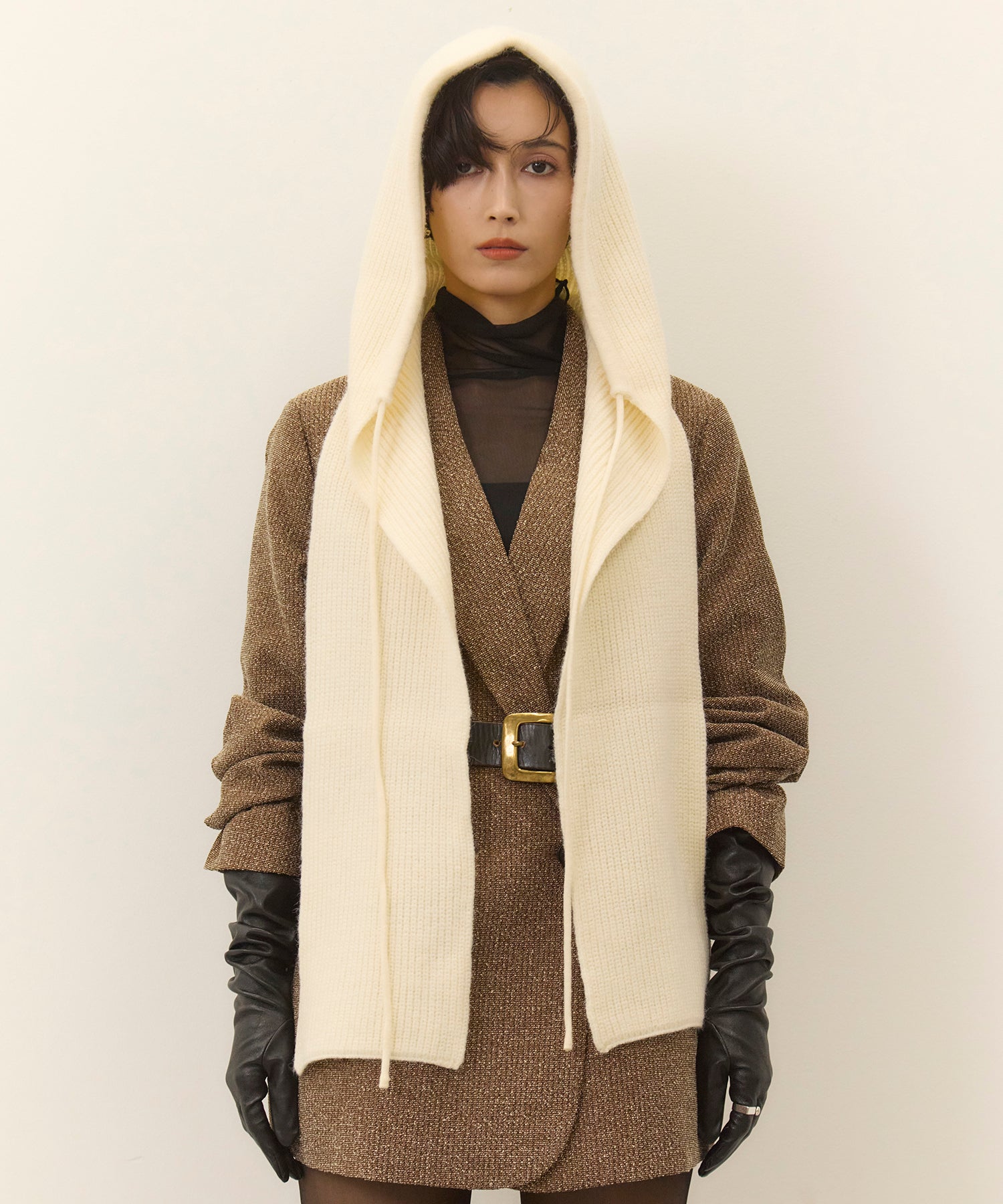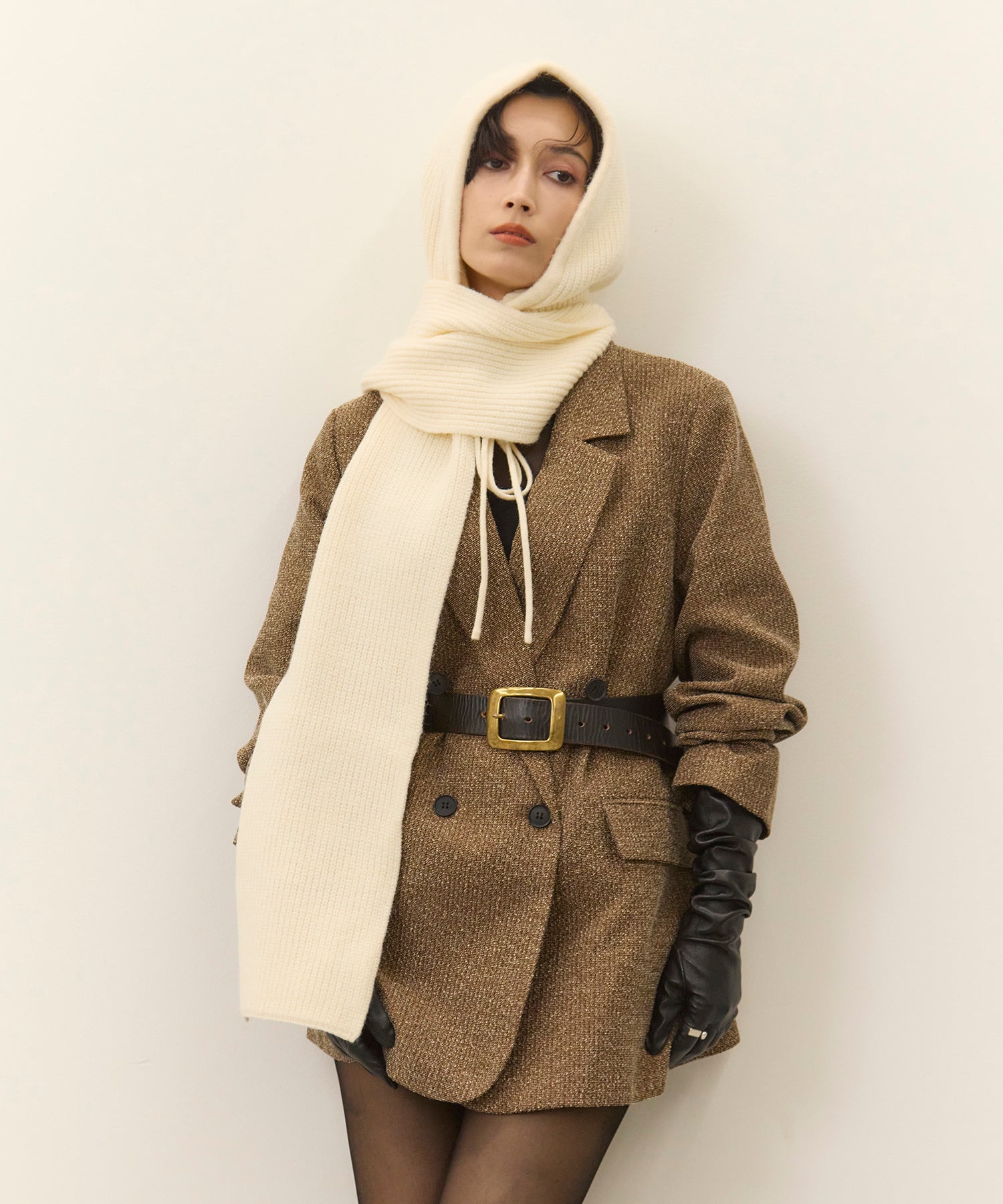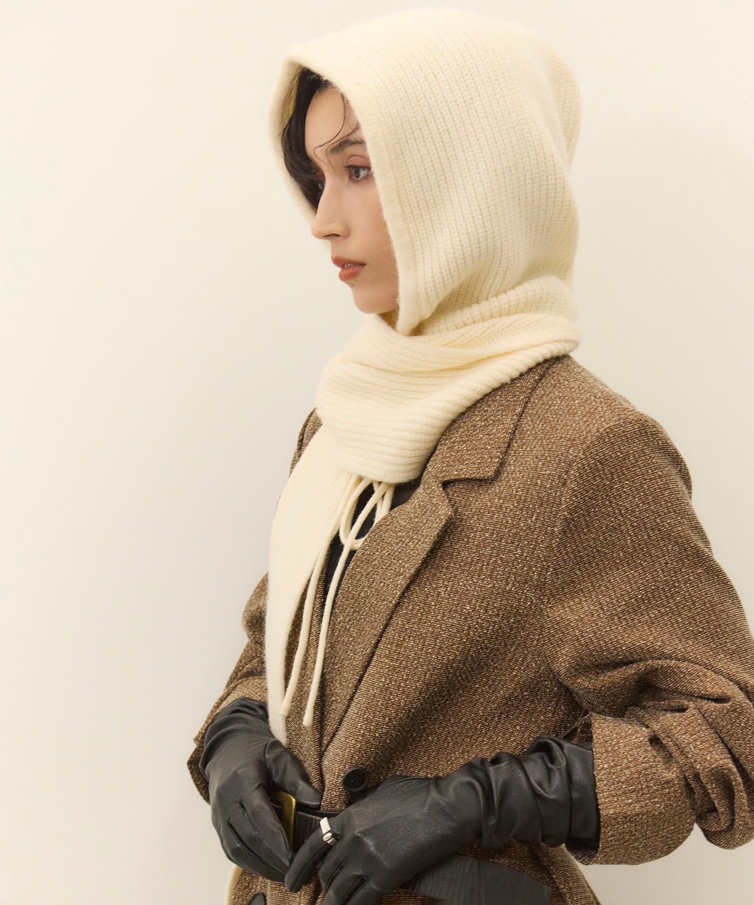 頭を包み込むフードのようなデザインと長めのスカーフが一体化し、防寒性とデザイン性を兼ね備えています。
