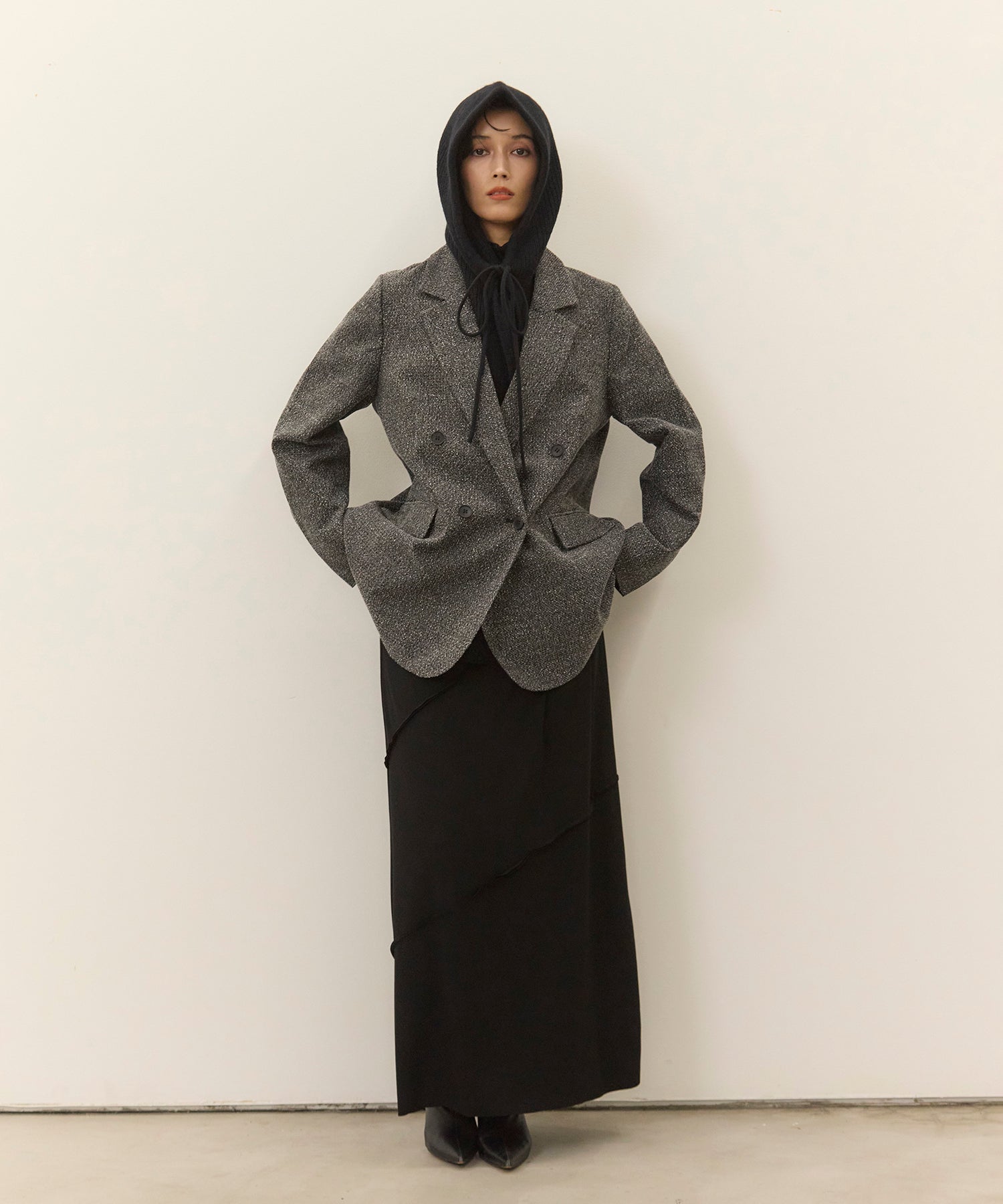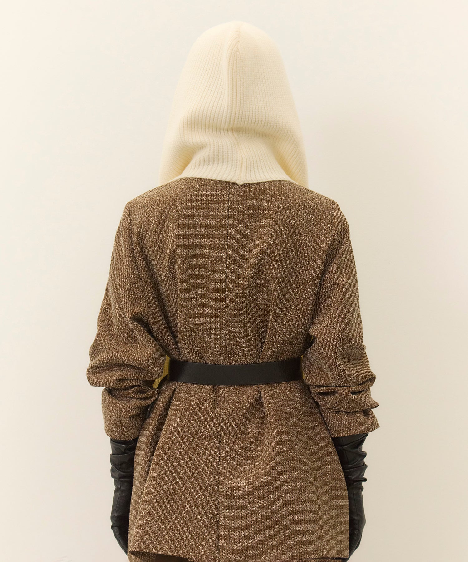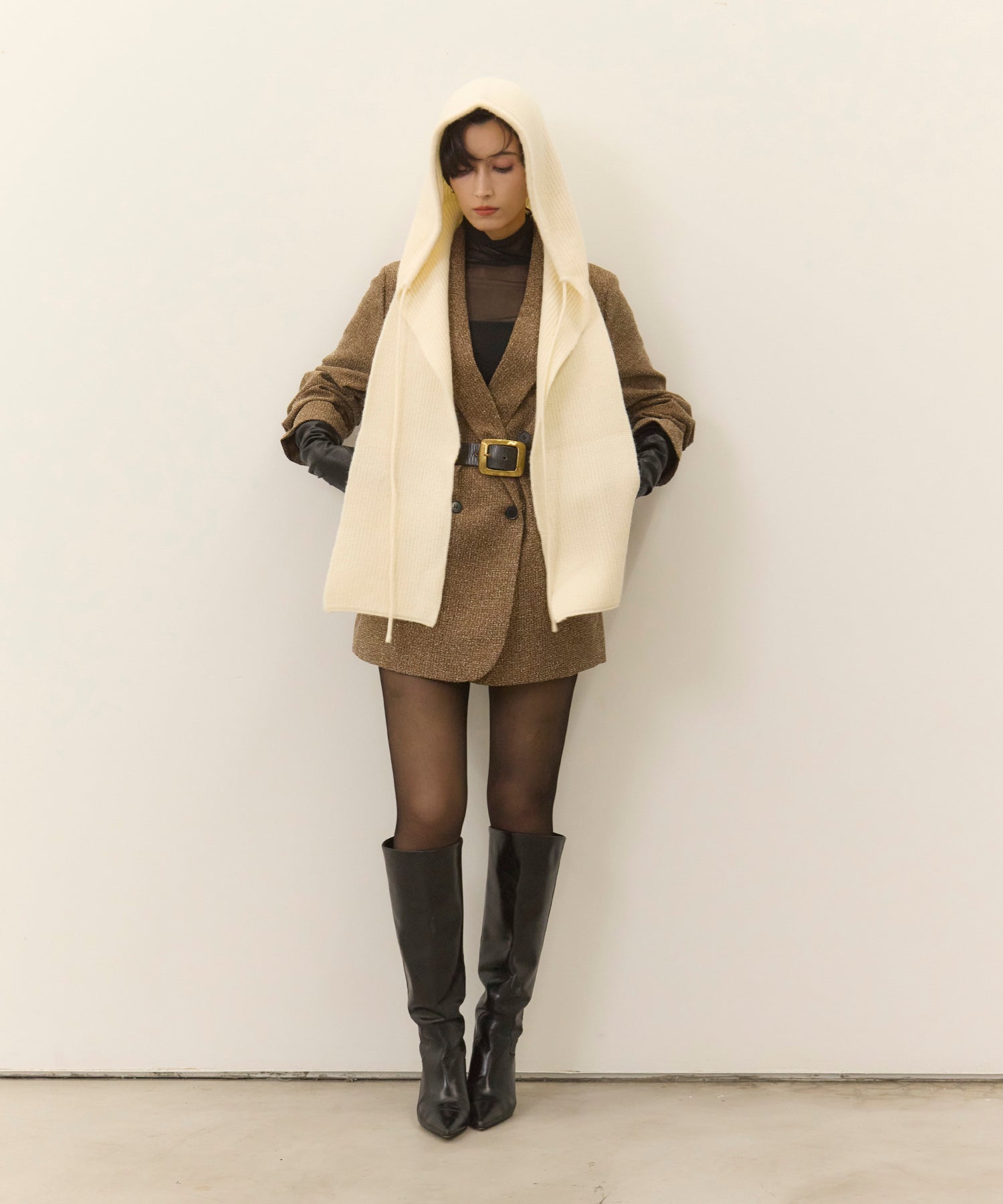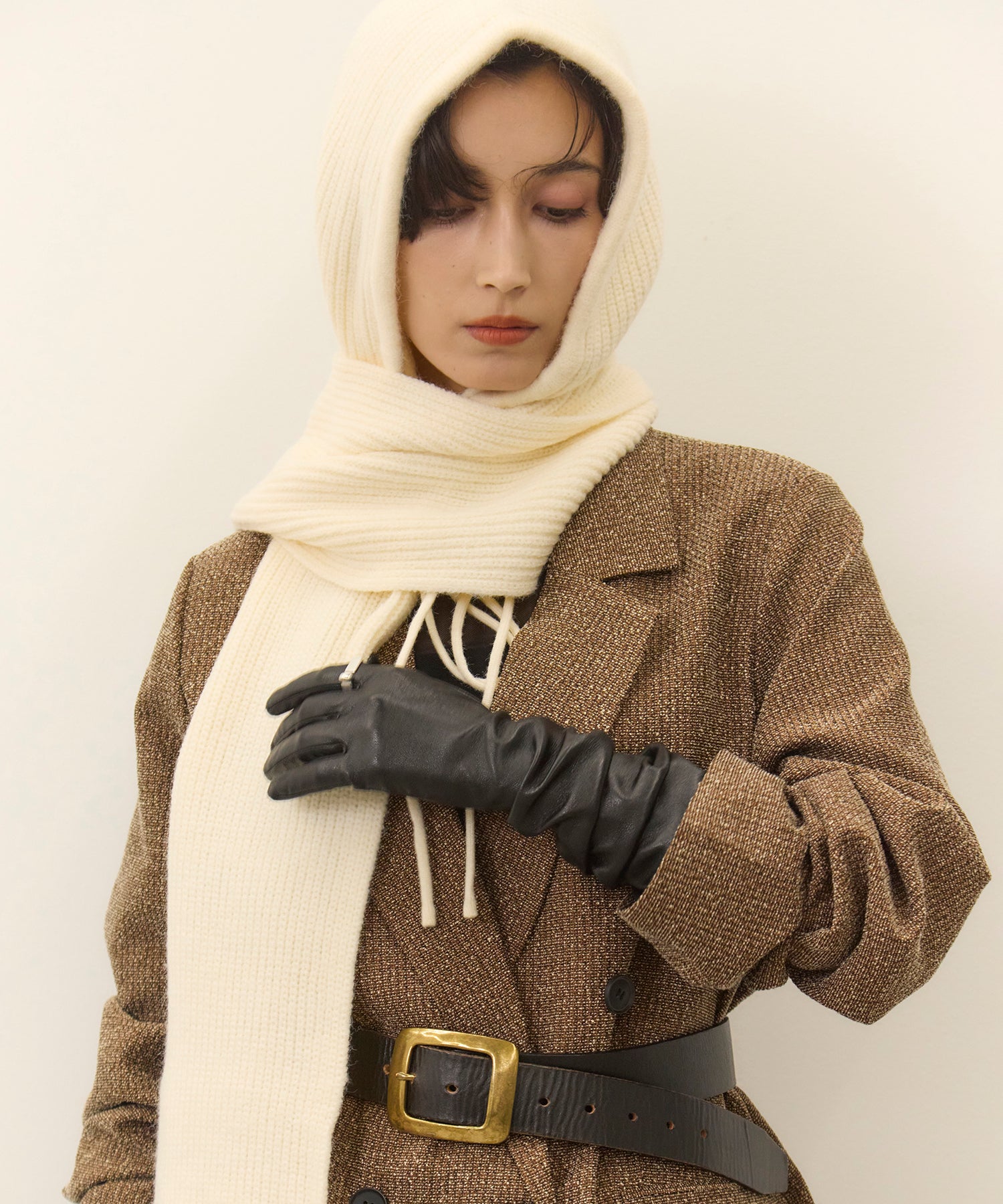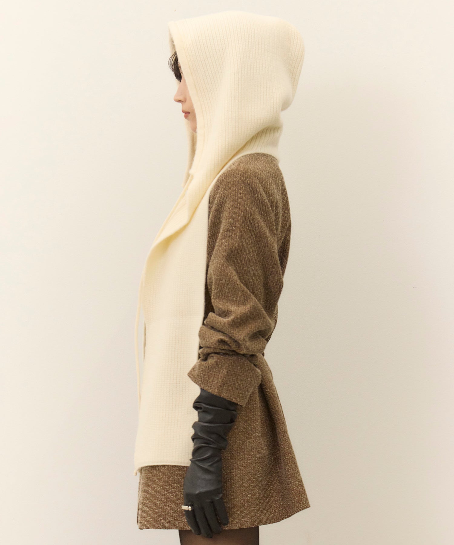 頭を包み込むフードのようなデザインと長めのスカーフが一体化し、防寒性とデザイン性を兼ね備えています。