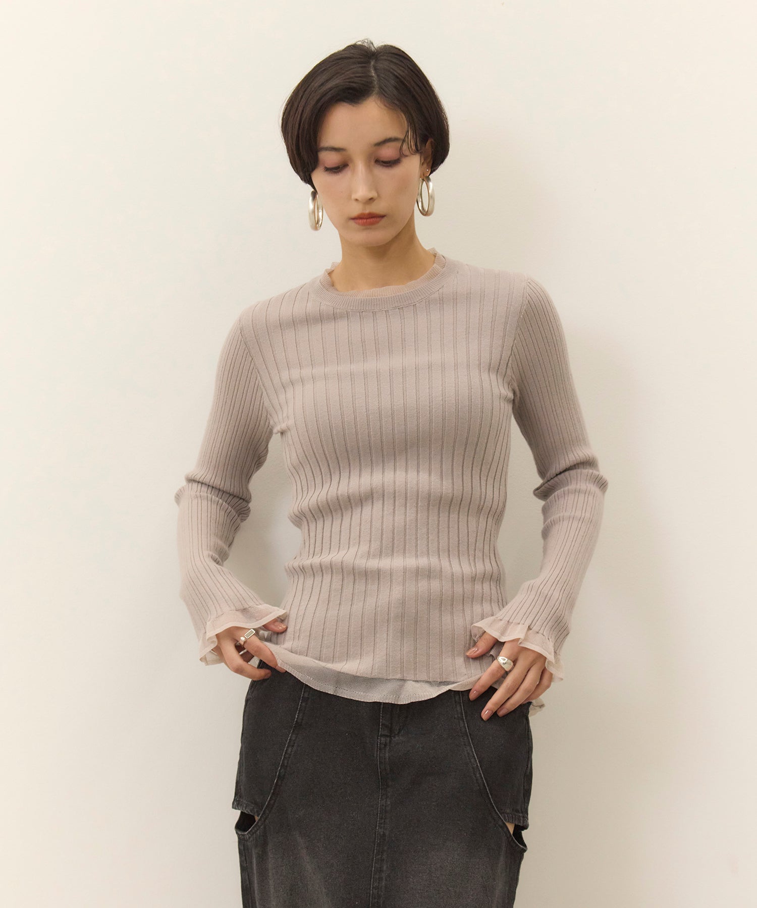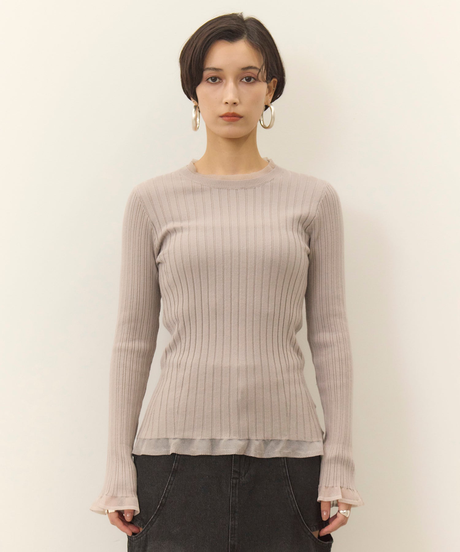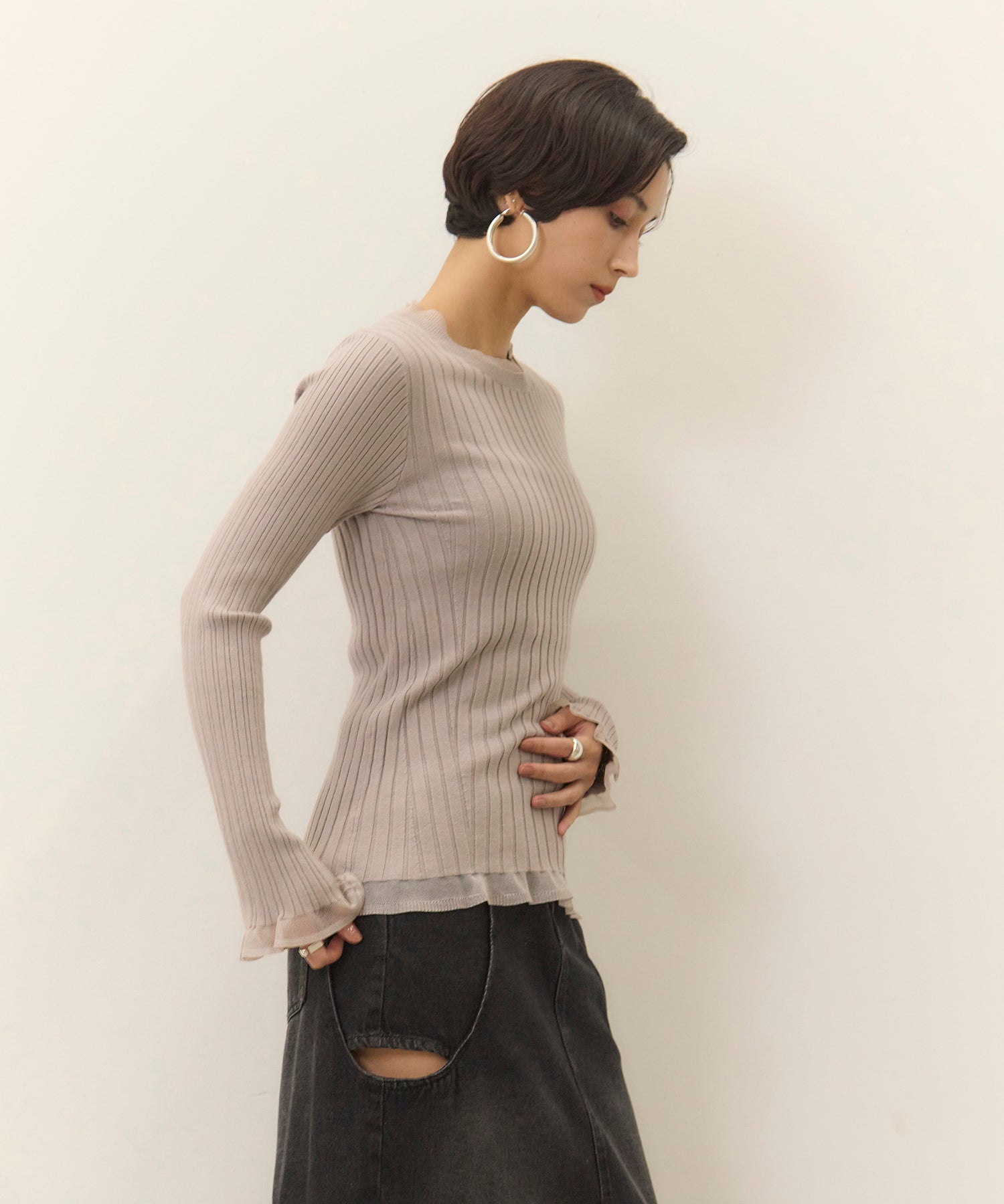 袖口と裾にシアー素材を切り替えたリブクルーネックトップス。