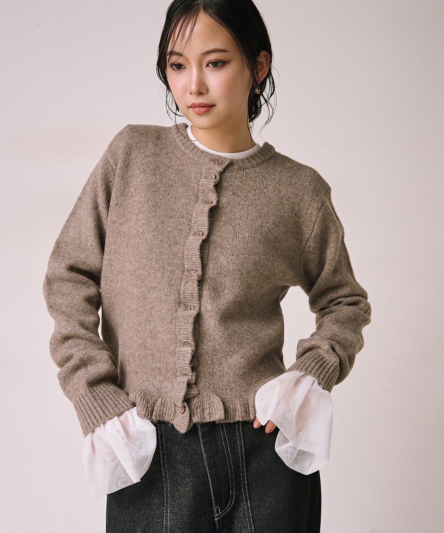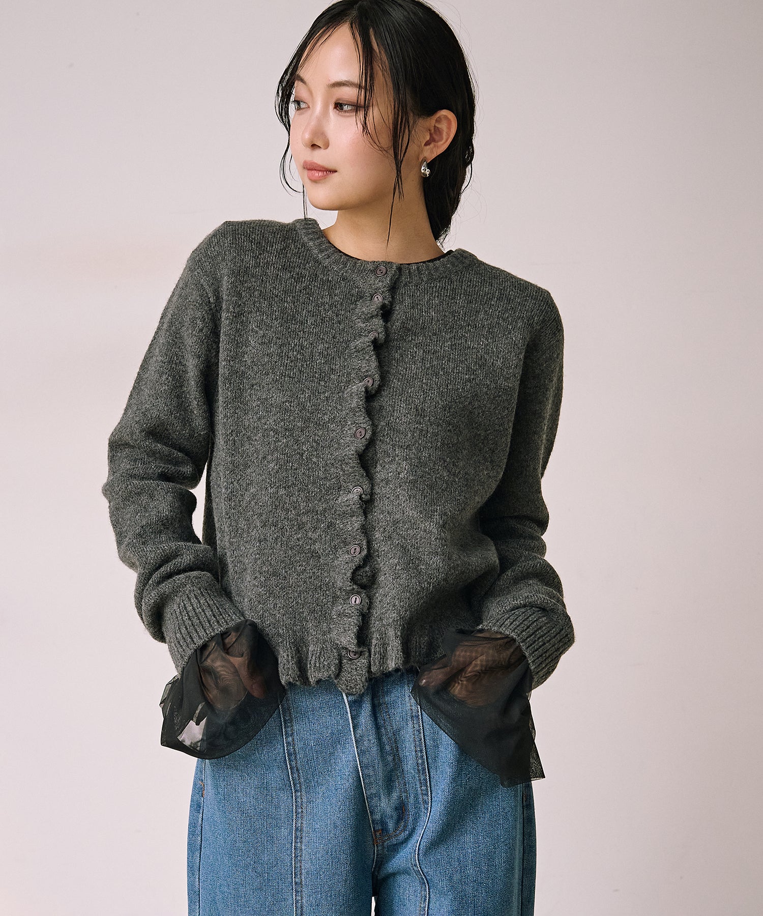 羽織としてはもちろん、ボタンを留めてトップス感覚でも着用できます。