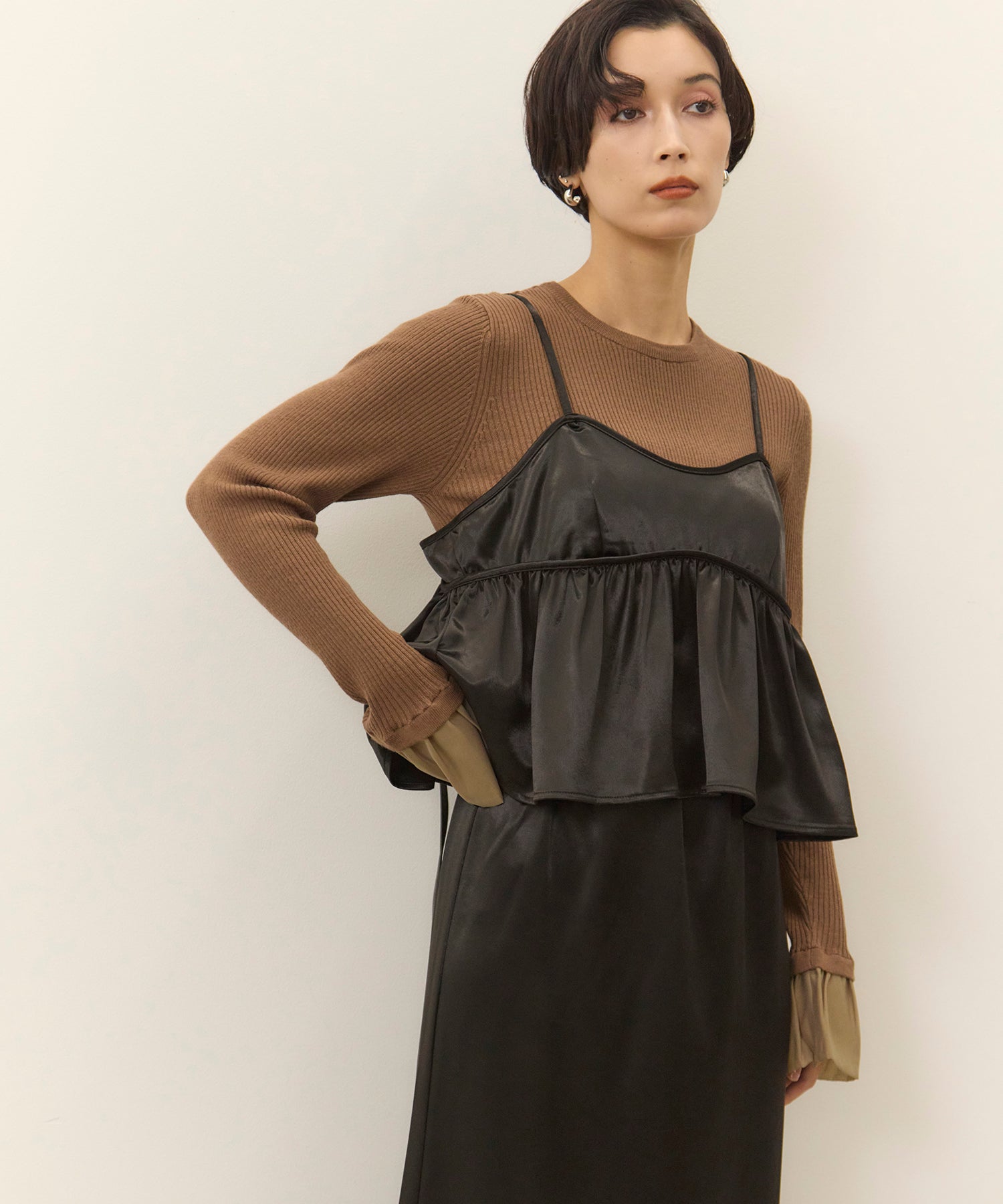 ギャザーを寄せた二重仕立てのデザインが立体的なシルエットを生み、レイヤードに奥行きを与えます。