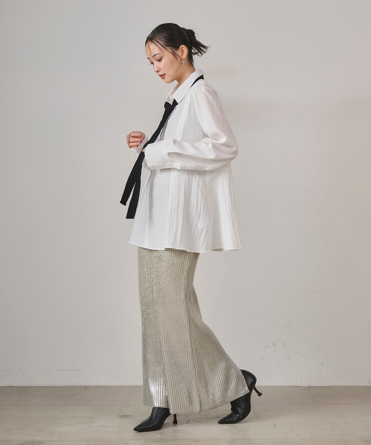 ウエストのリボンでシルエットを調整でき、スタイルアップ効果も抜群。
