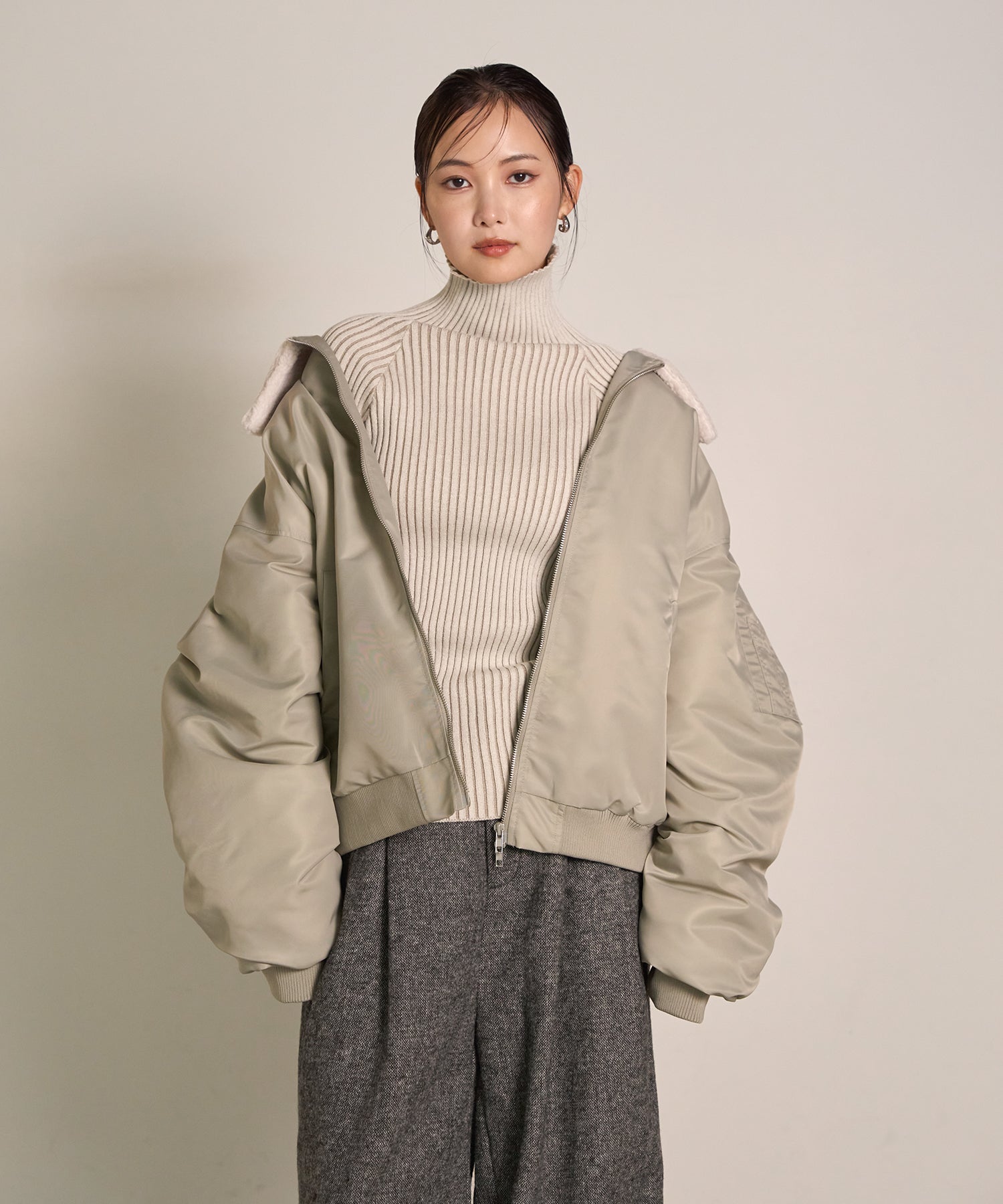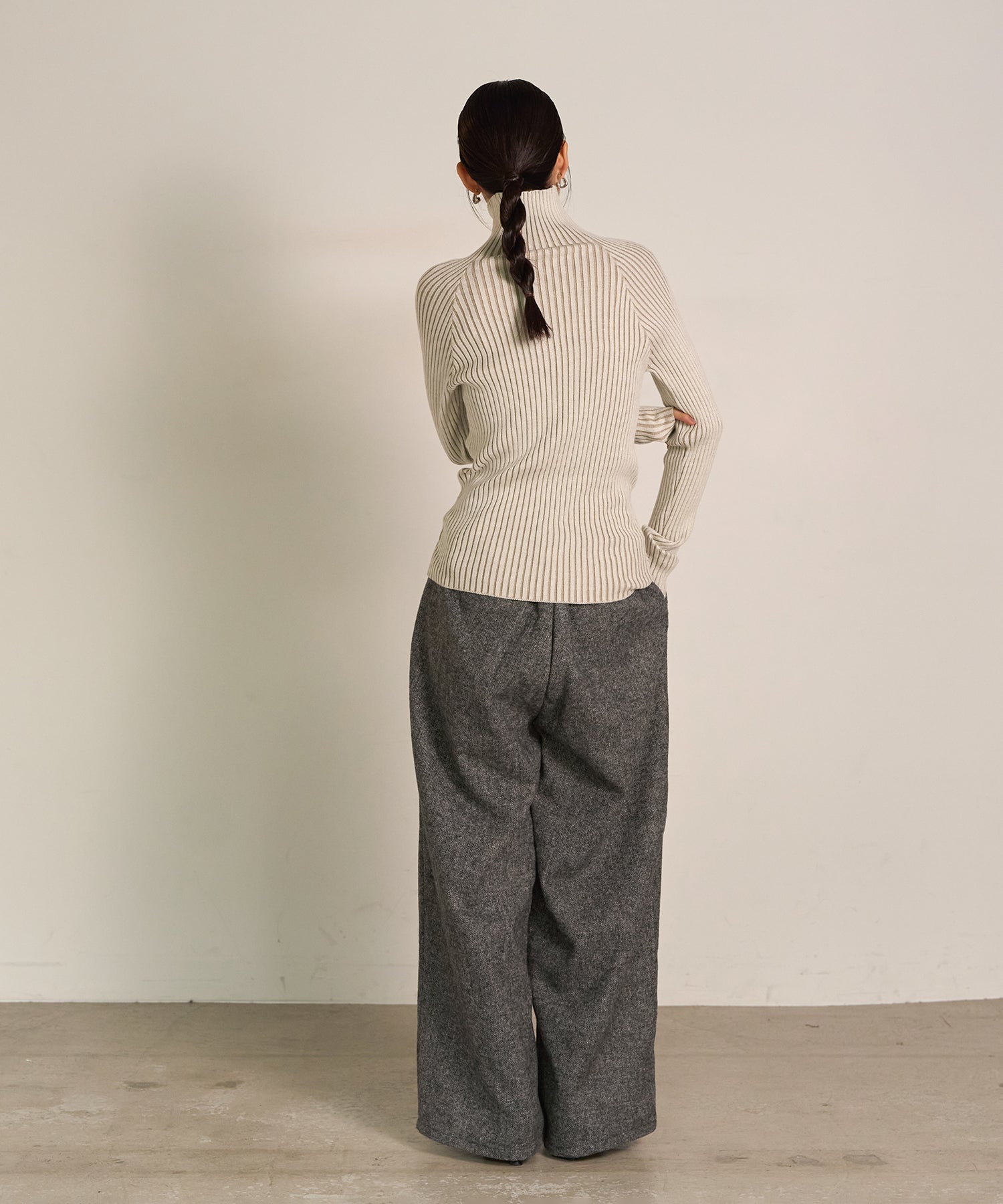 高めのタートルネックが首元を包み込み、季節感のある印象に。