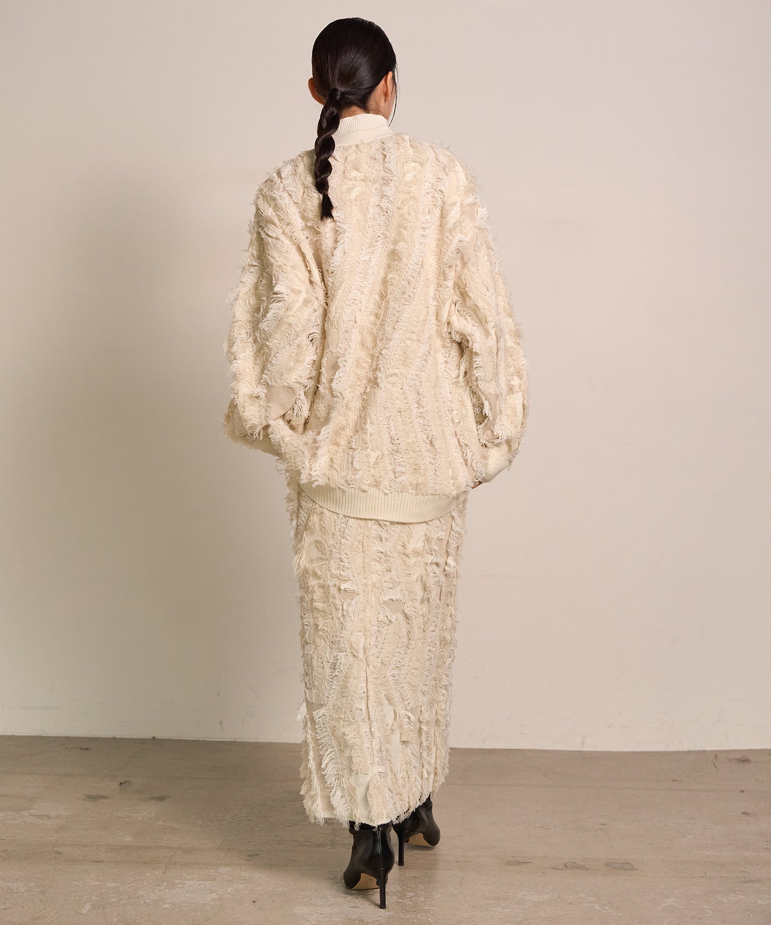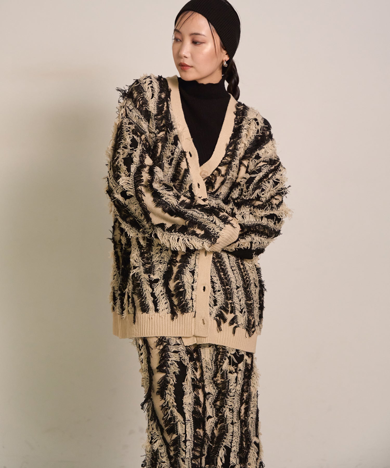 立体感のあるフリンジと編み柄が印象的なニットスカート。