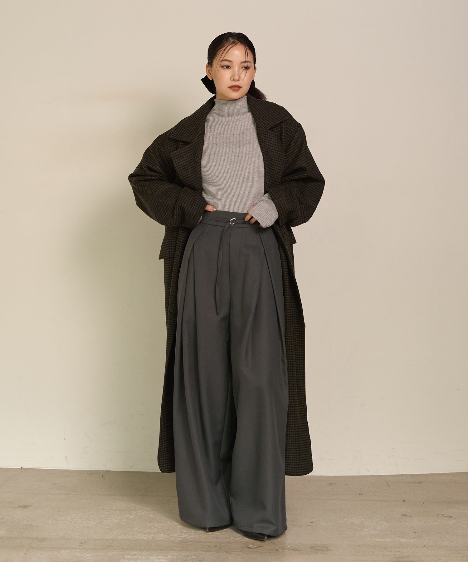 上品なヘザーエステル生地を使用したラップ風ワイドパンツ。