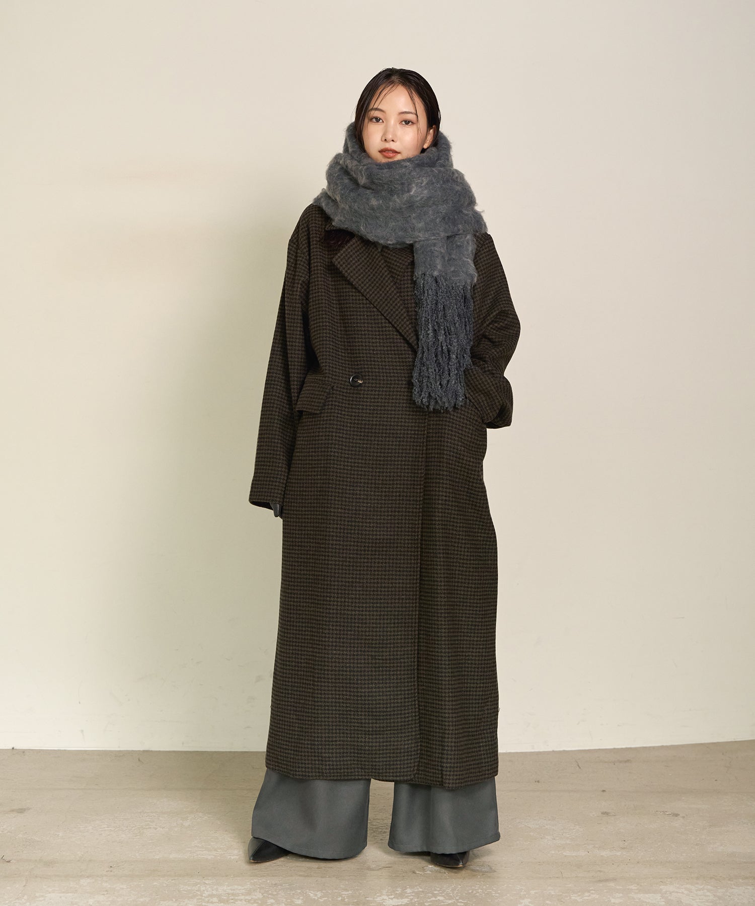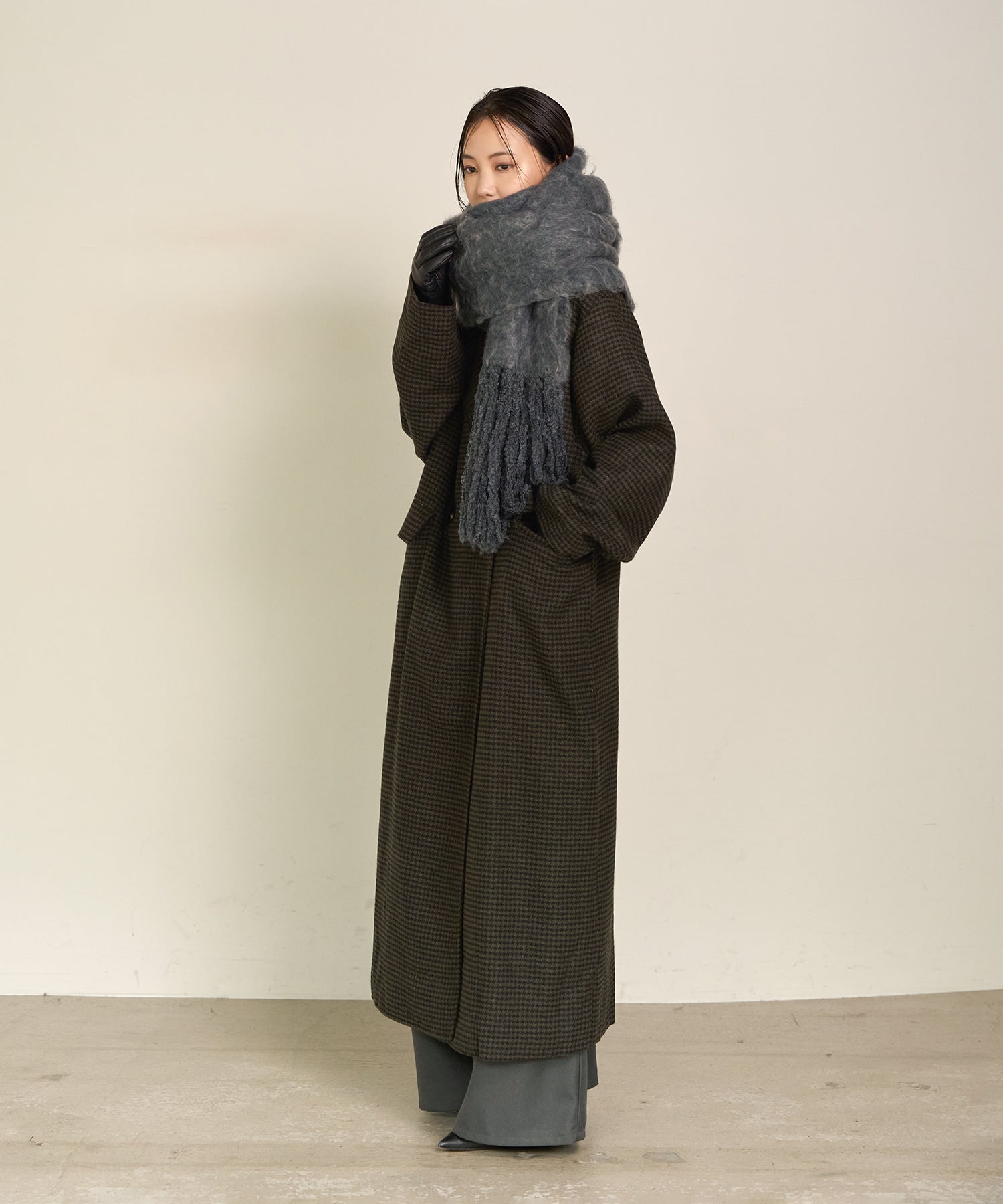 程よくゆとりのあるロングシルエットで、羽織るだけで上品な存在感を放ちます。