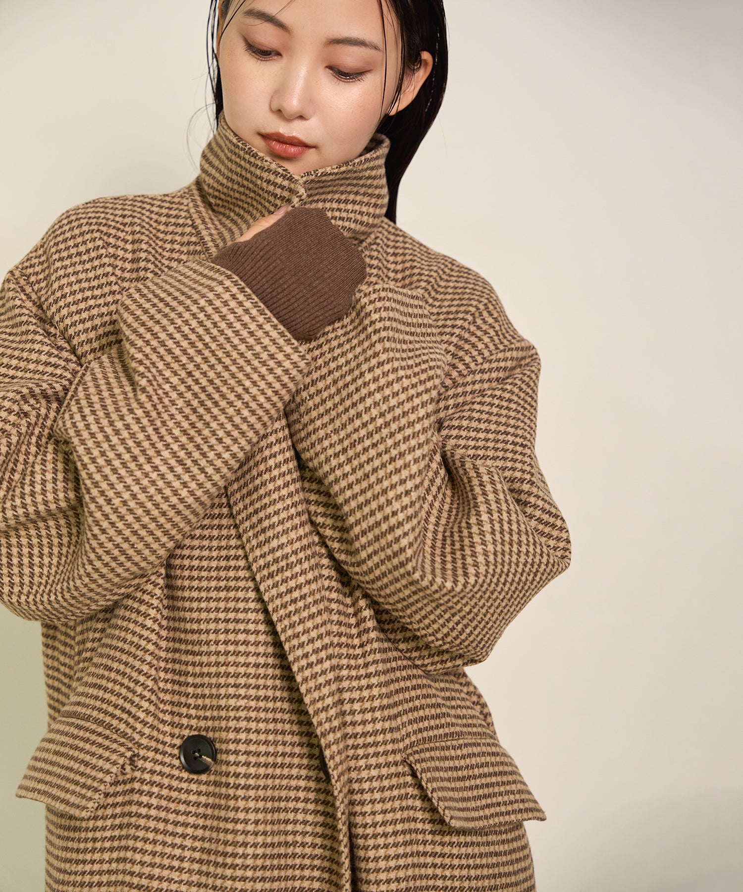 クラシカルなチェック柄が印象的なダブルチェスターコート。
