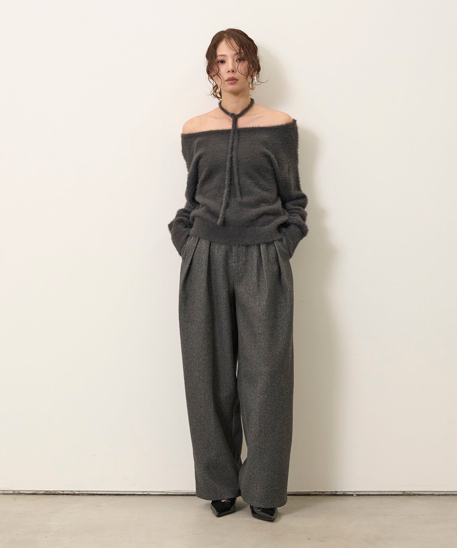 [SET]Choker Feather Round Knit+Wool Like Tuck Trousers
