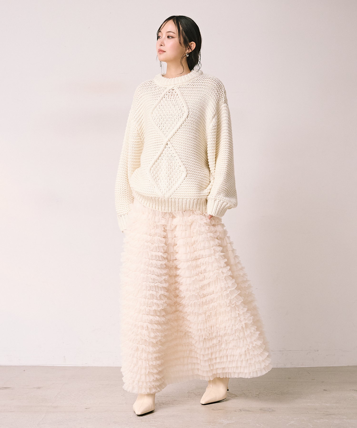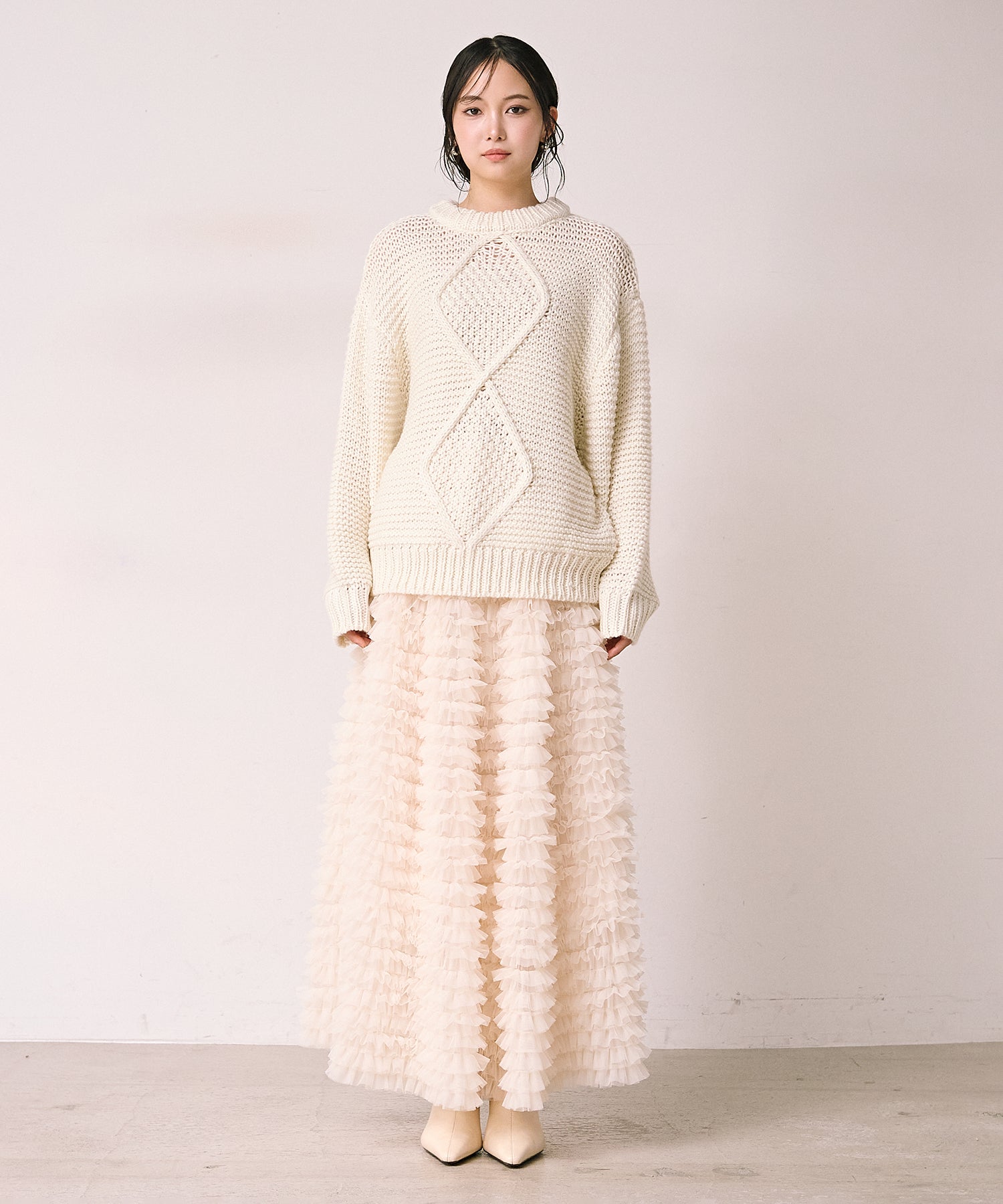 ゆったりとしたサイズ感ながら、編み柄の縦ラインがすっきりとした印象に。