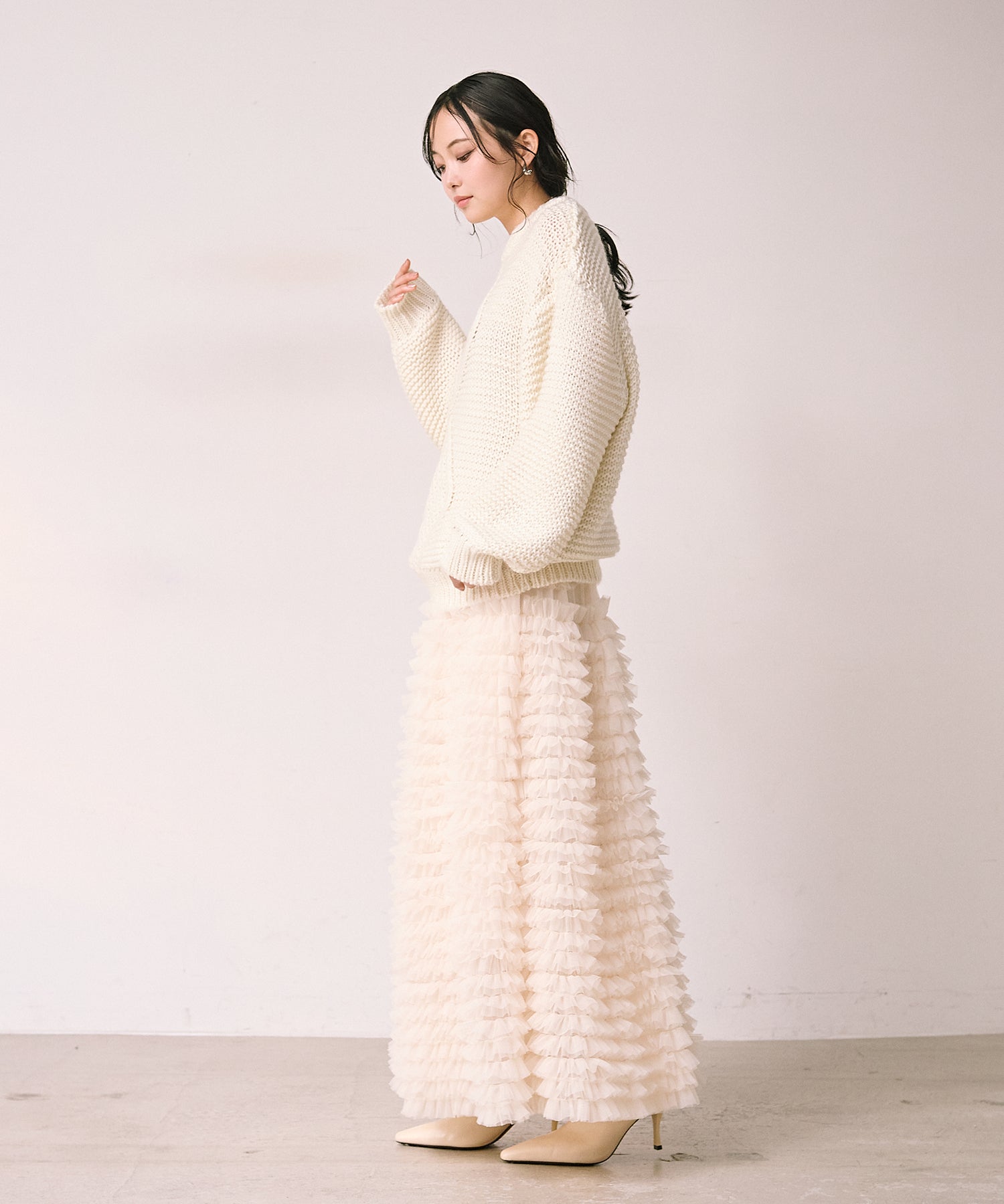 程よく肉厚な編地で、ふんわりとしたボリューム感がシルエットに奥行きを与えます。