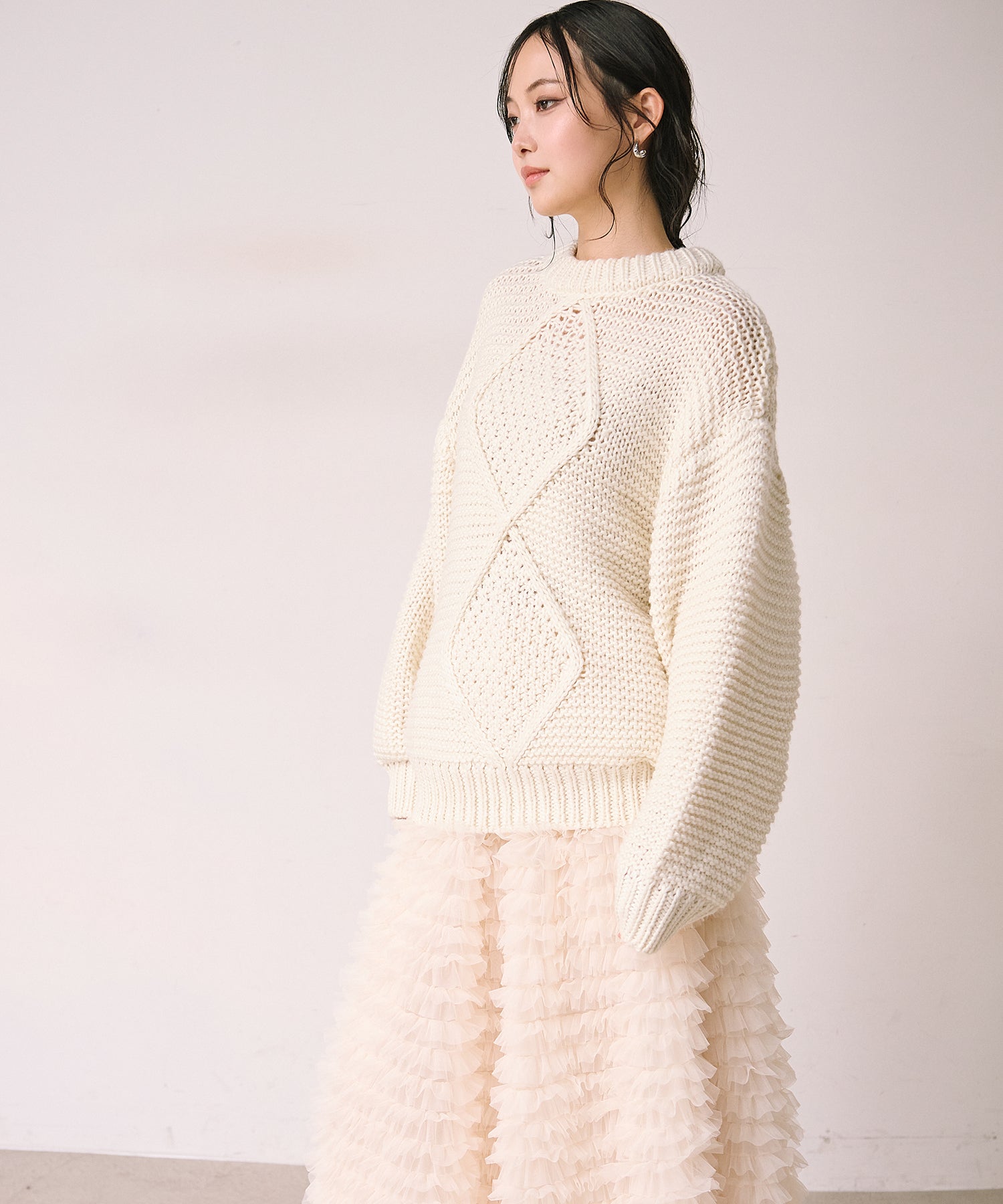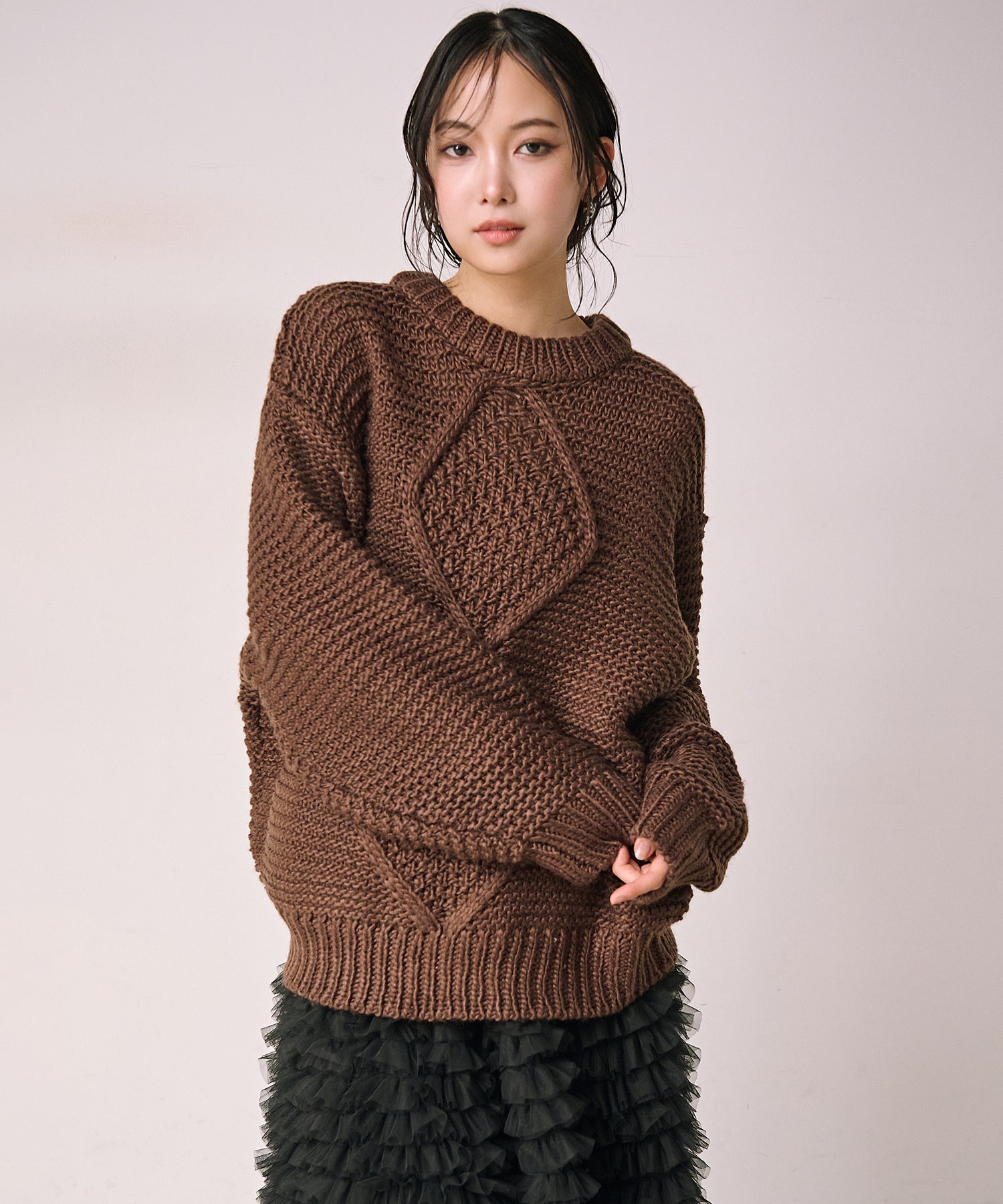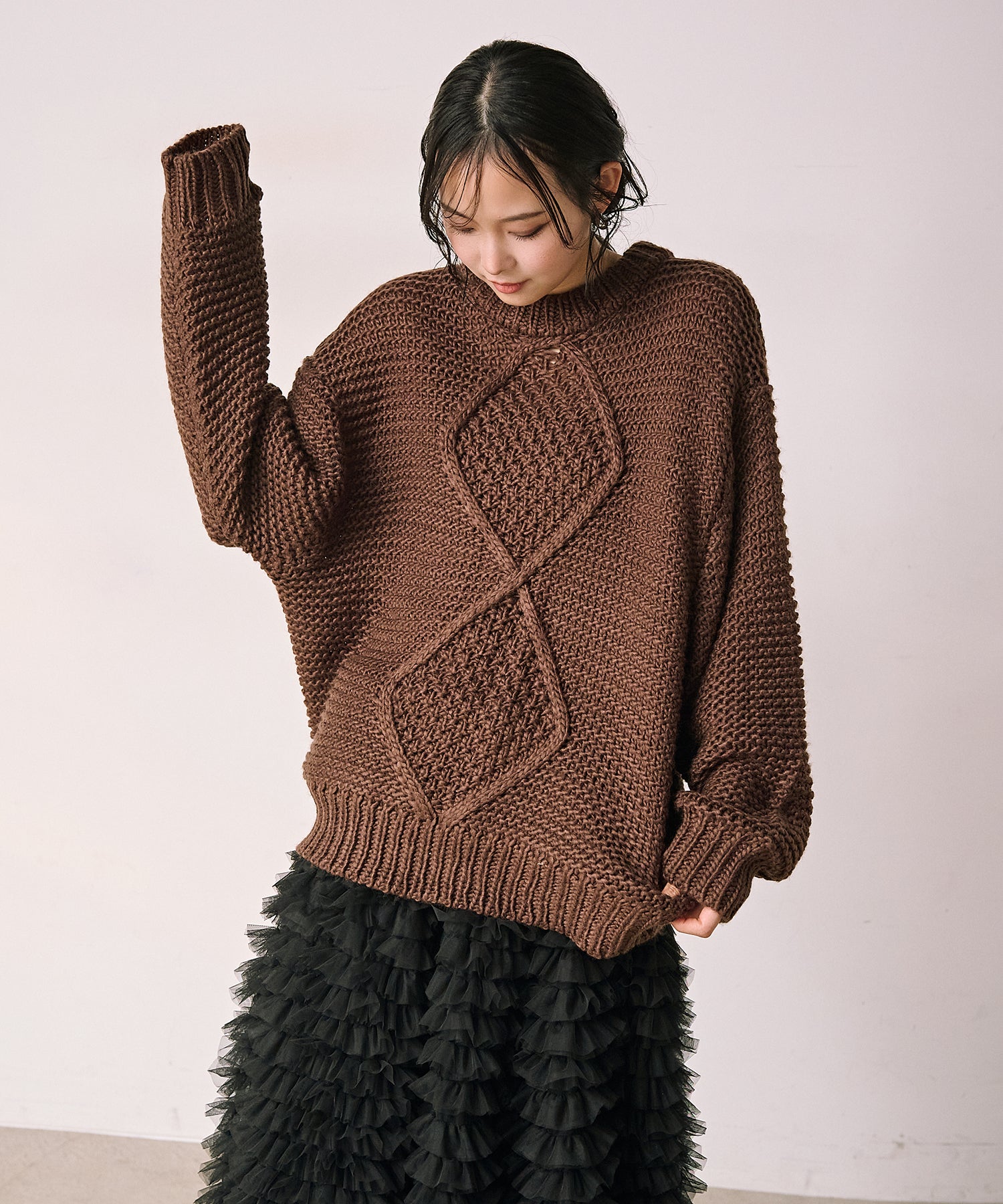 立体感のあるアーガイル編みが目を引く、存在感たっぷりのニットプルオーバー。
