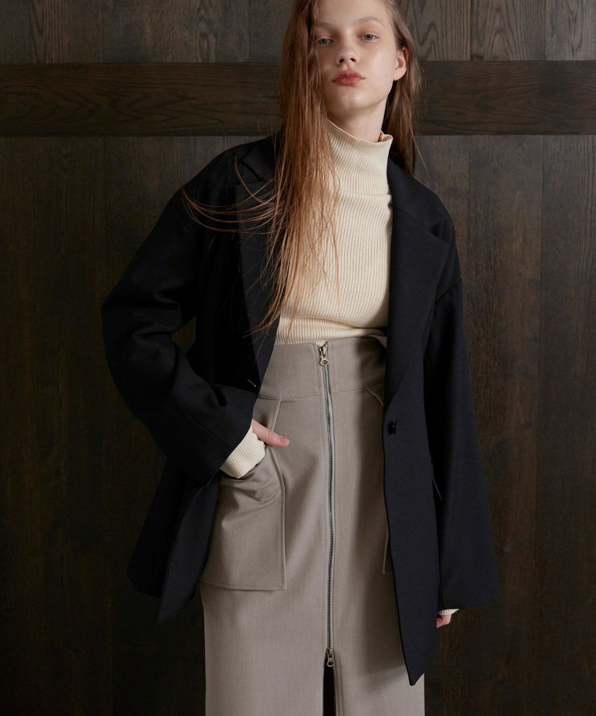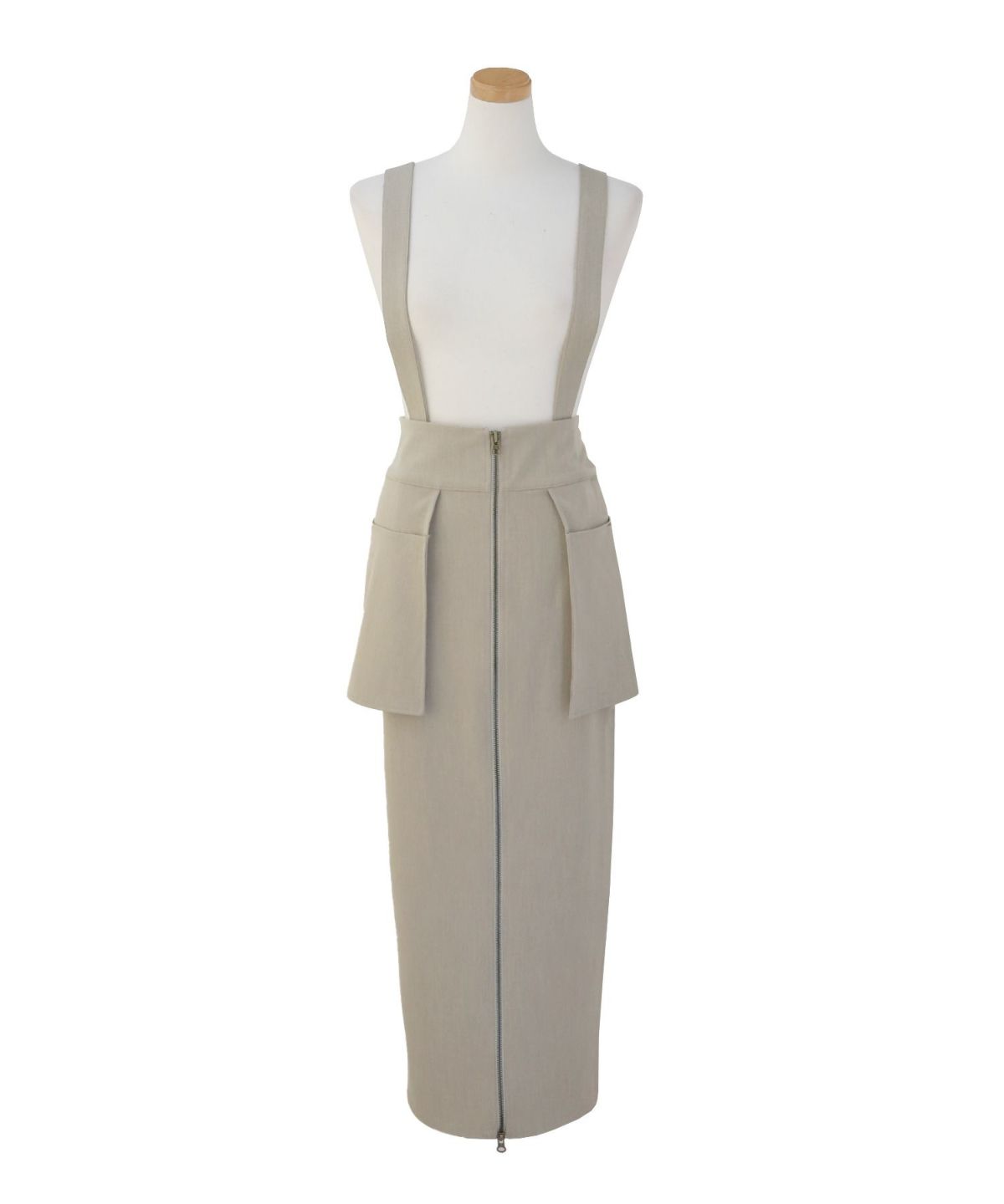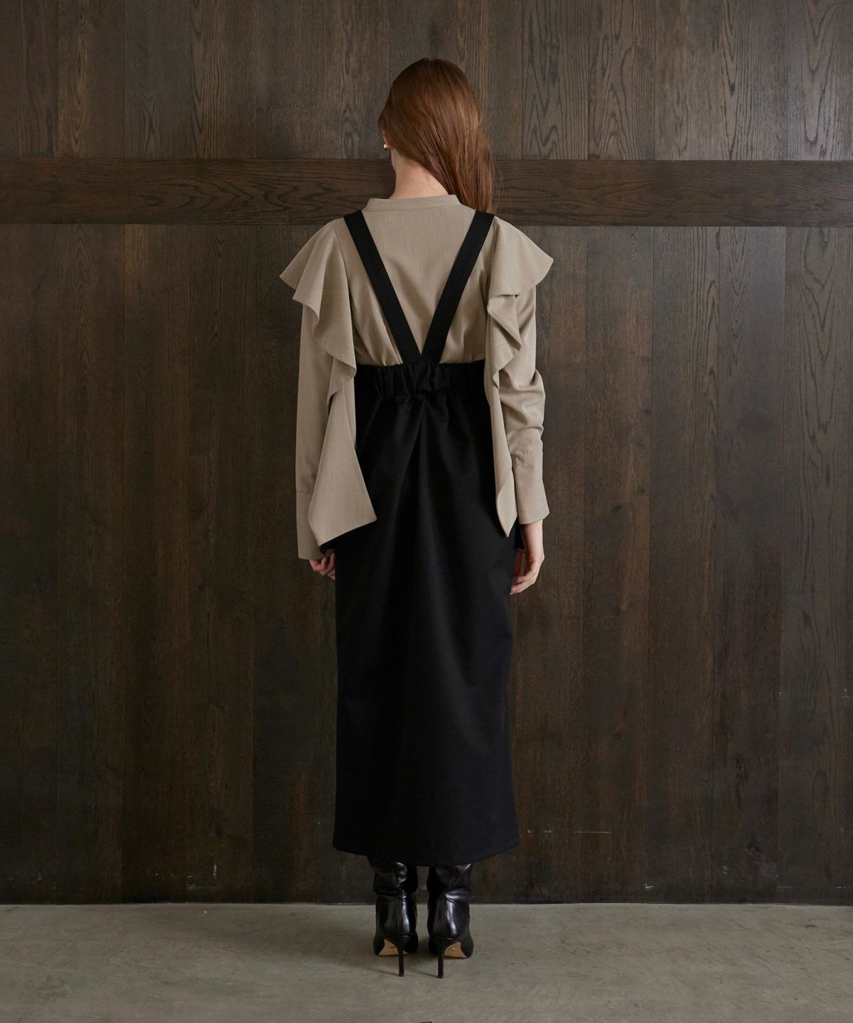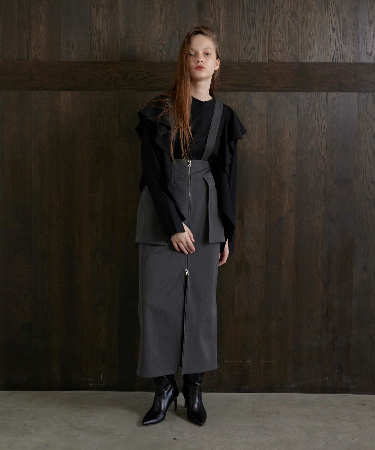サスペンダーは取り外し可能のため、そのままペンシルスカートとしてはもちろん、裾のジップを開けてスリットを入れるなどお好みのスタイリングでオールシーズンお楽しみいただけます。