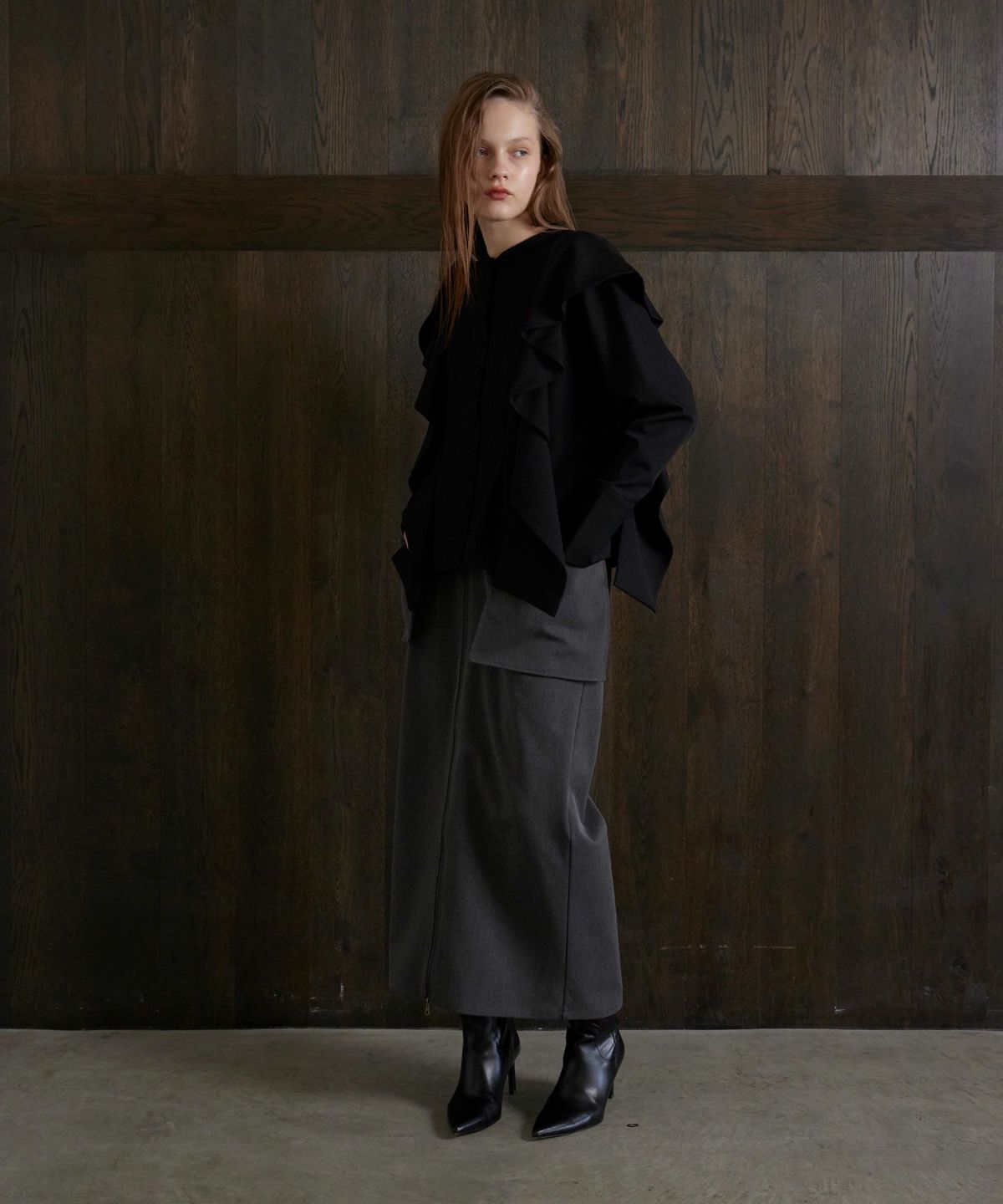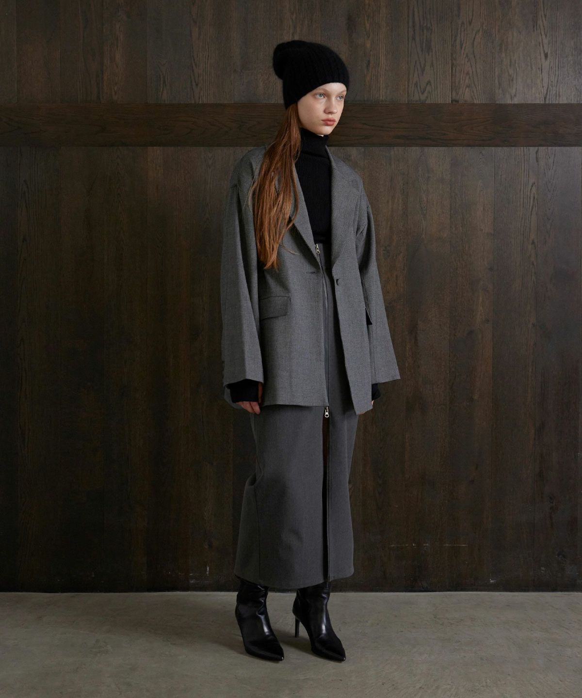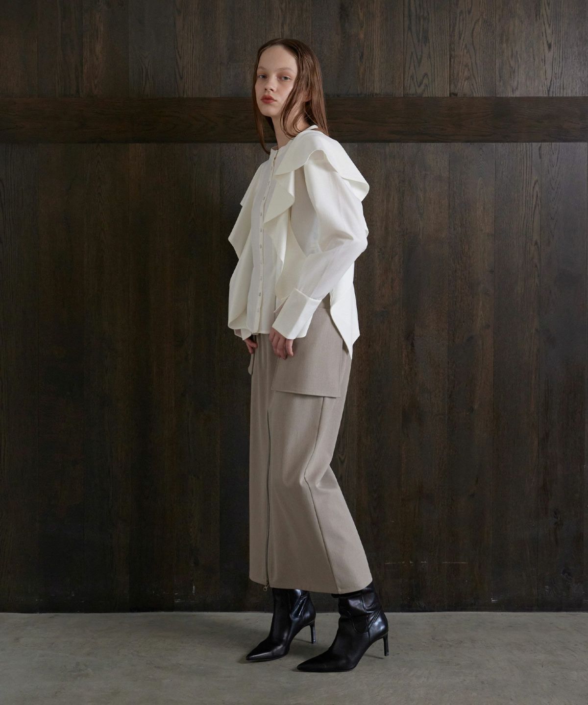 サスペンダーは取り外し可能のため、そのままペンシルスカートとしてはもちろん、裾のジップを開けてスリットを入れるなどお好みのスタイリングでオールシーズンお楽しみいただけます。