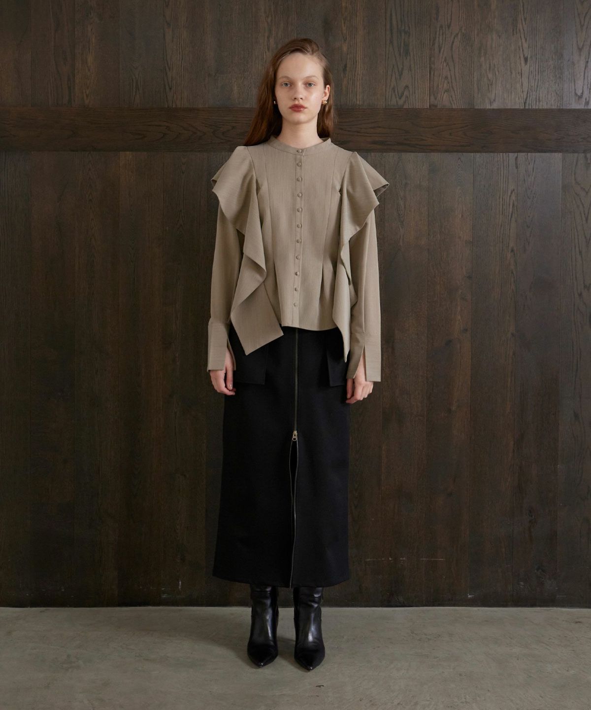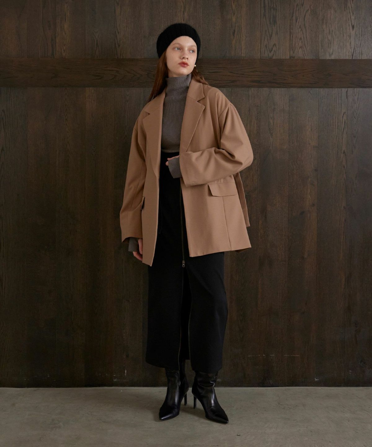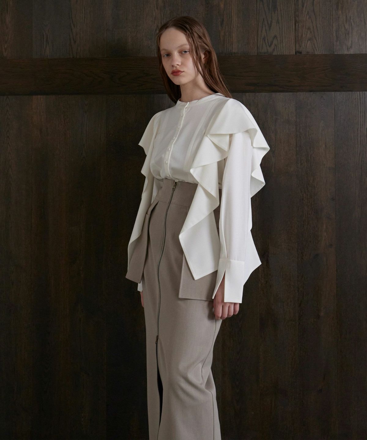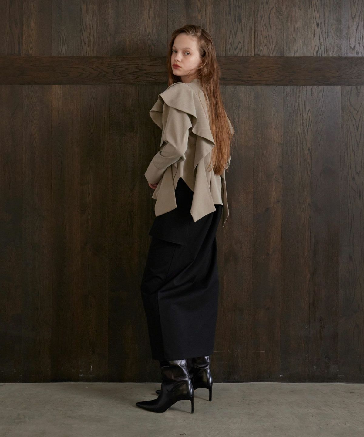 サスペンダーは取り外し可能のため、そのままペンシルスカートとしてはもちろん、裾のジップを開けてスリットを入れるなどお好みのスタイリングでオールシーズンお楽しみいただけます。