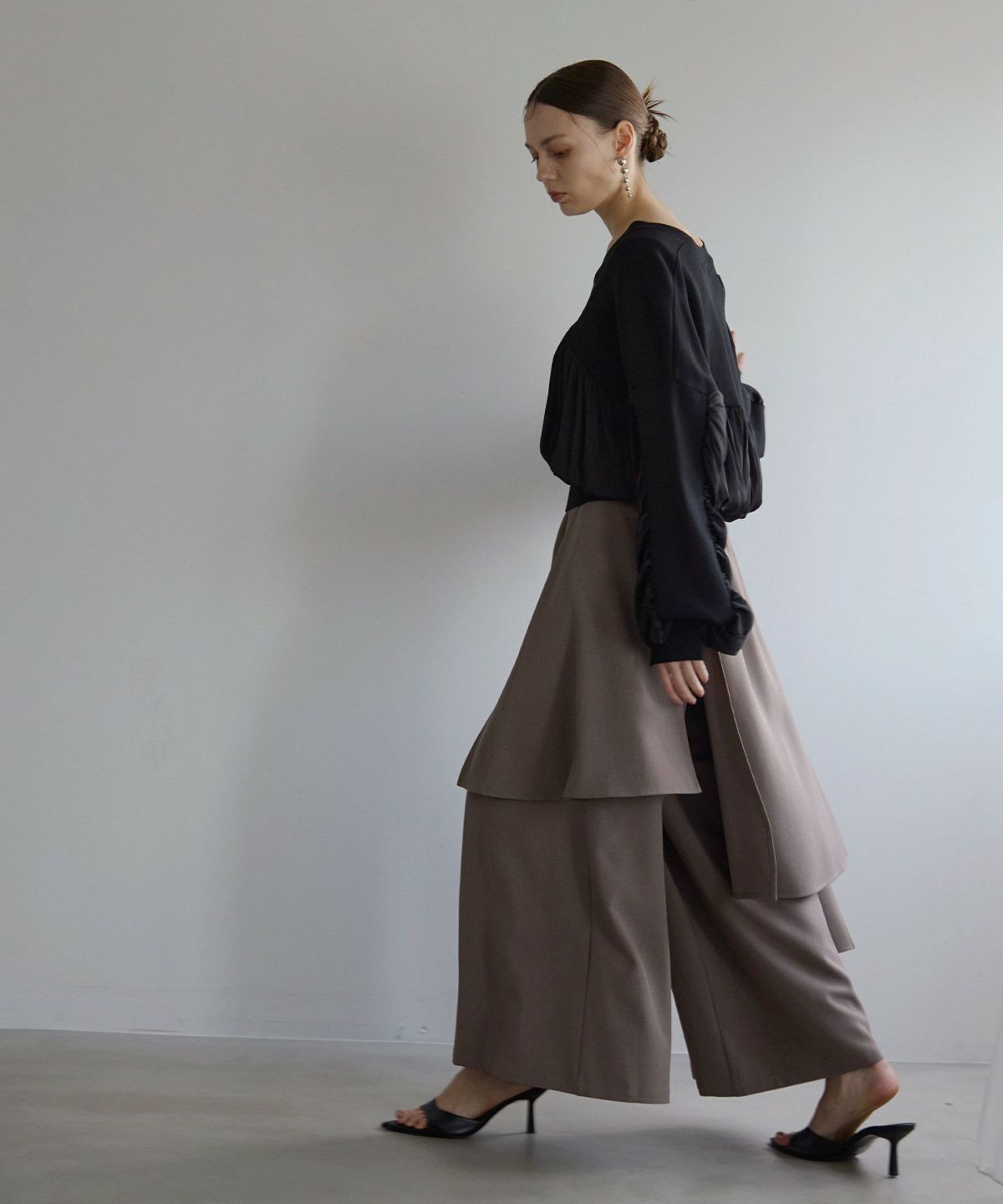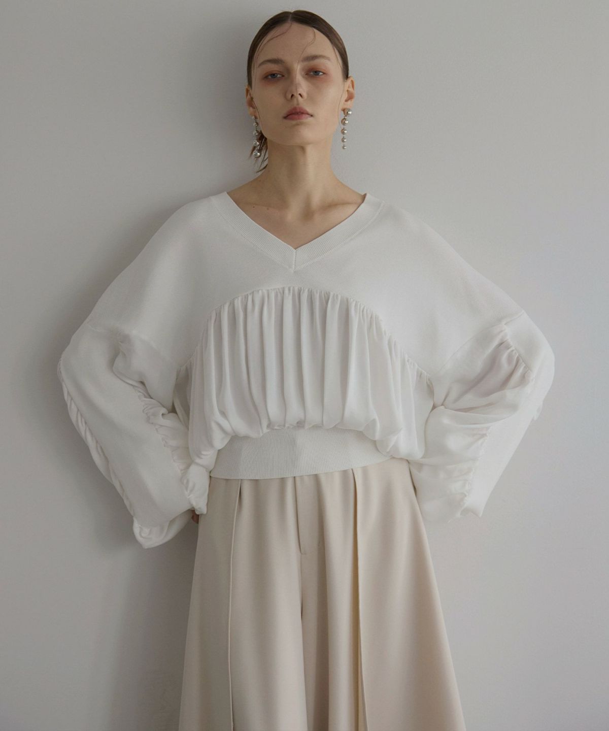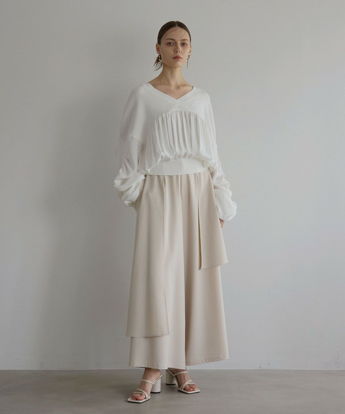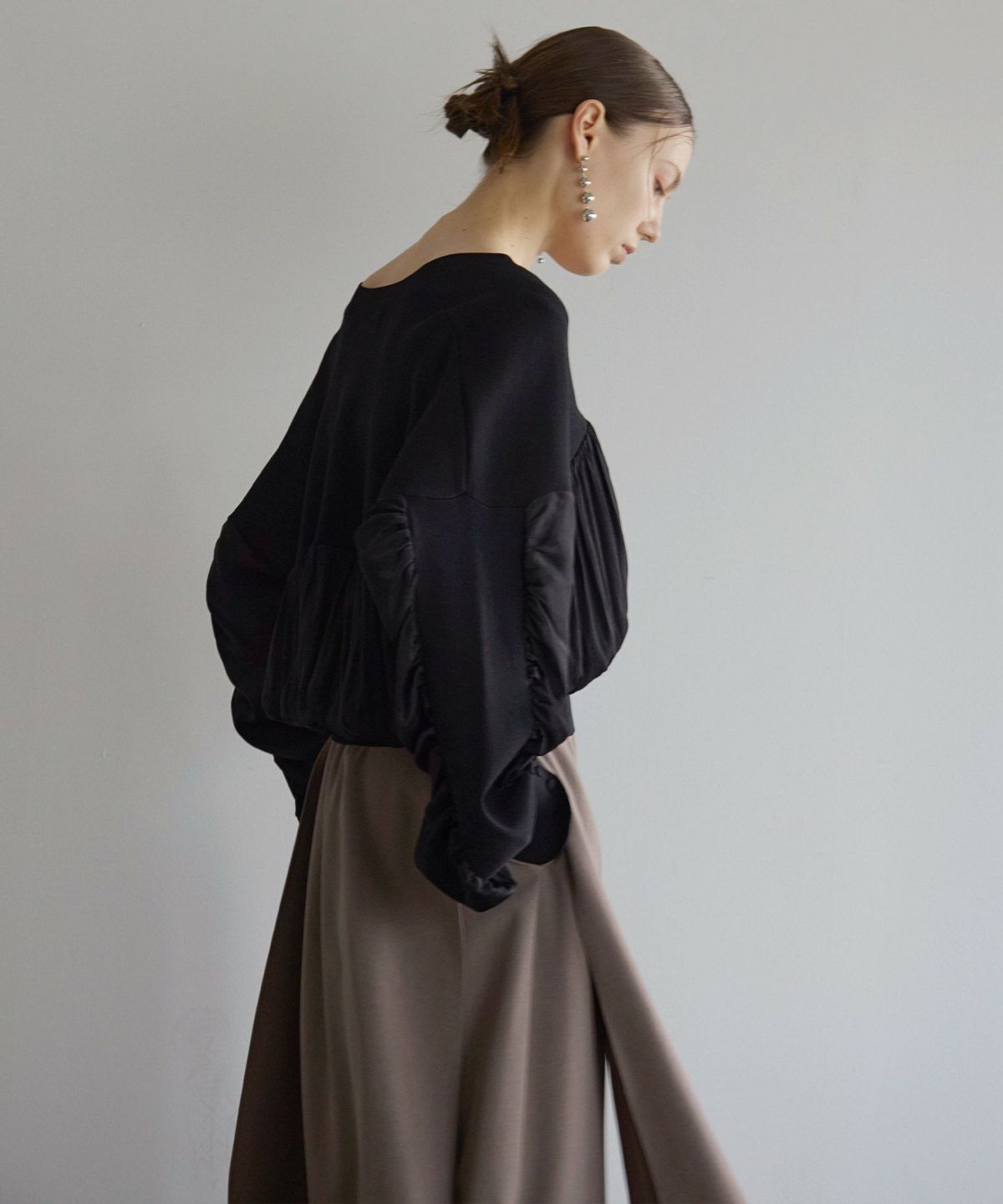 したたり落ちるようなたっぷりのギャザーは美しい立体感を表現し、ゆるりとざっくり着れるシルエットで、季節の変わり目や半端な時期にデイリー使いしやすい仕上がりとなっております。