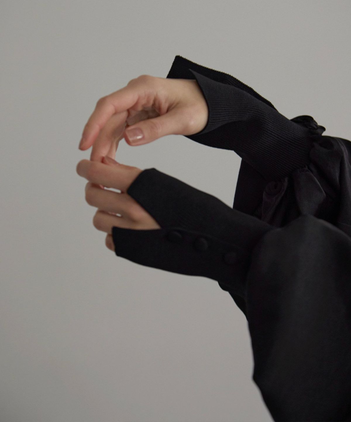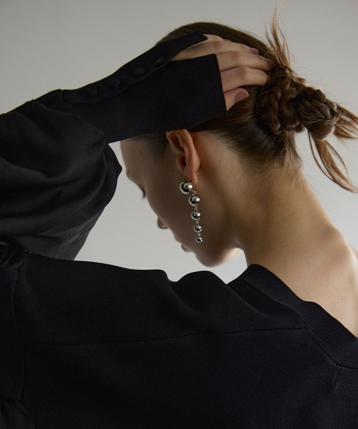 スウェットアイテムのようなスポーティさをイメージした太めのネックラインに、手首や手先が華奢にキレイに見えるボタンつきのロングリブカフスで、カジュアルさを抑えてくれるバランスに。