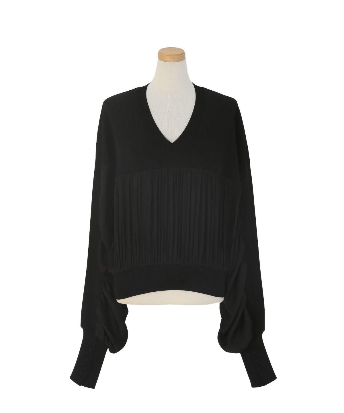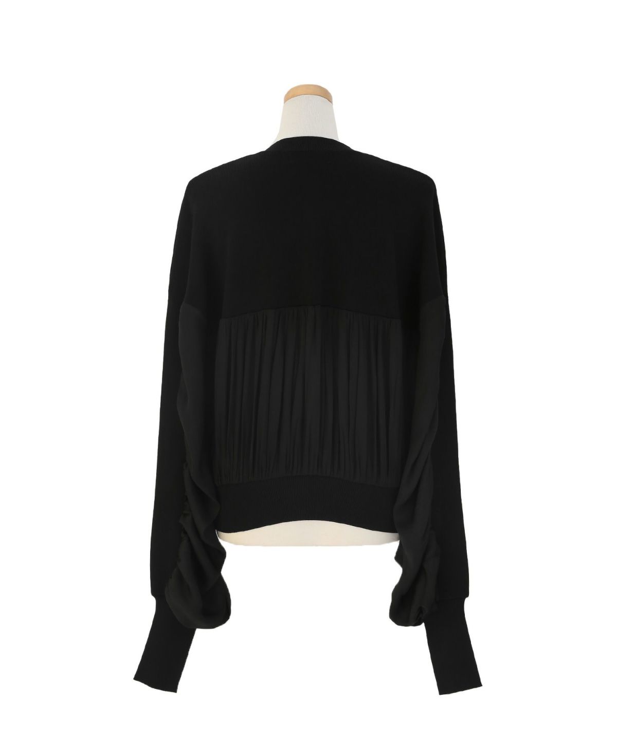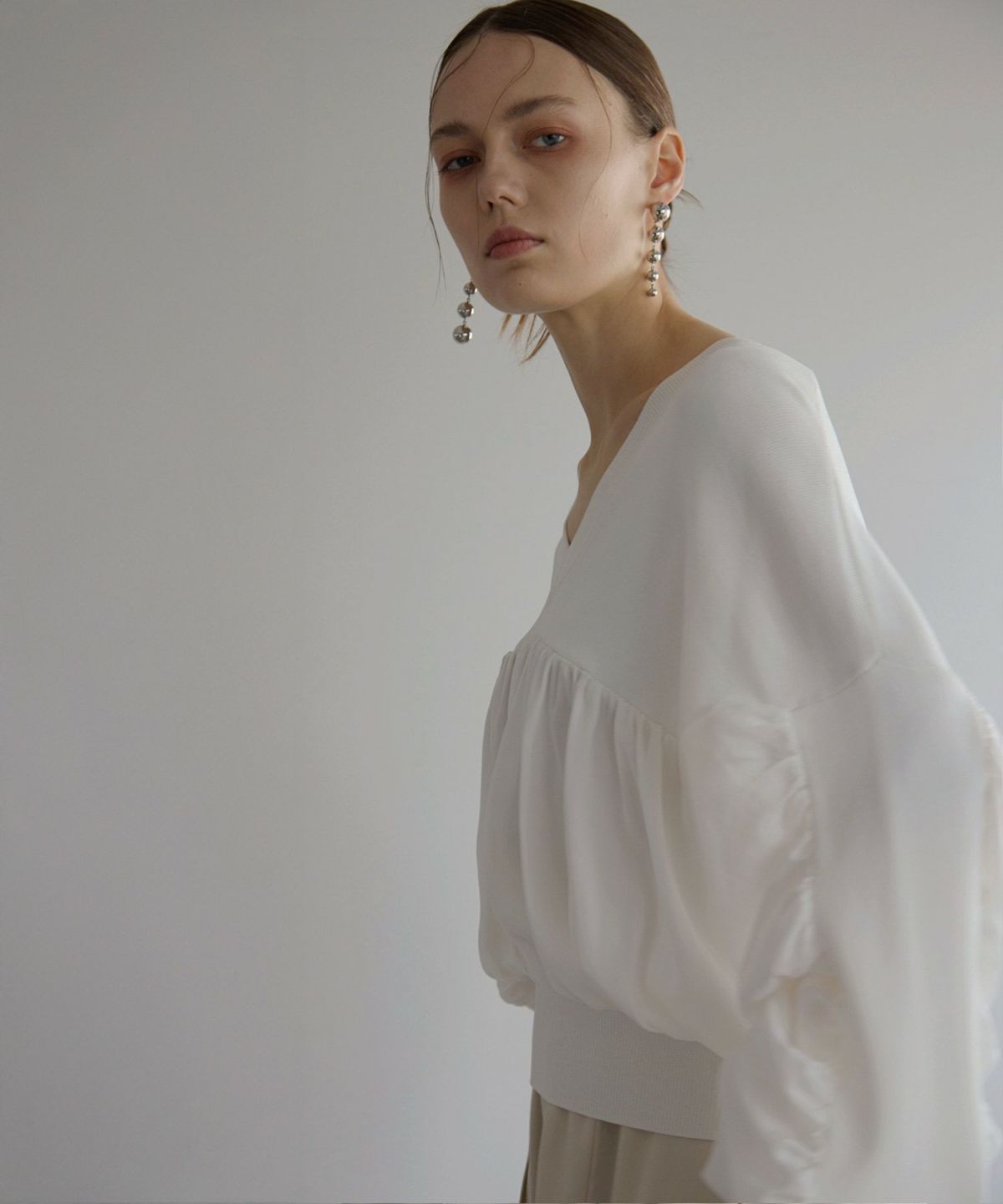 さらりとした質感のサマーニットと、しっとりとろみのあるサテン素材をドッキングさせた異素材アイテム。