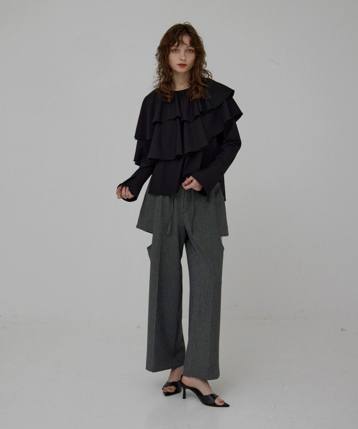 ゆらりと揺れるアシンメトリーに重なったケープカラーは、ドレープ感がとても美しく、前後左右で色んな表情を見せてくれます。