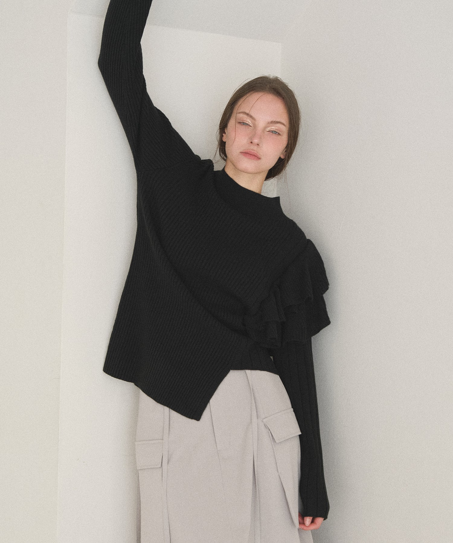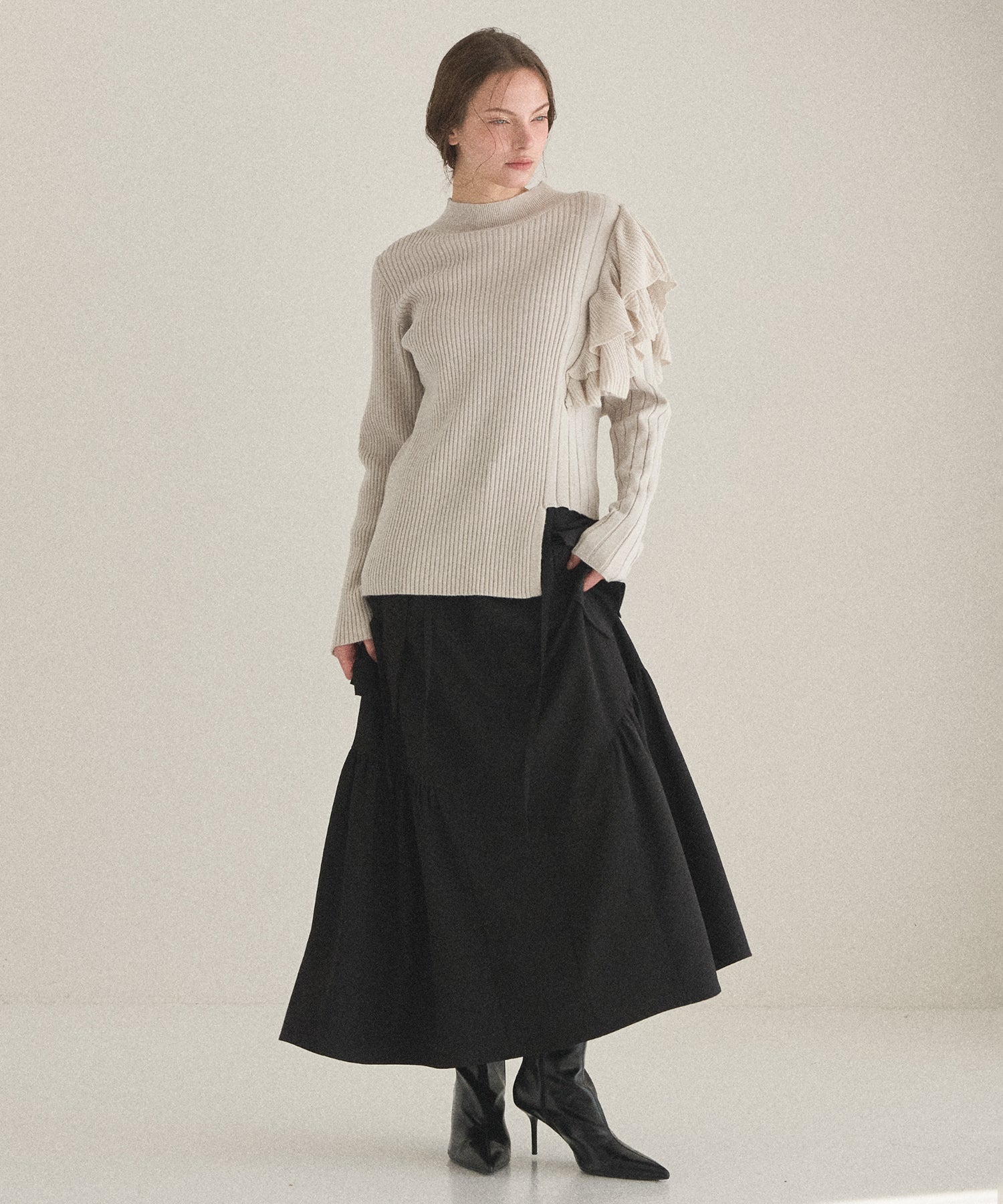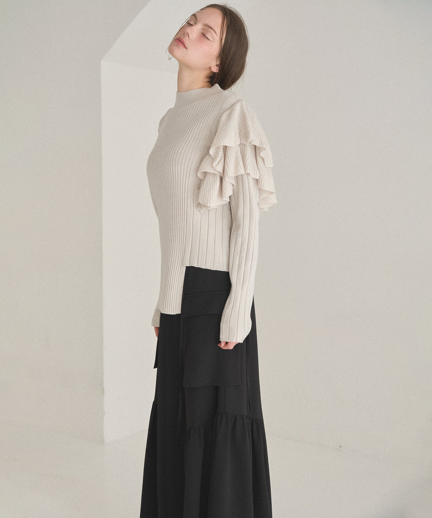大振りのフリル、ピッチ違いのリブ、丈違いなどMIELIらしいアシンメトリーディティールがアクセントになった、人気のデザインニットが新色追加で登場です。