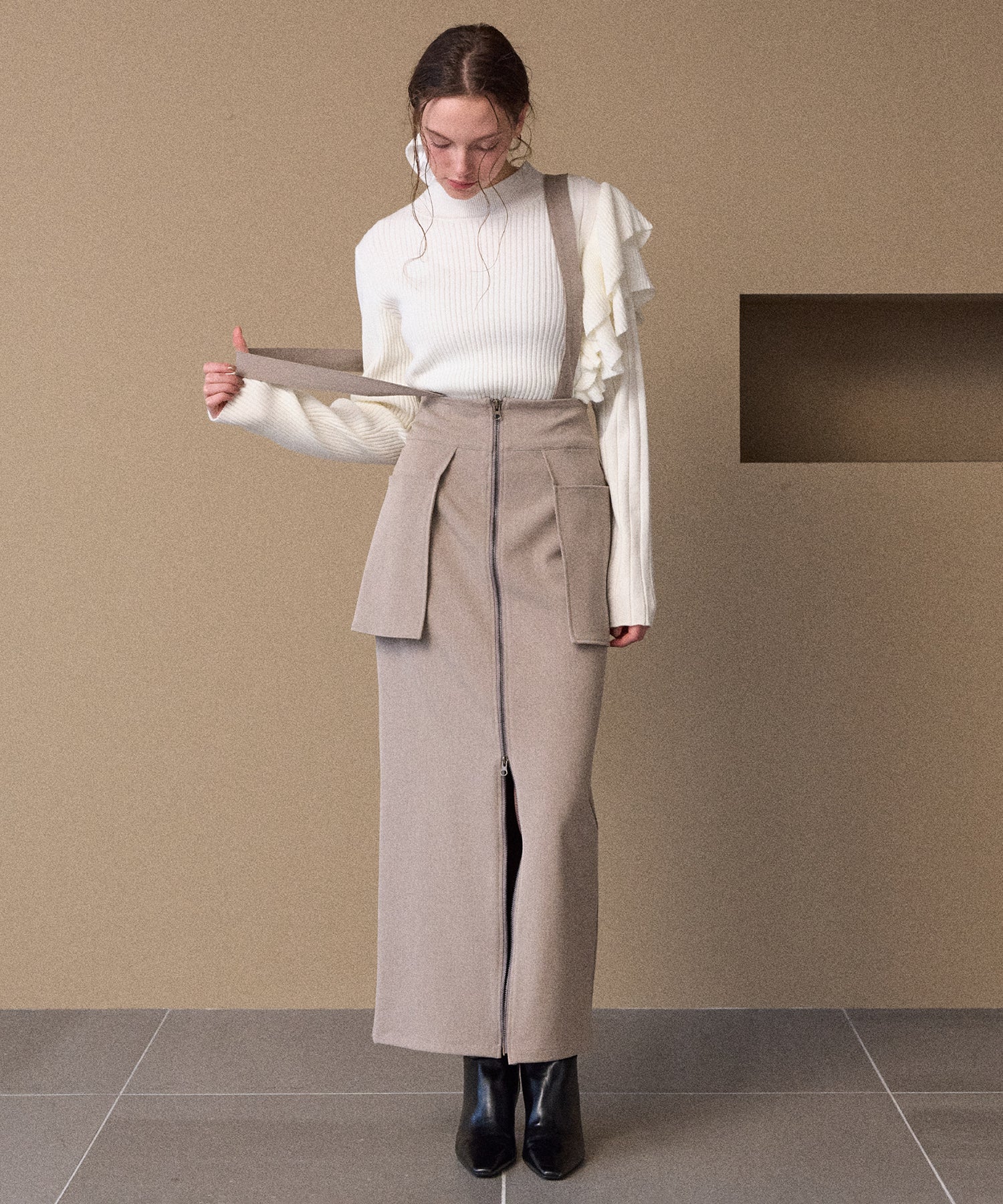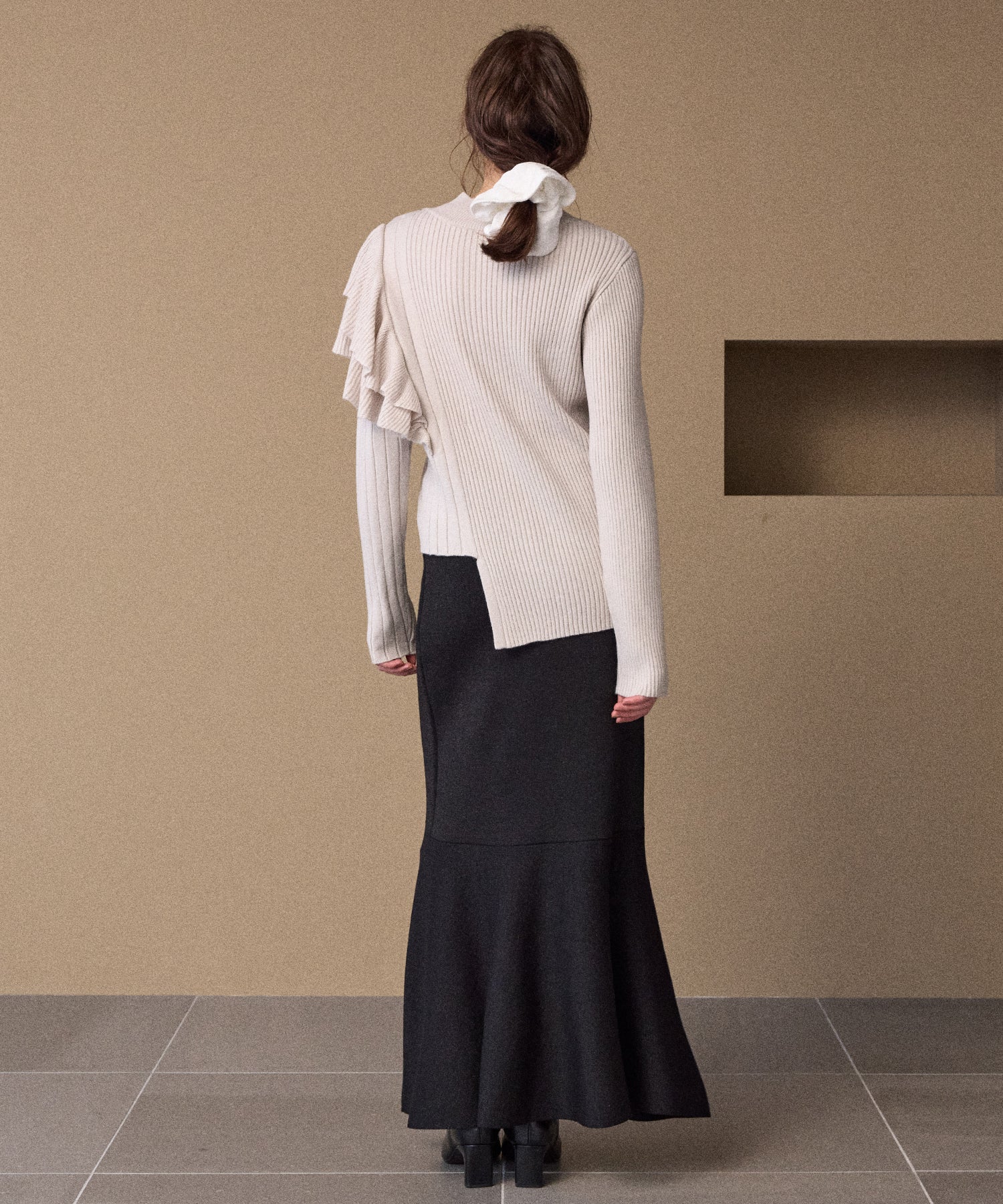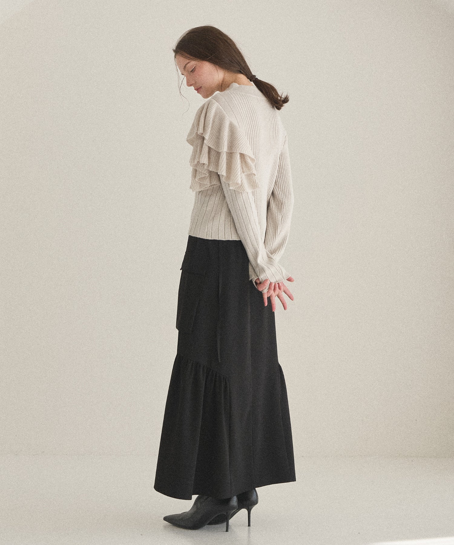 大振りのフリル、ピッチ違いのリブ、丈違いなどMIELIらしいアシンメトリーディティールがアクセントになった、人気のデザインニットが新色追加で登場です。