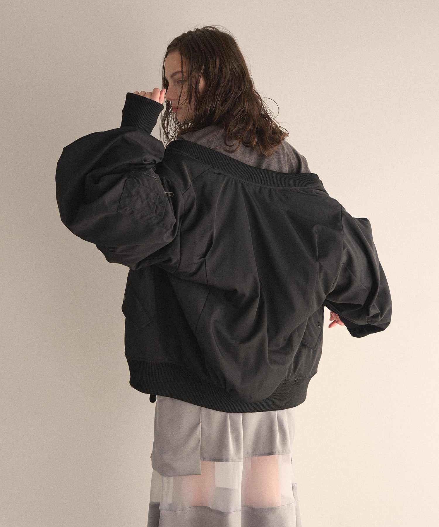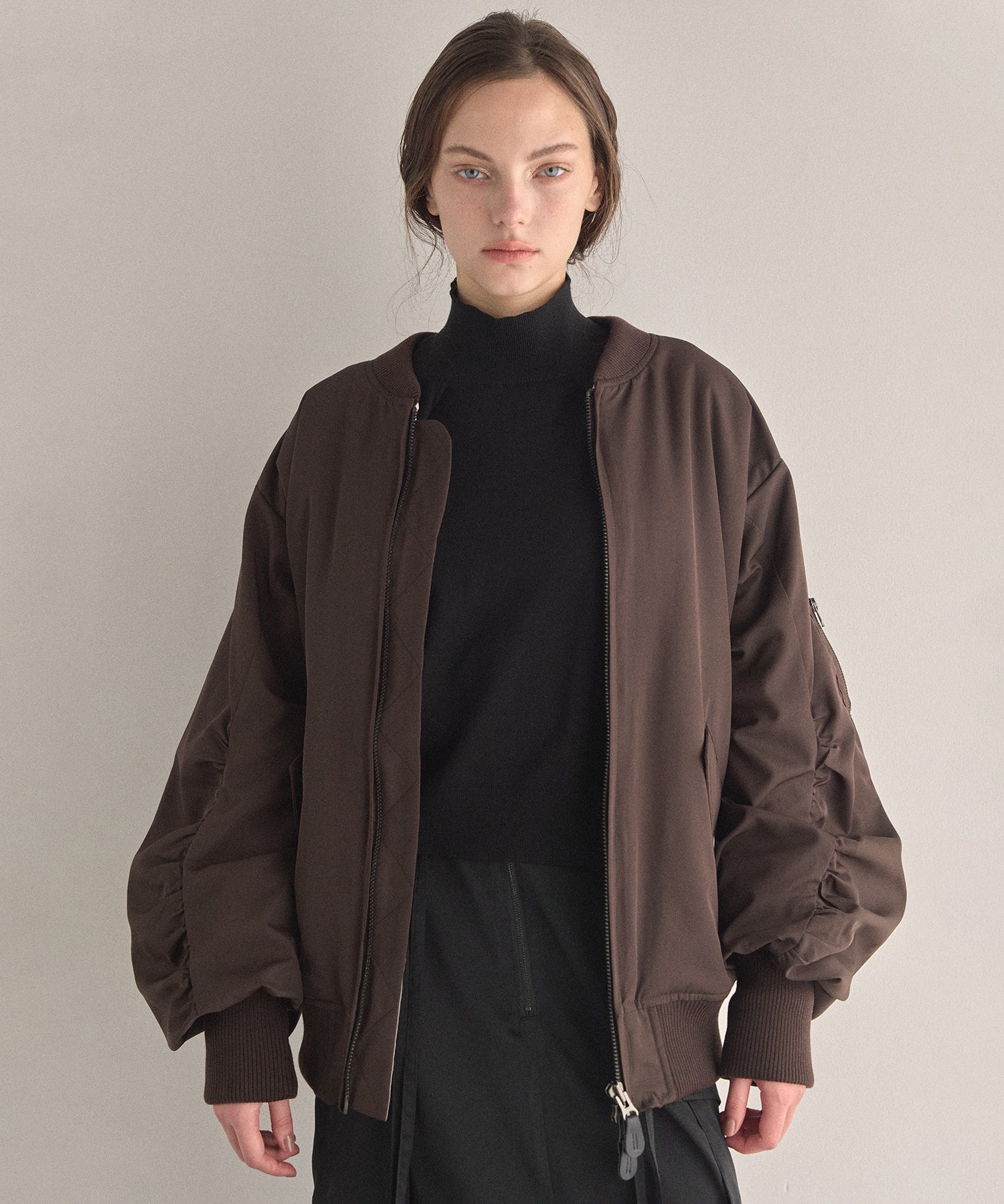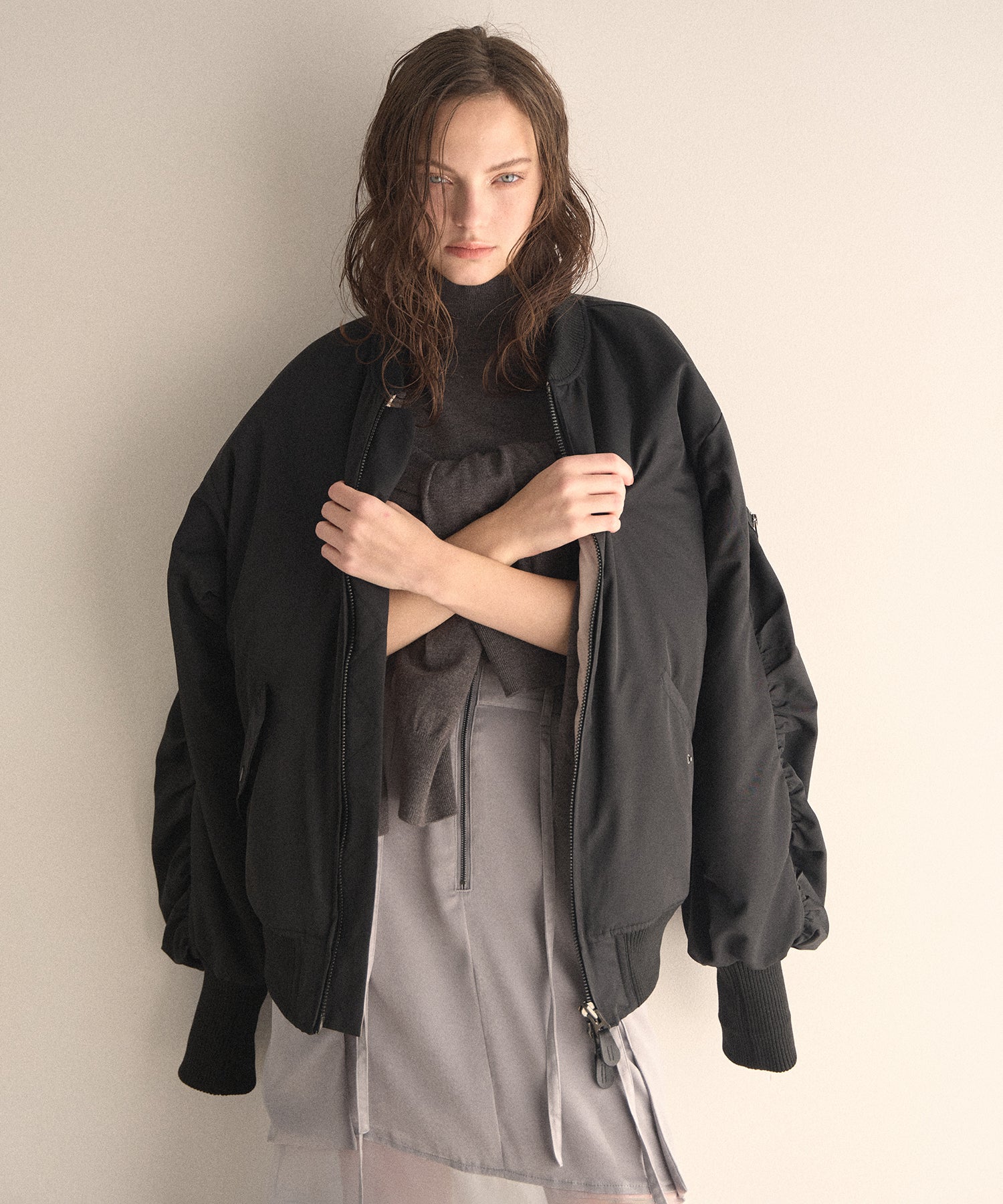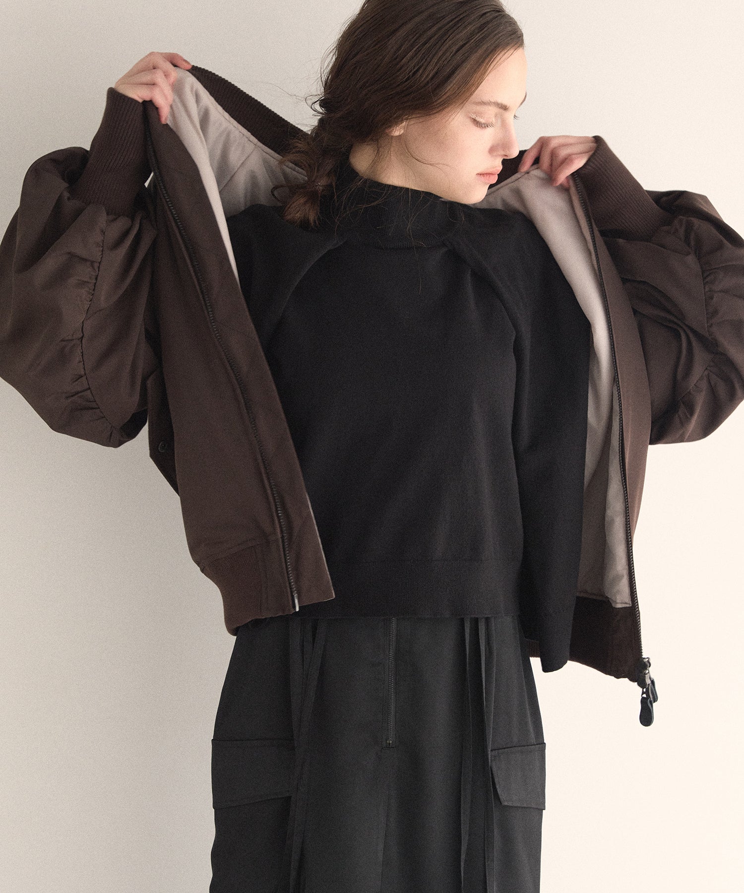マシュマロのようなさらふわでエアリーマットな質感が、カジュアルさを抑えてくれるスタイリッシュな印象がMIELIらしいMA-1から、今年はブラウンが仲間入りです。