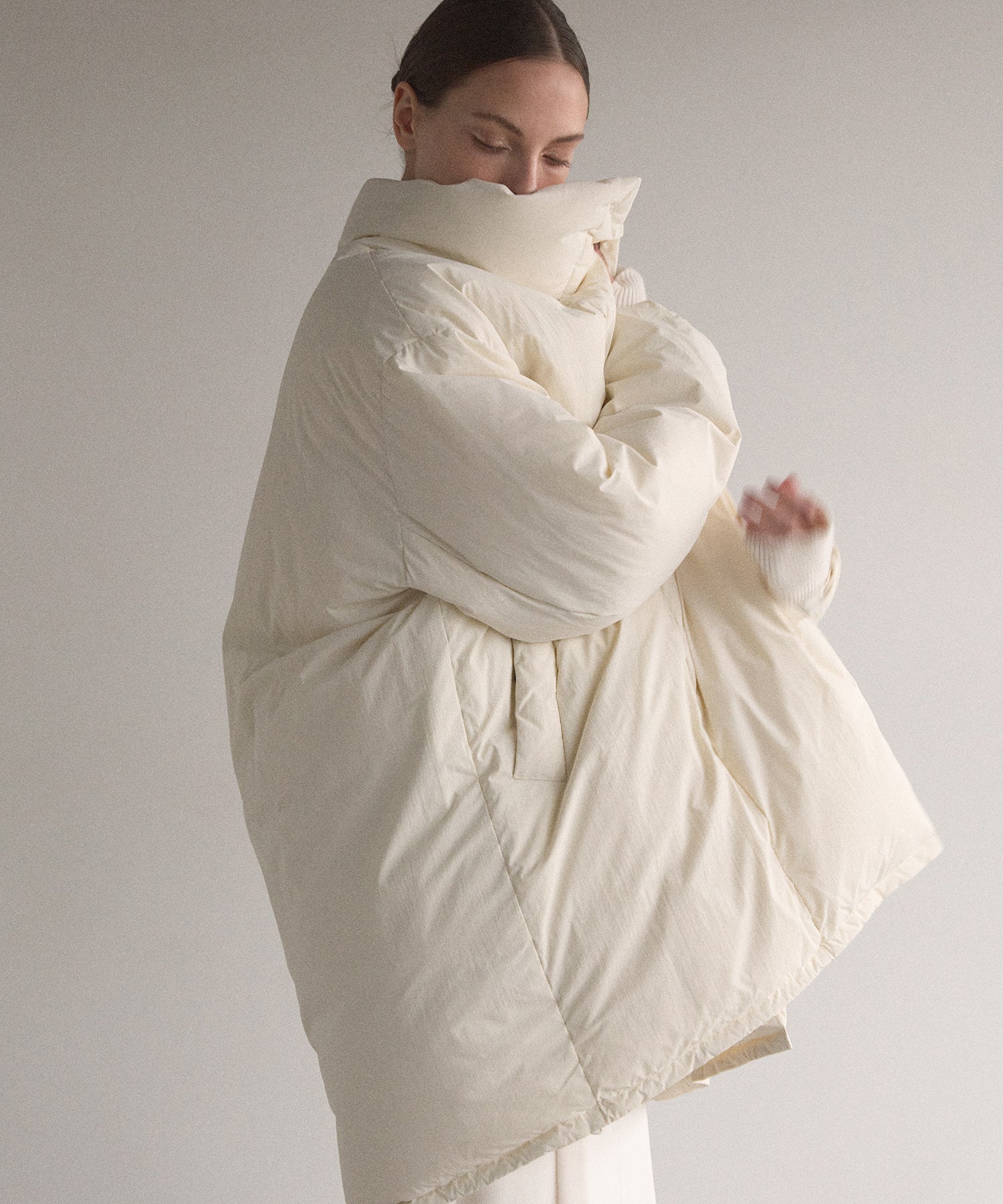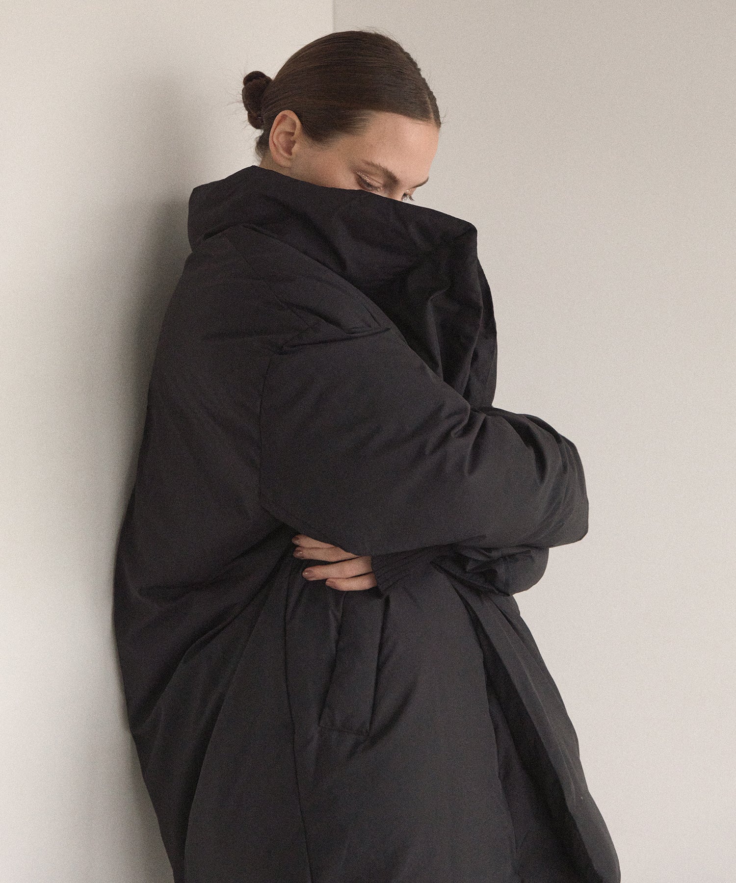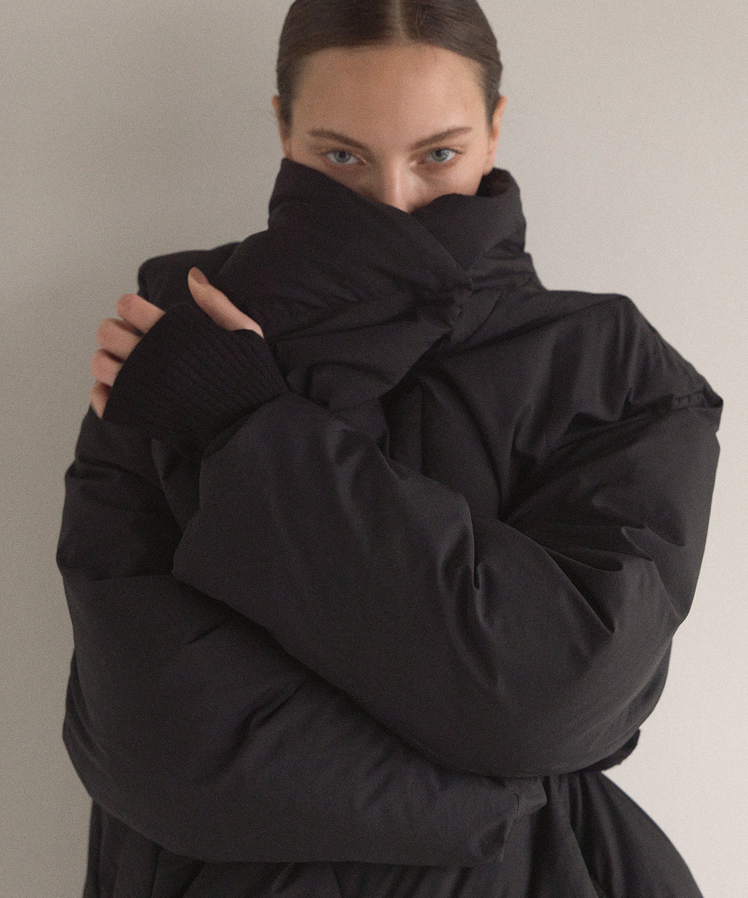 お好みで裾に付いたドロストを絞ってバルーンシルエットにアレンジしても着用いただける、冬のスタイリングに映えるアウターとなっております。