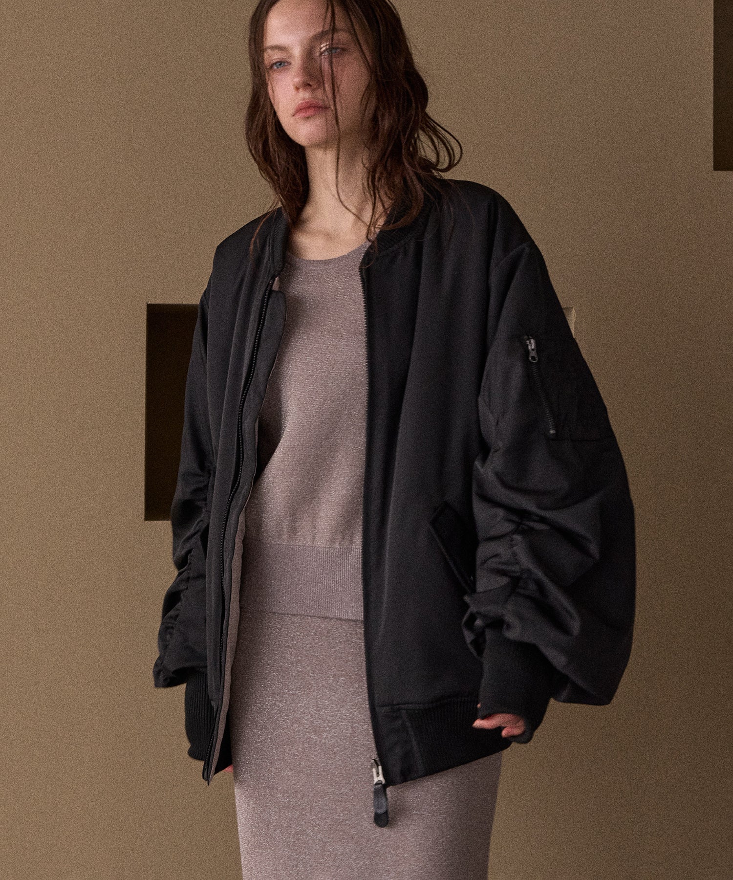 マシュマロのようなさらふわでエアリーマットな質感が、カジュアルさを抑えてくれるスタイリッシュな印象がMIELIらしいMA-1から、今年はブラウンが仲間入りです。