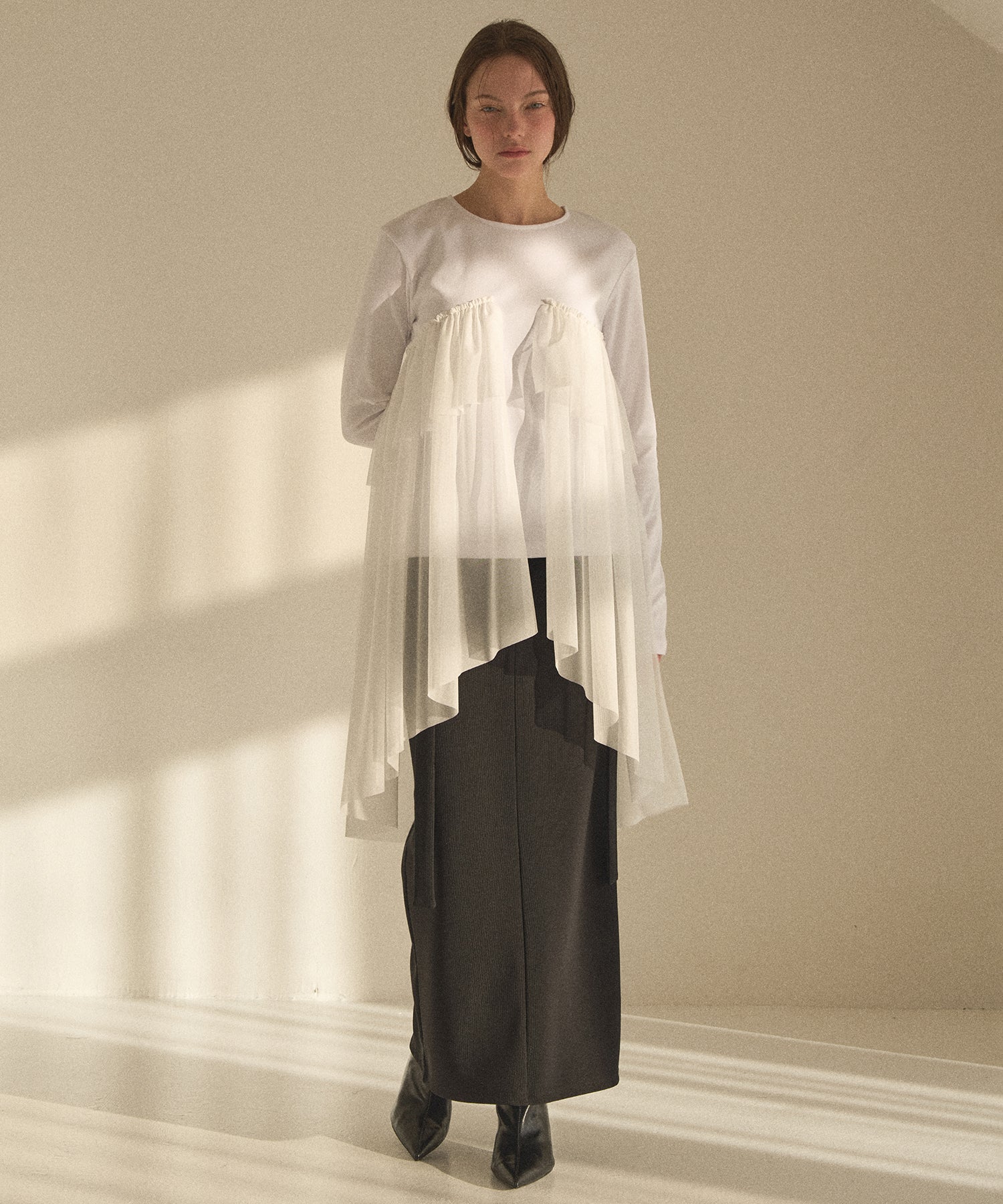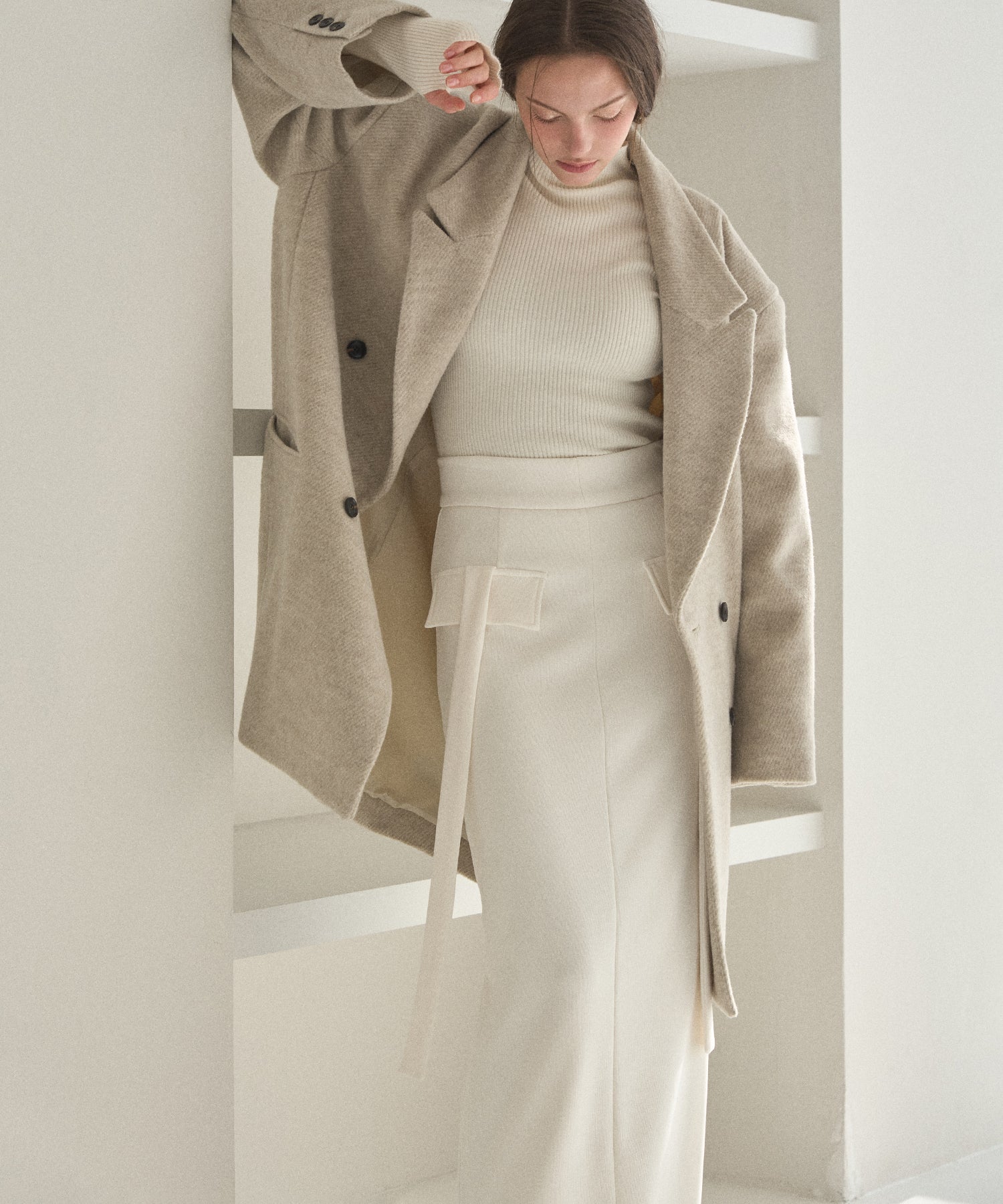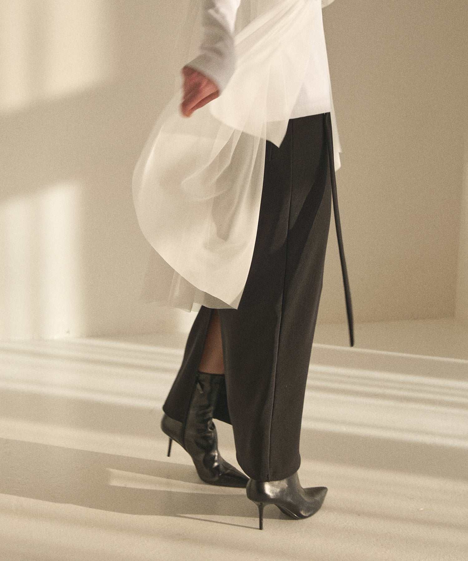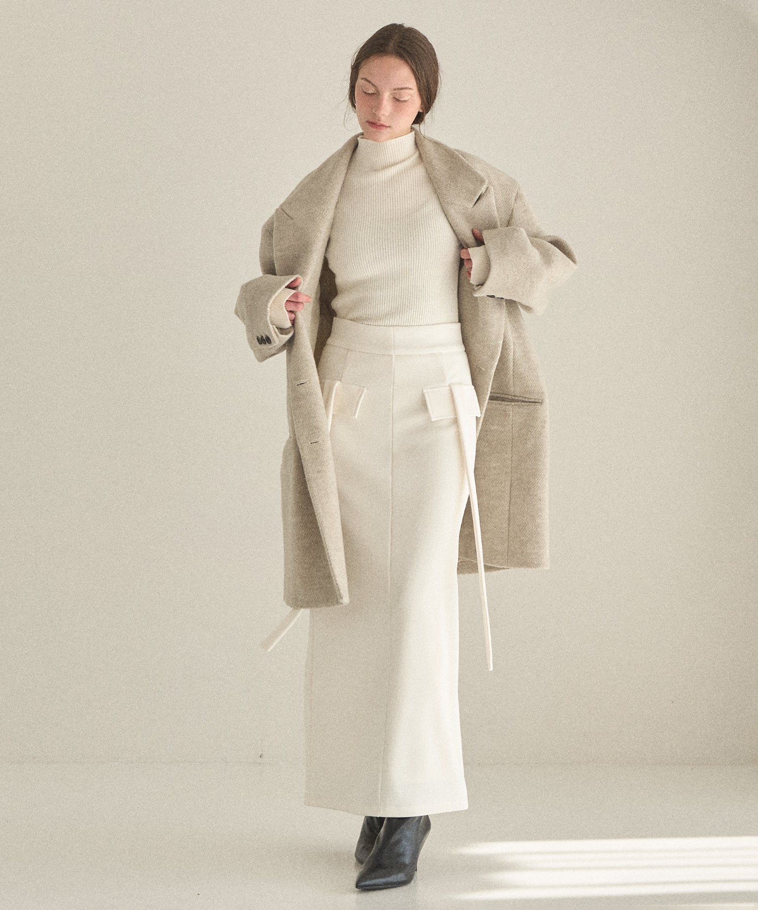 カーゴパンツから着想を得てMIELIらしいストラップディティールと混合させた、シンプルながらもやり過ぎない一癖が効いたデザイン。