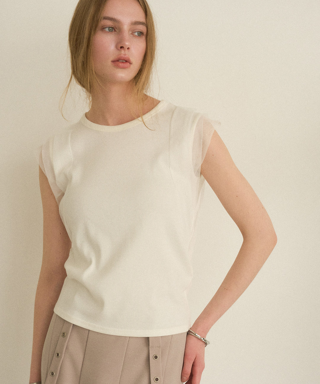 カットソーをベースにヘンリーネックのボタンディティールでカジュアル感を残しつつ、Vネックで抜け感と女性らしさ、斜めの切り替えからの異素材変形ペプラムにより、甘すぎないシャープな印象をバランス良く落とし込んだデザインロンT。