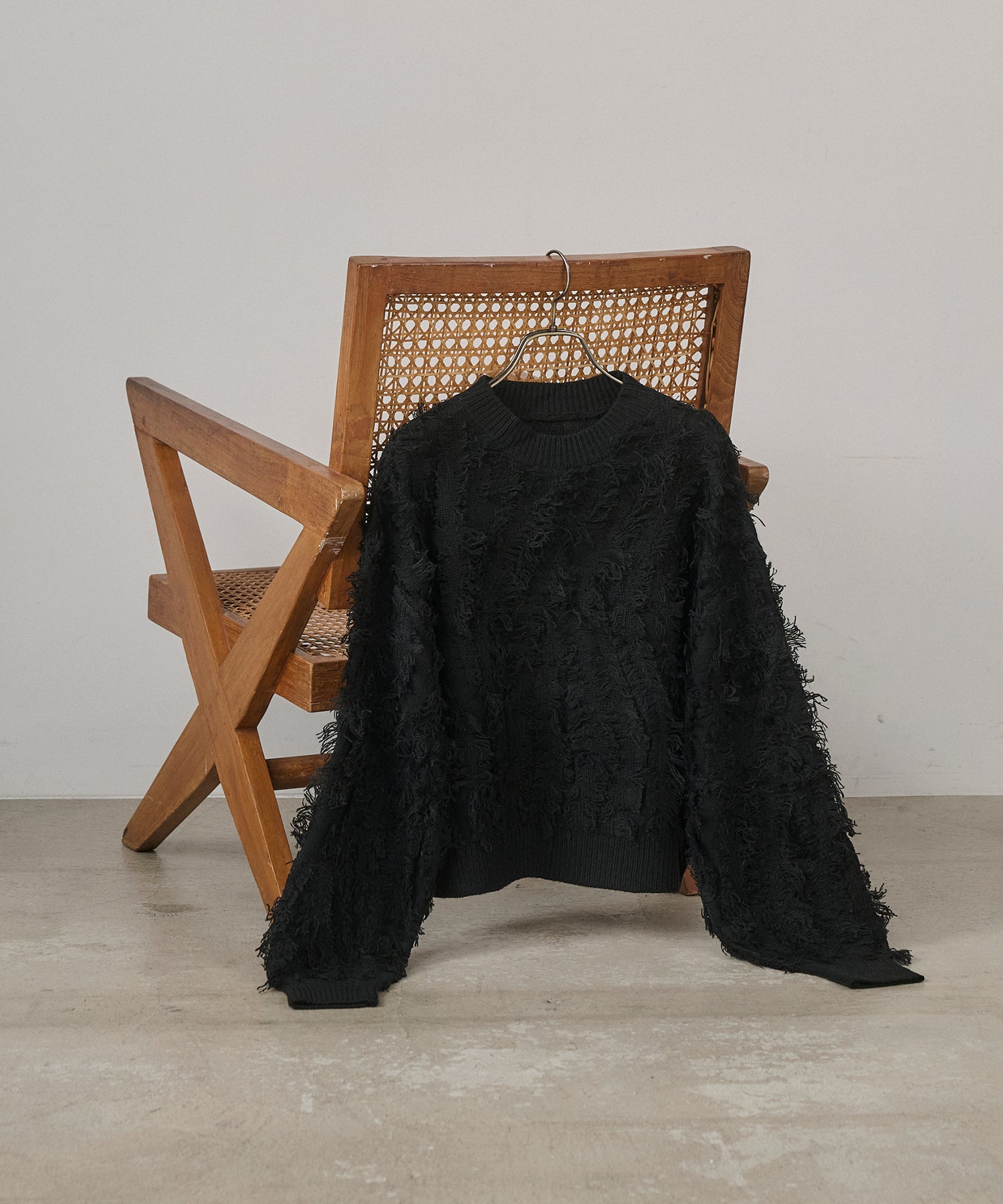 大胆なフリンジ編みが目を惹くパターンフリンジニットプルオーバー。