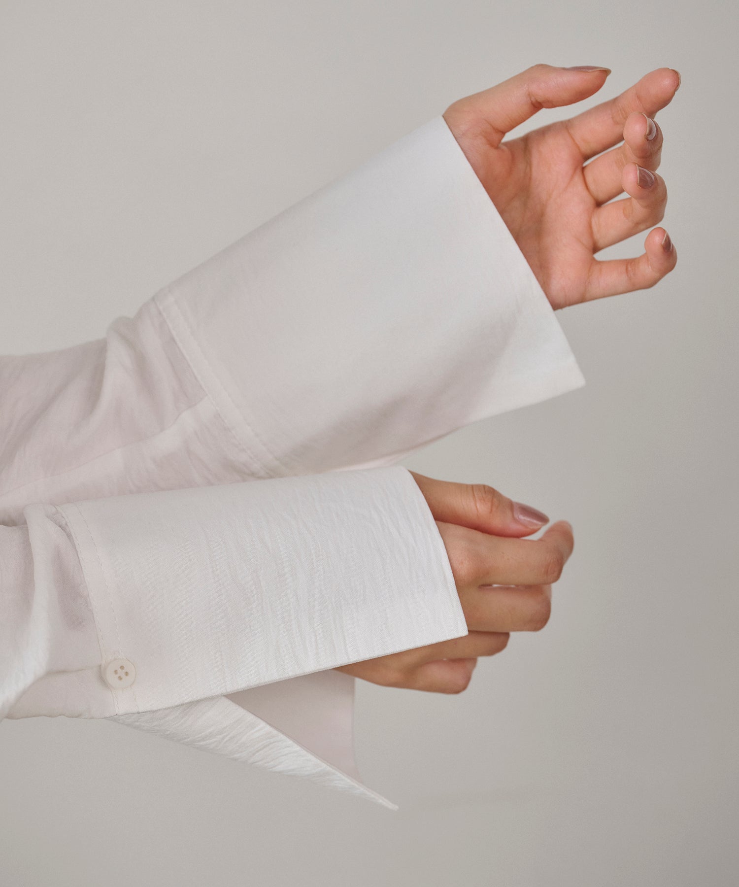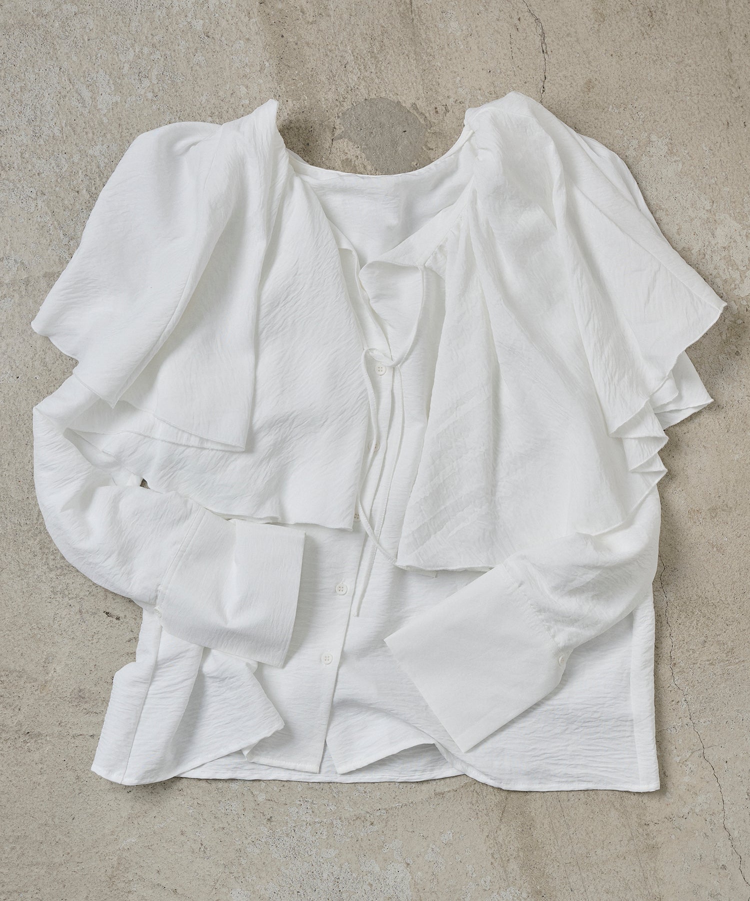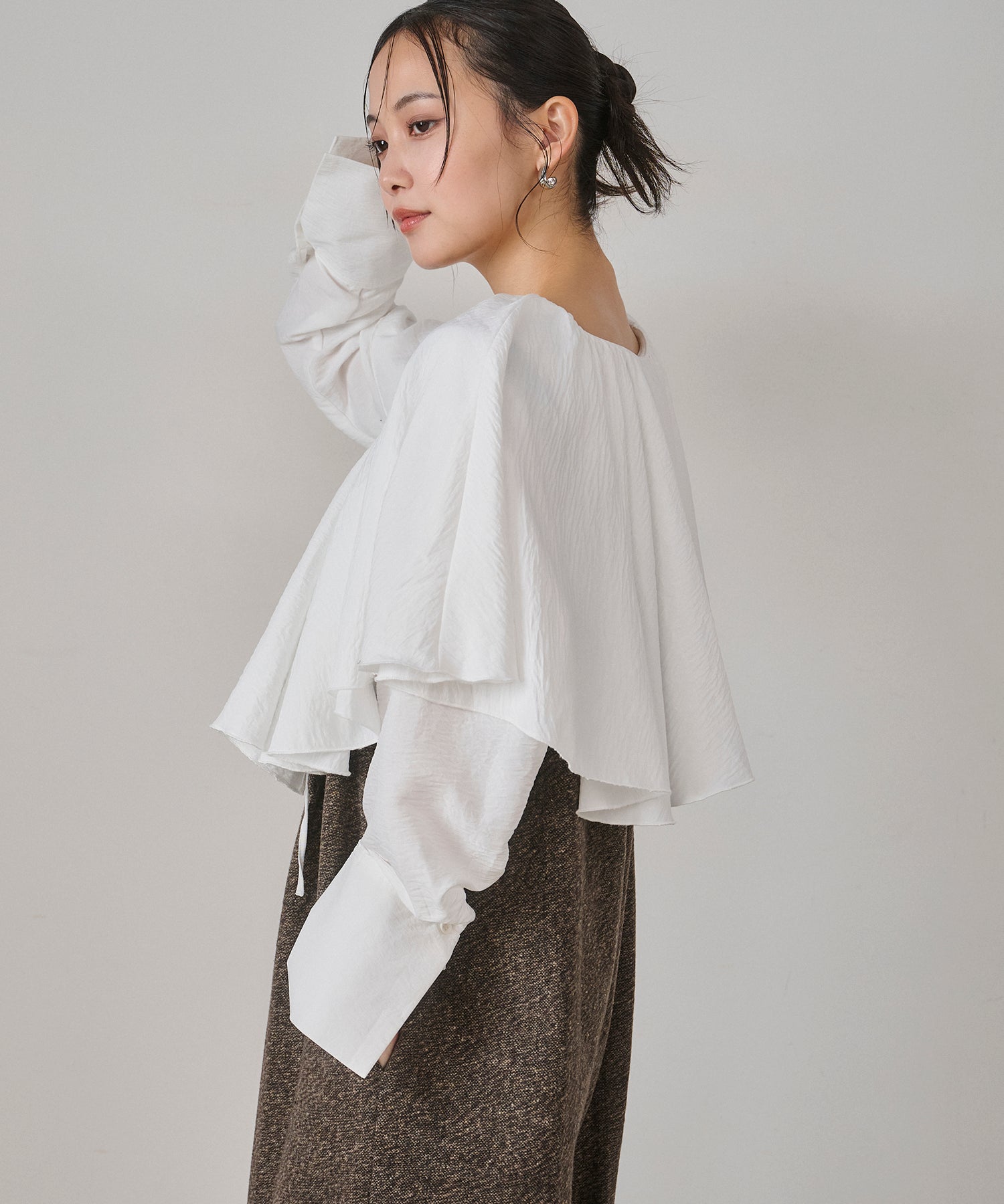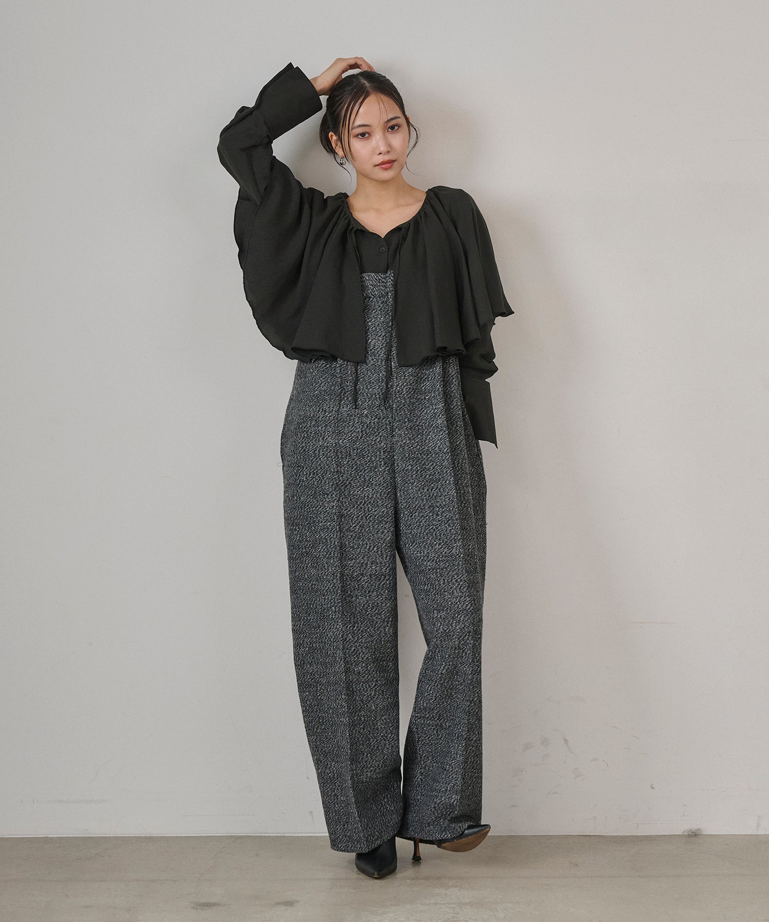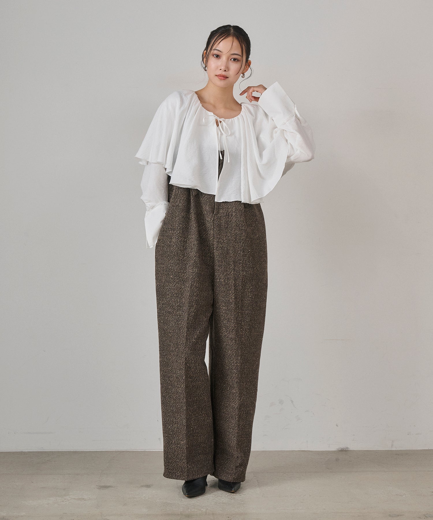 首元のリボンディテールが程よい甘さを添え、動くたびに揺れるシルエットが華やかさを演出します。